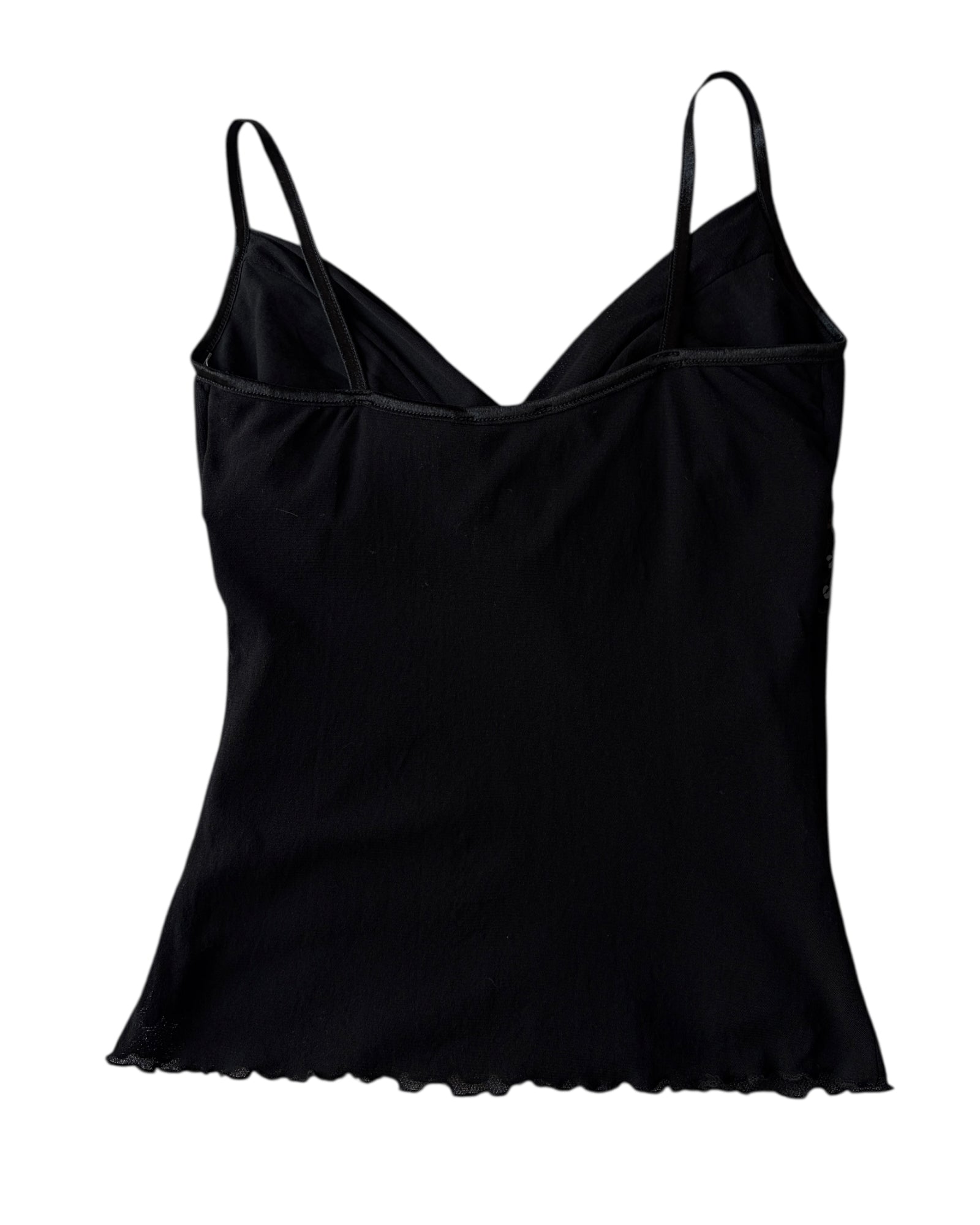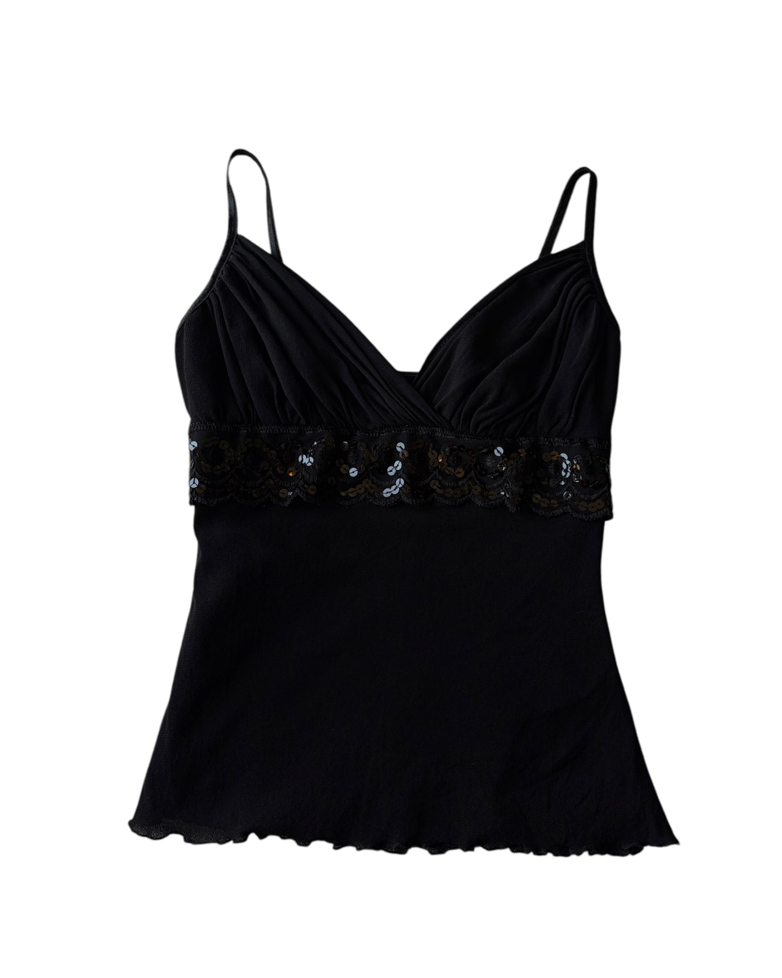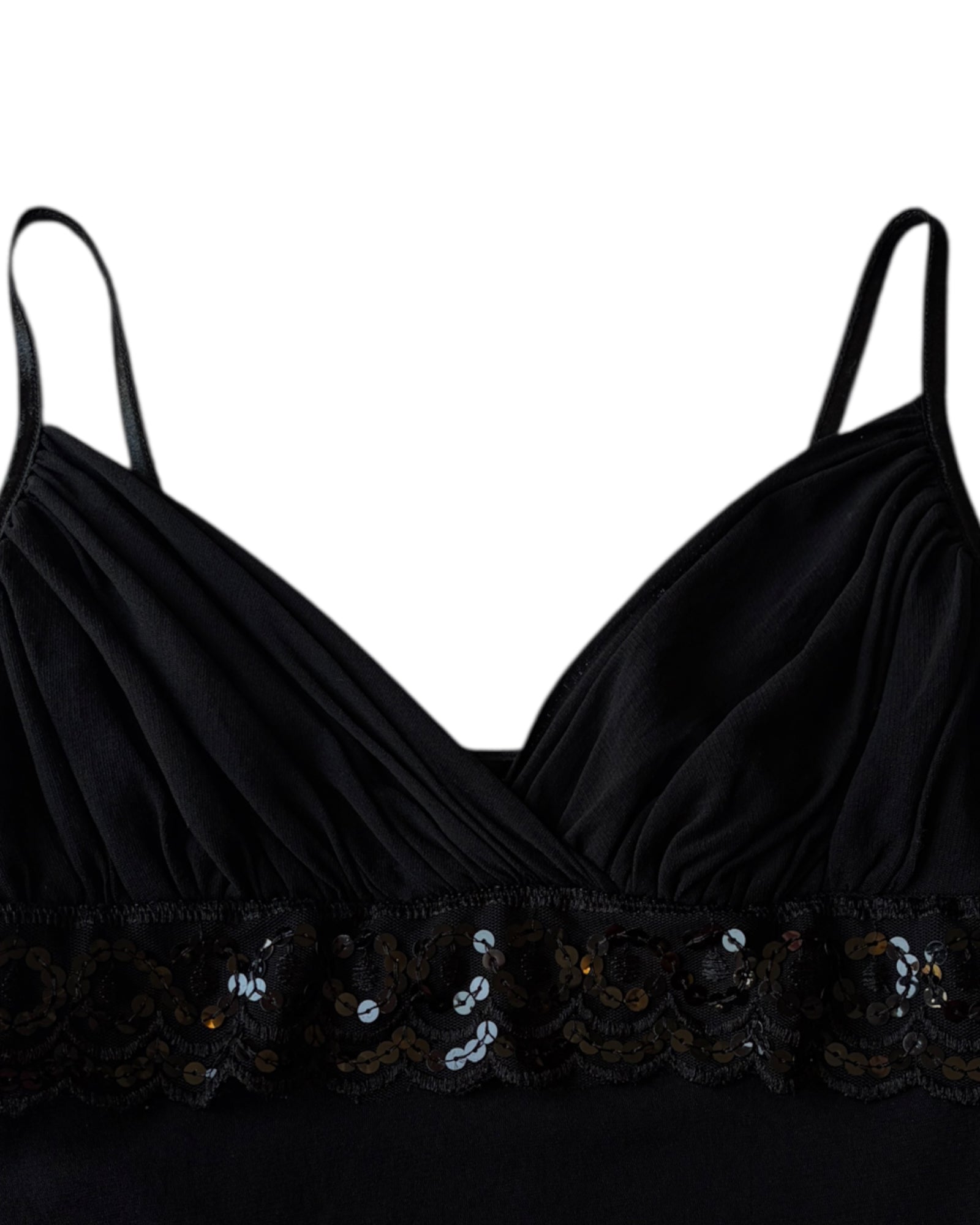 TOP DE TELA ELASTICA TIPO MESH, COLOR NEGRO SIN ESTAMPADO, CUELLO EN V, BANDA FRONTAL DE ENCAJE CON ENTEJUELAS NEGRAS, DE TIRANTES