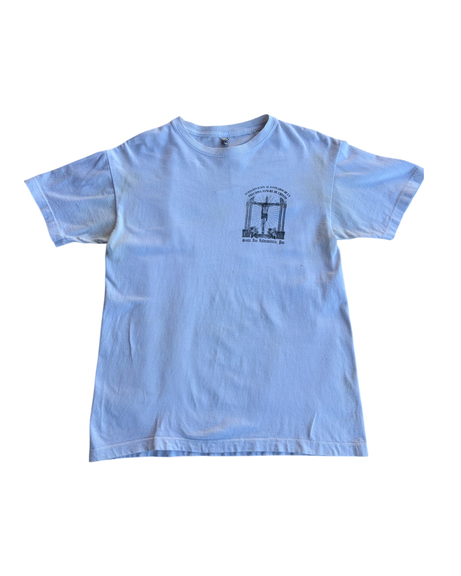 PLAYERA DE MANGA CORTA EN COLOR BLANCO CON PRINT DELANTERO DE JESUS EN LA CRUZ Y LETRAS DE "PEREGRINACION AL SANTUARIO DE LA PRECIOSA SANGRE DE CRISTO". MISMO PRINT PERO MÁS GRANDE Y EN COLOR AUZL EN LA PARTE TRASERA. 100% ALGODON. NO TIENE DETALLES, EN PERFECTAS CONDICIONES.