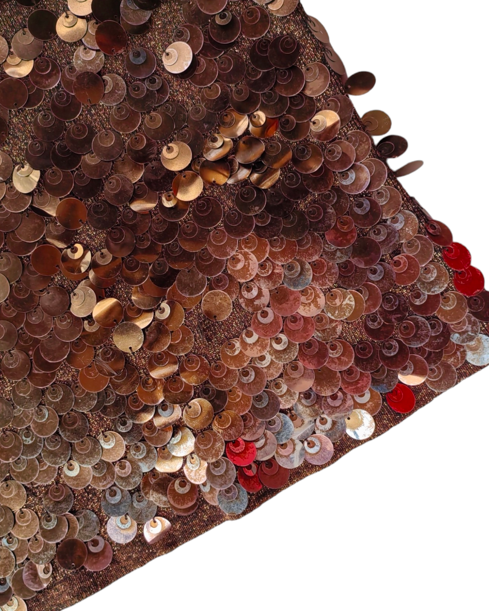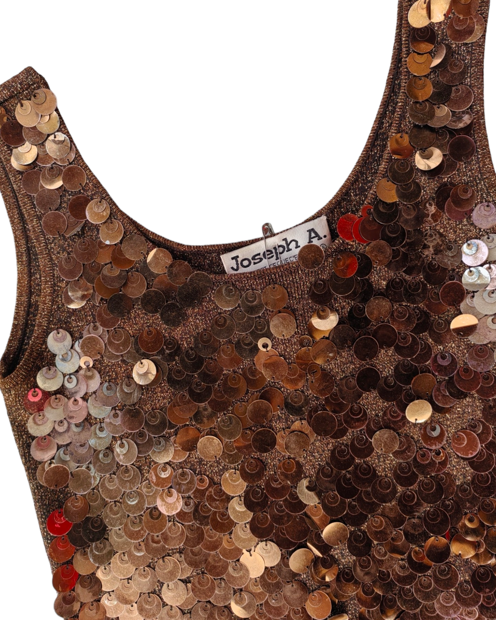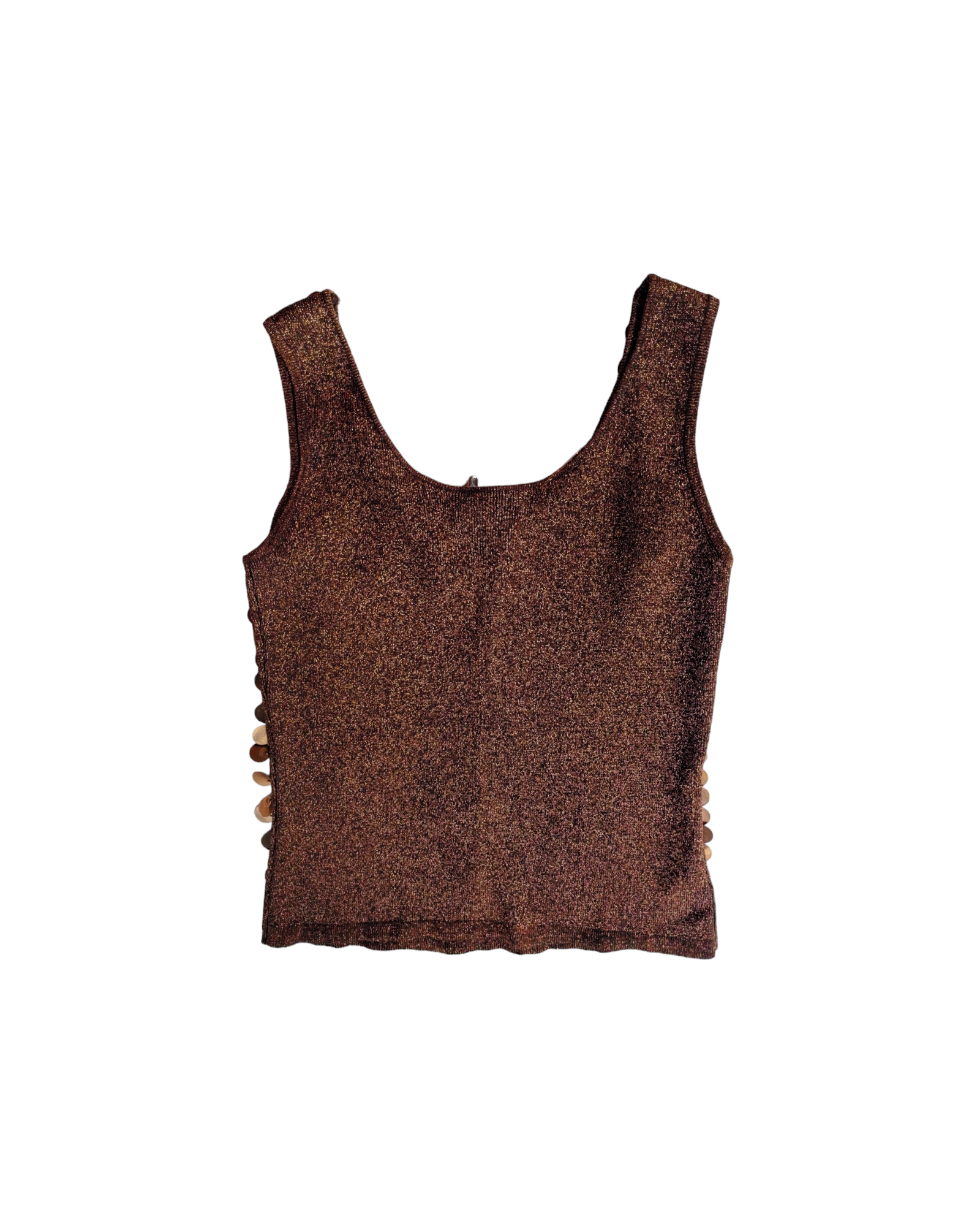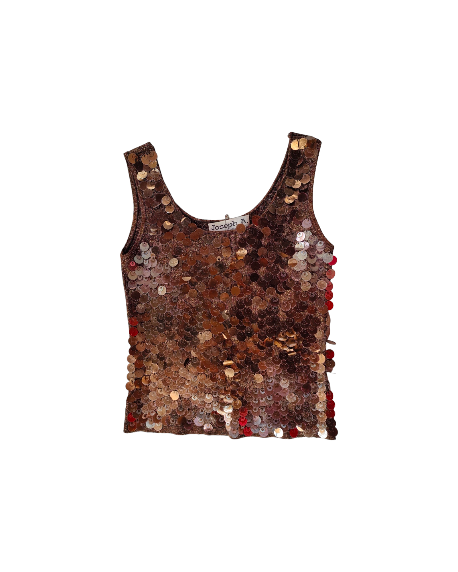 TANK TOP 85% SEDA 15% LUREX COLOR COBRE CON LENTEJUELAS BORDADAS EN LA PARTE FRONTAL, DESGASTE EN LA PINTURA DE LAS LENTEJUELAS INFERIORES.