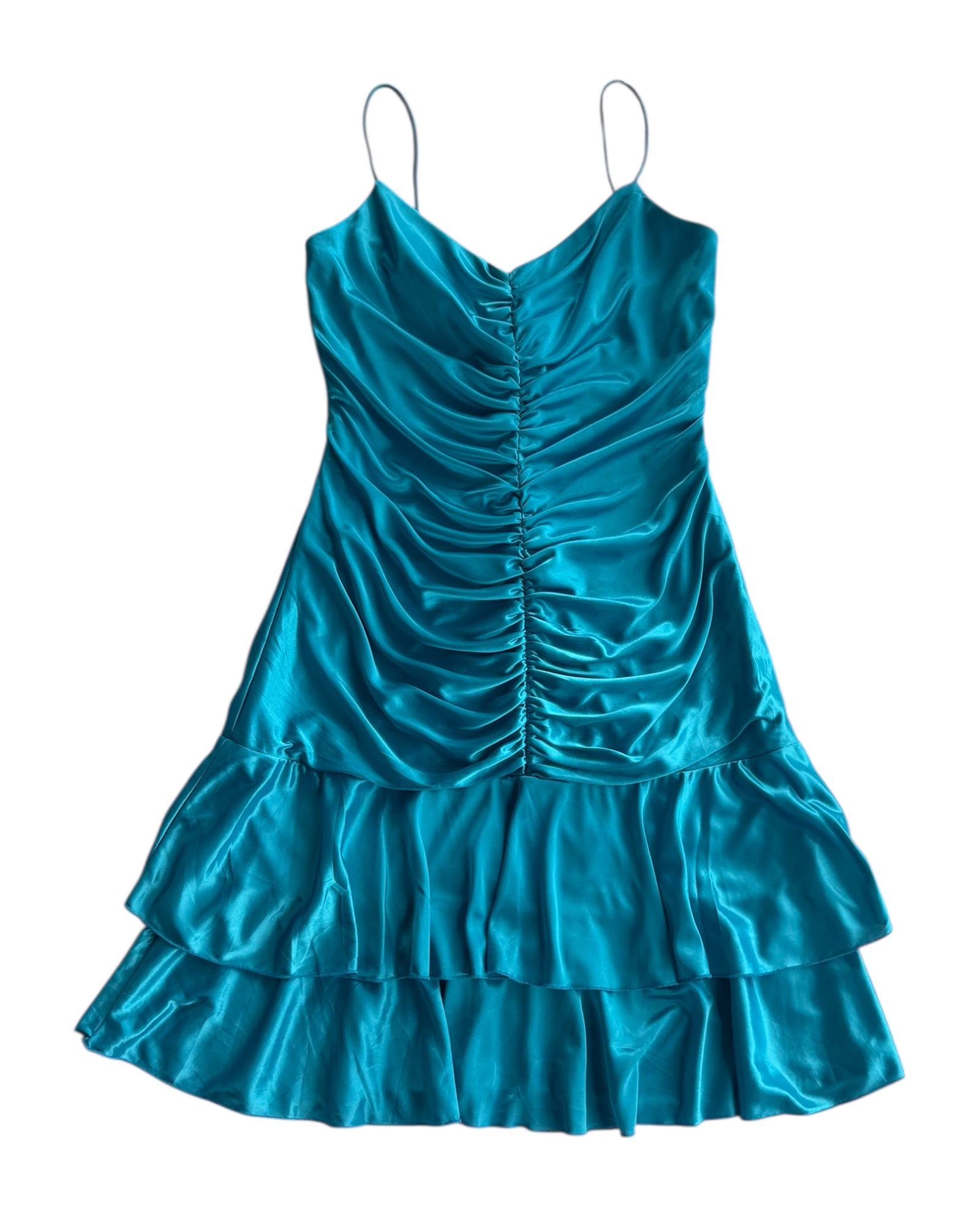 VESTIDO DE TIRANTES COLOR AZUL TURQUESA, DRAPEADO AL FRENTE Y ATRAS, FALDA CORTA, ESCOTE EN V