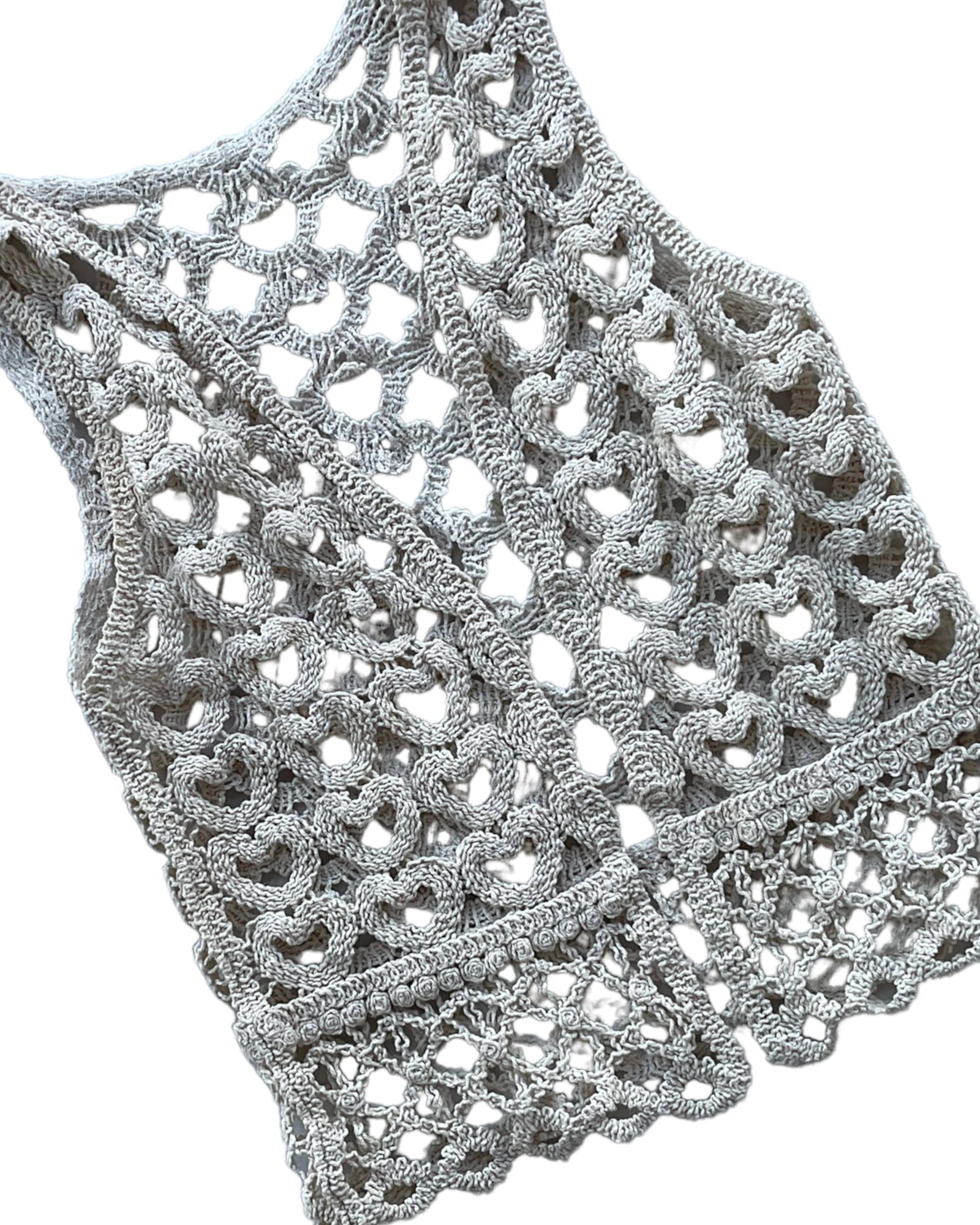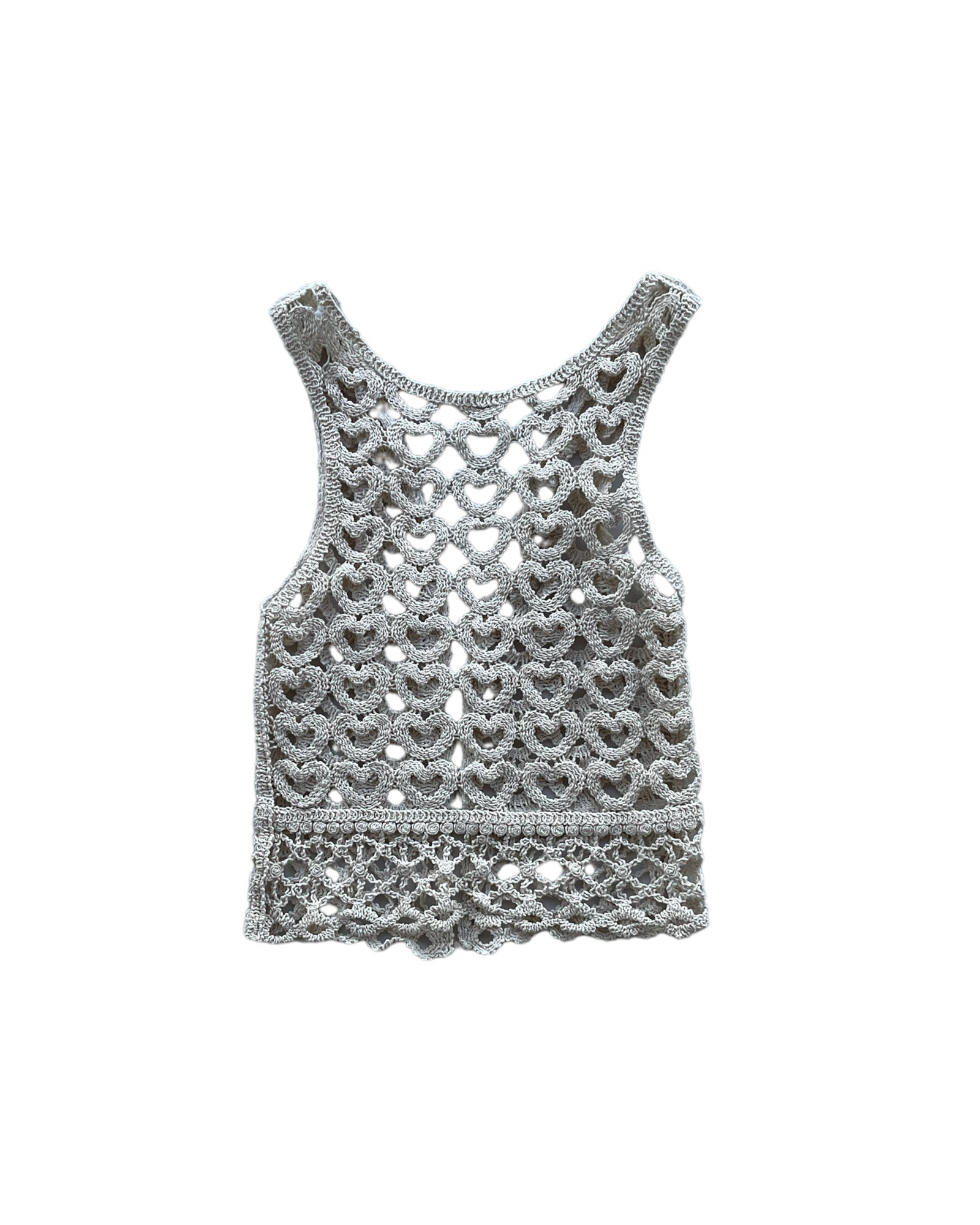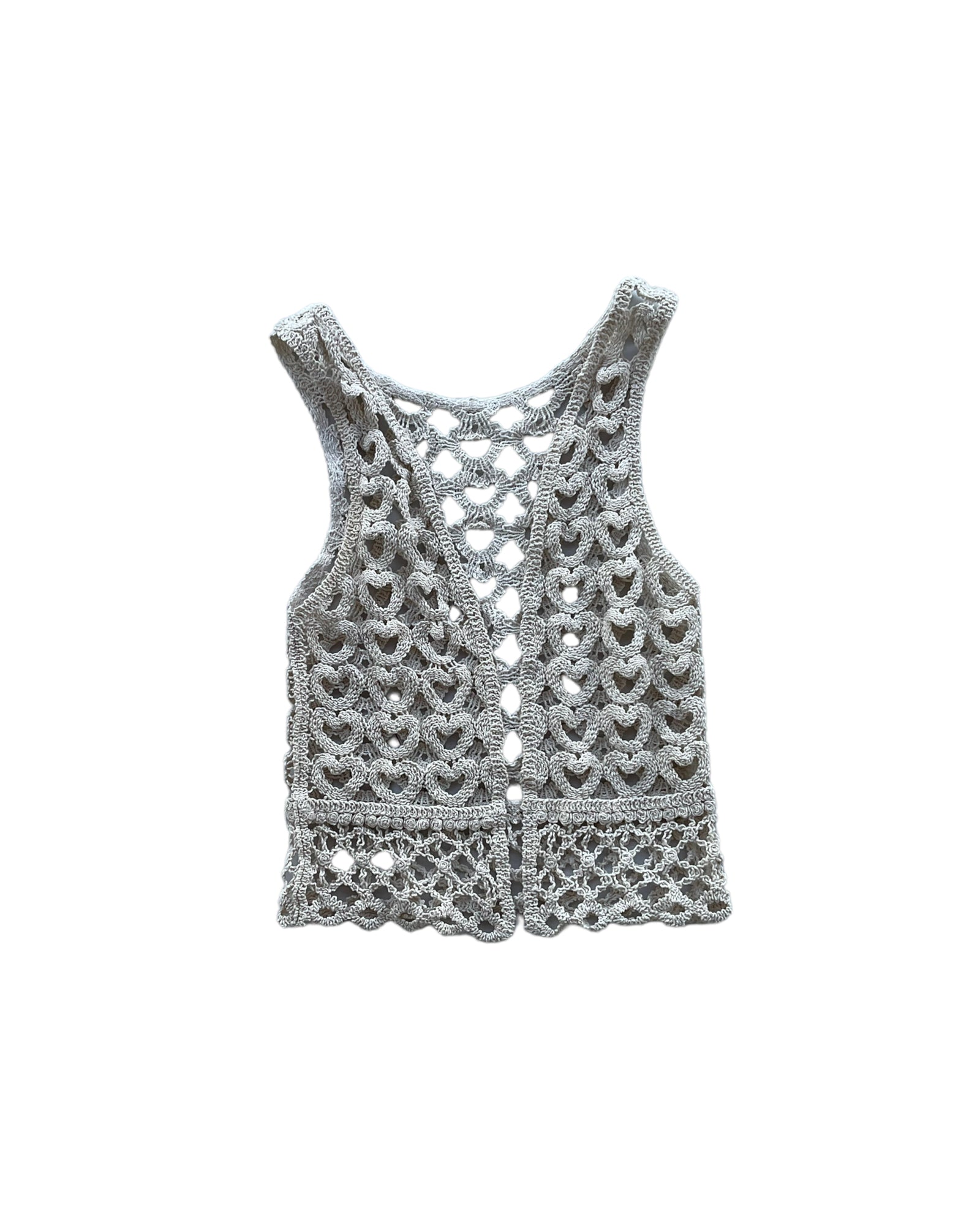 CHALECO TEJIDO COLOR CREMA CON PATRÓN DE CORAZONES. NO TIENE BOTONES. SIN DETALLES DE USO