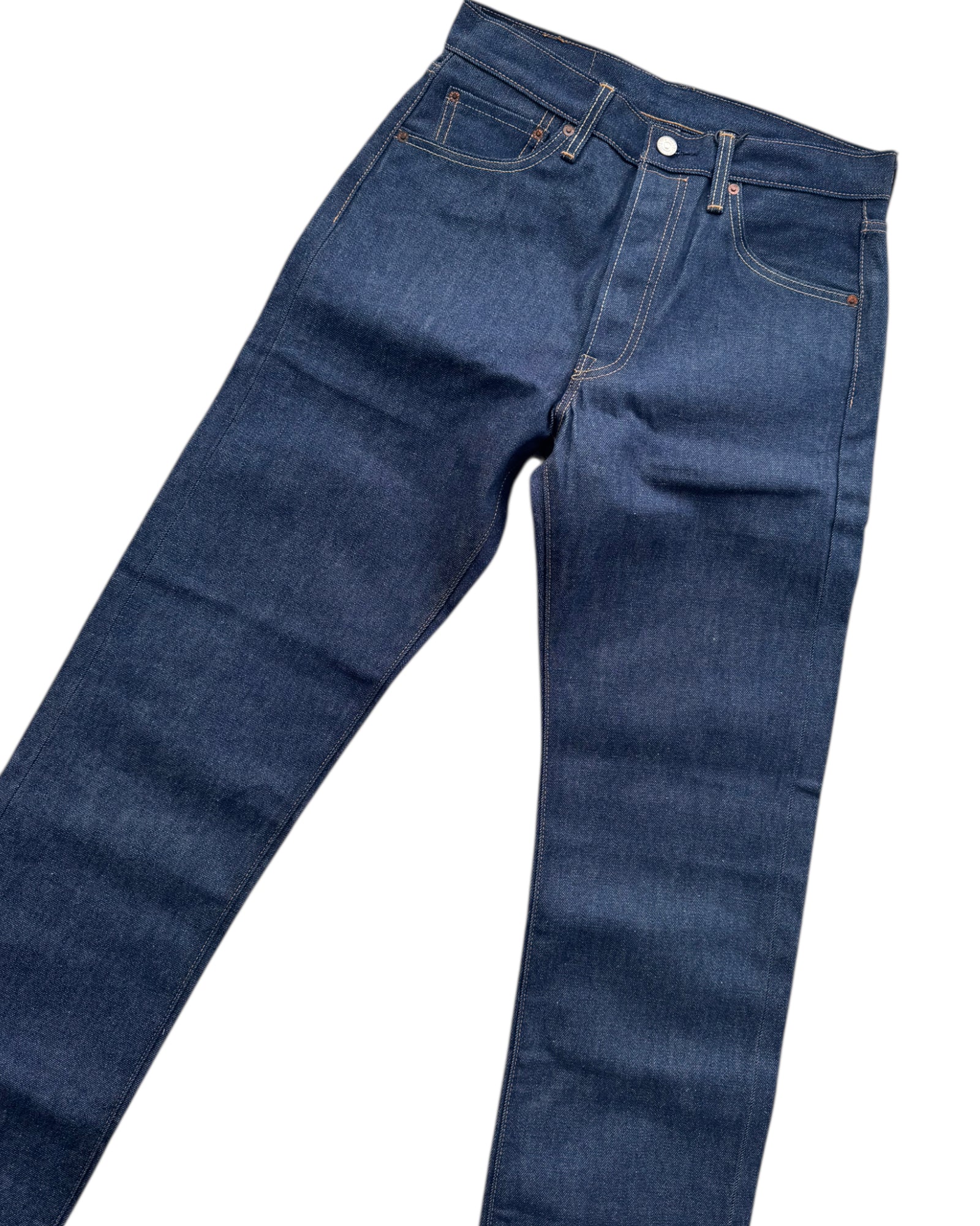 JEANS DE MEZCLILLA OSCURA MARCA LEVI´S MODELO 501 CORTE ANCHO, TIRO ALTO, CON DOS BOLSILLOS AL FRENTE Y AL REVERSO,COSTURAS PREDOMINANTES EN COLOR AMARILLO CLARO, LISOS, SIN ESTAMPADO, COMPLETAMENTE NUEVOS CON ETIQUERTA, 100% ALGODÓN.