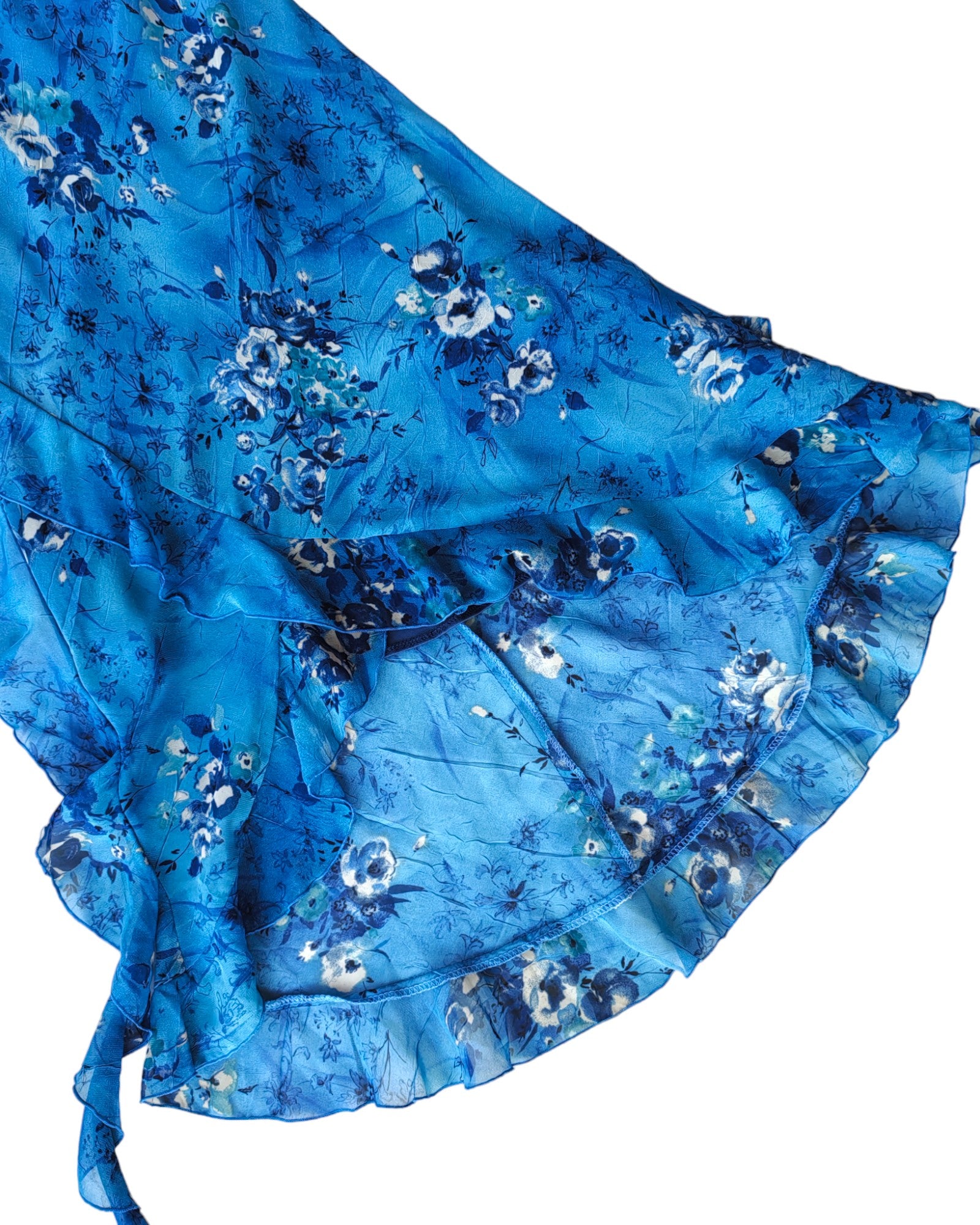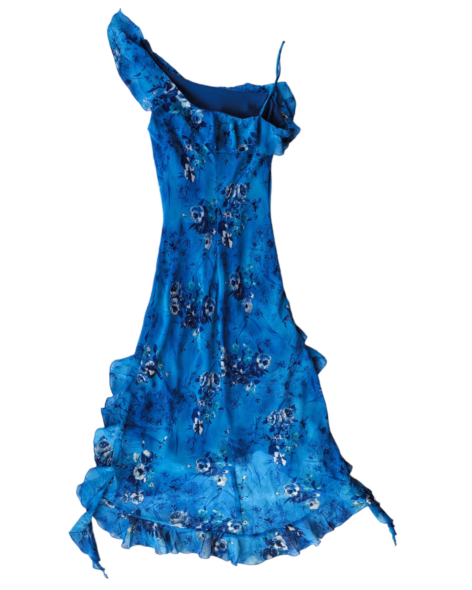 VESTIDO ASIMÉTRICO SLIP ON DE COTE TIPO SIRENA, TIRANTES ASIMÉTRICOS, UNO DE SPAGUETTI Y UNO CON HOLANES. COLOR AZUL CON PATRÓN DE FLORES AZUL OSCURO. FALDA DE HOLANES CRUZADOS. FORRO AZUL OSCURO. SIN DETALLES DE USO.