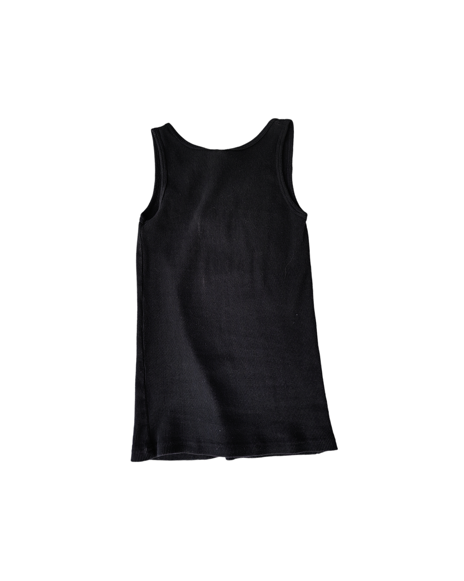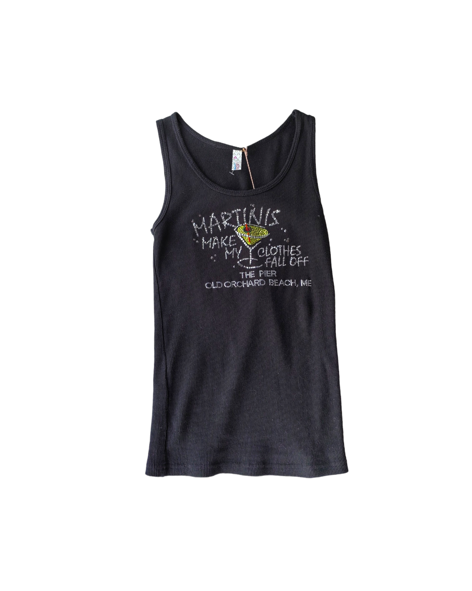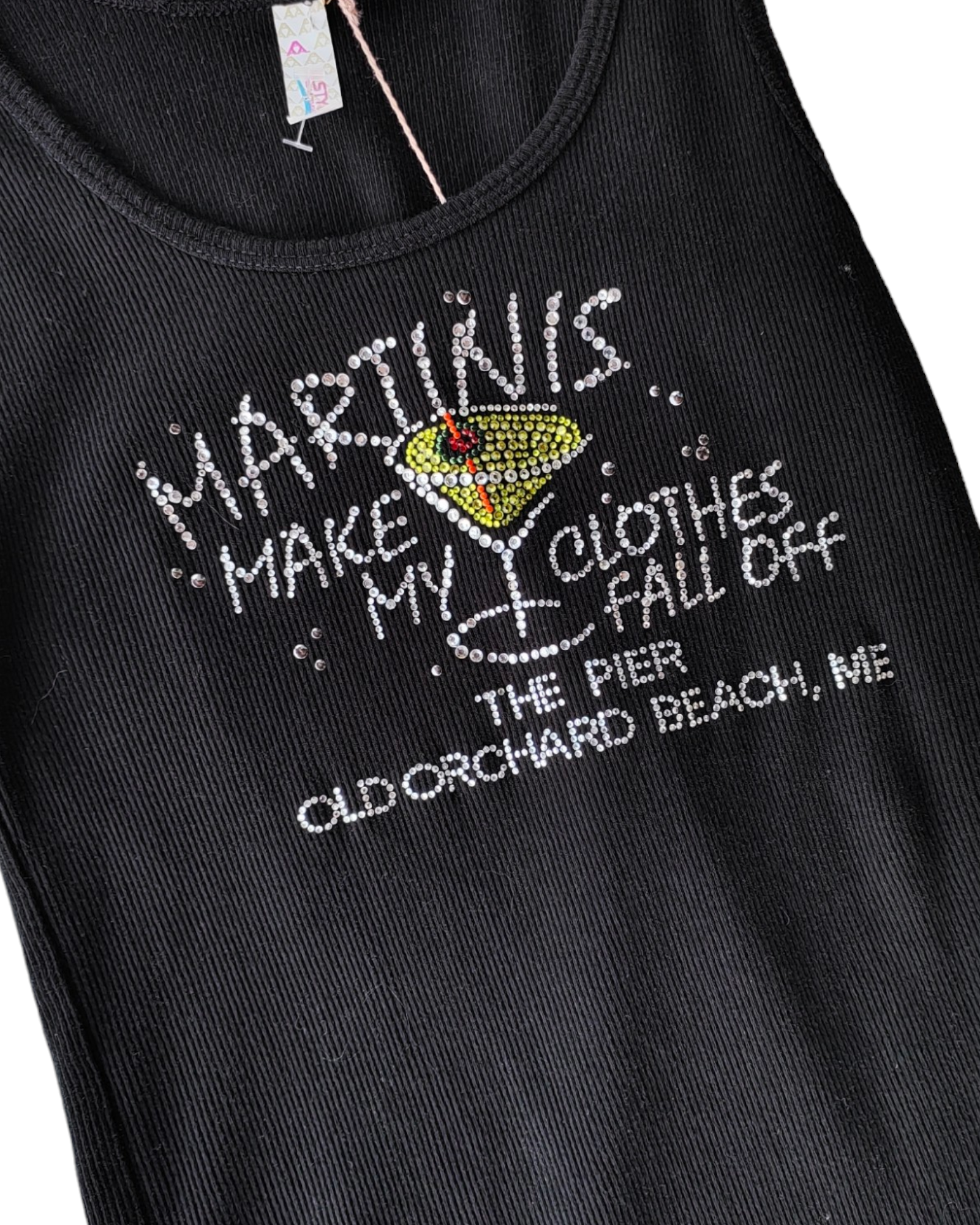 TANK TOP 100% ALGODÓN COLOR NEGRO CON LETRAS DE PEDRERÍA EN EL PECHO " MARTINIS MAKE MY CLOTHES FALL OFF, THE PIER OLD ORCHARD BEACH, ME" SIN DETALLES DE USO.
