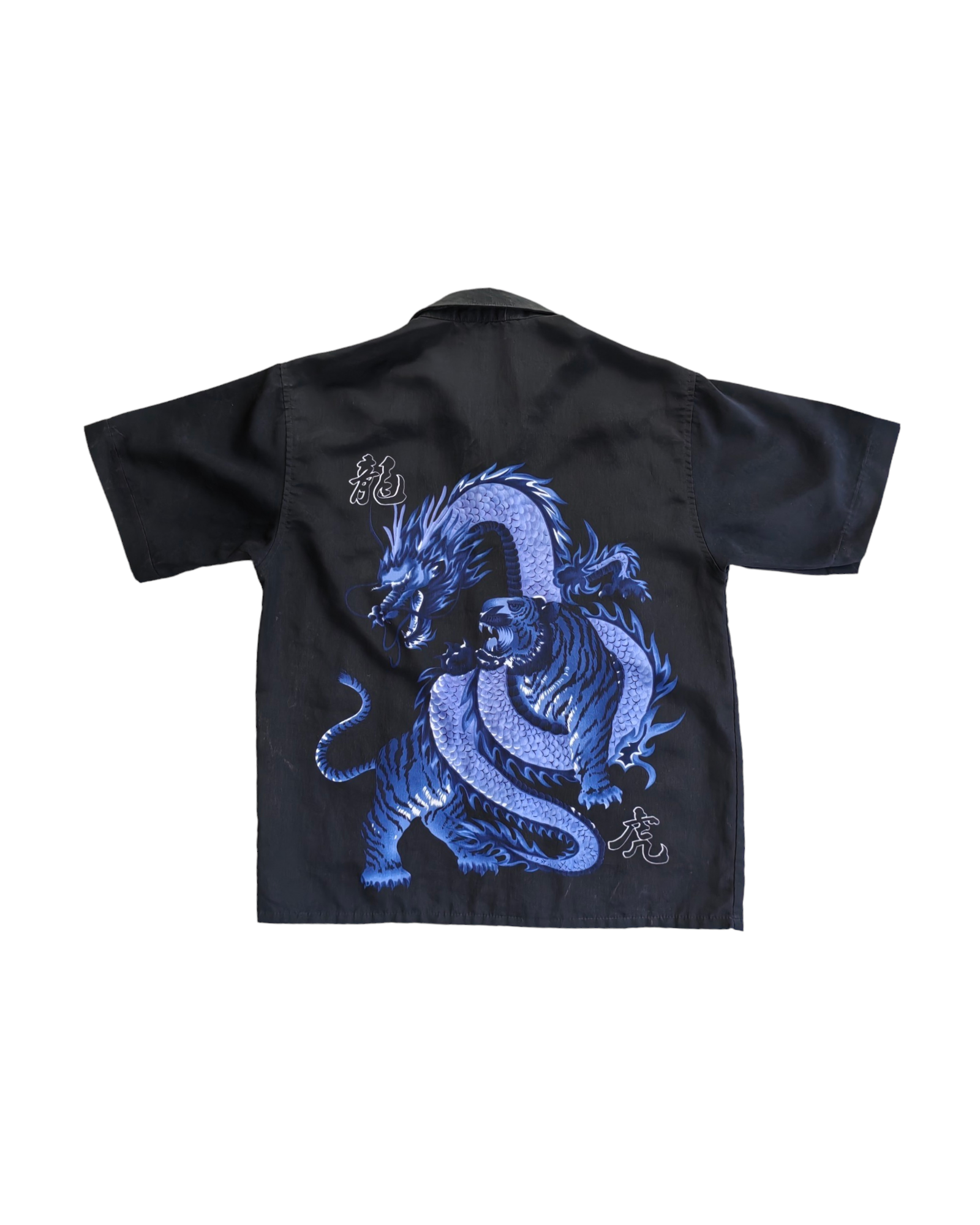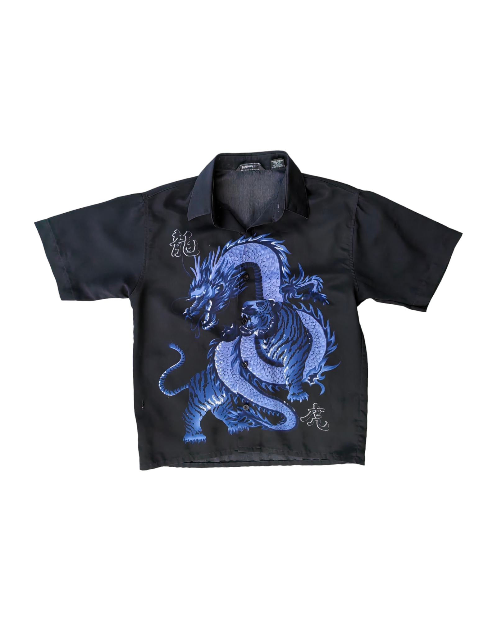CAMISA DE BOTONES 100% POLIÉSTER DE COLOR NEGRO CON LA IMAGEN DE UN DRAGÓN PELEANDO CON UN TIGRE EN EL PECHO Y LA ESPALDA EN COLOR AZUL. SIN DETALLES DE USO.