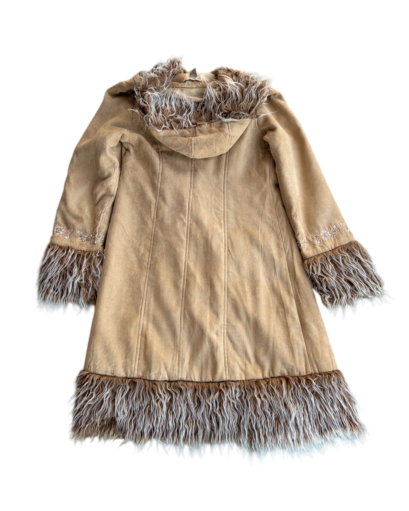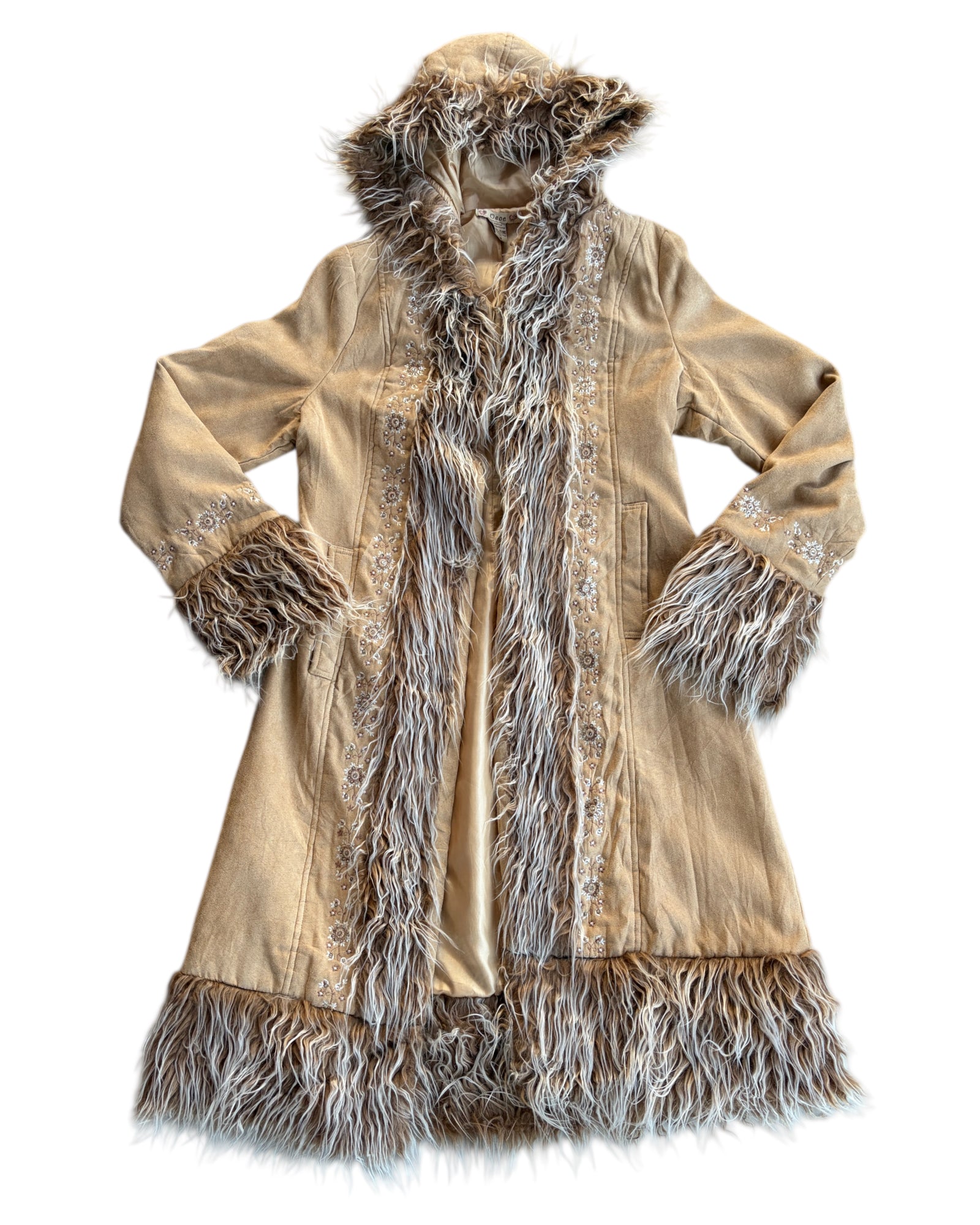 CHAMARRA CAFE CAMELLO ESTILO PIEL CON PELO EN LAS MANGAS, COLLAR Y CAPUCHA. BORDADO DE FLORES PEQUEÑAS CON LENTEJUELAS PLATEADAS EN COLOR CAFE Y BLANCO. PERFECTA PARA EL INVIERNO. 50% ACRYLICO Y 50% POLYESTER. NO TIENE DETALLES, EN PERFECTAS CONDICIONES.