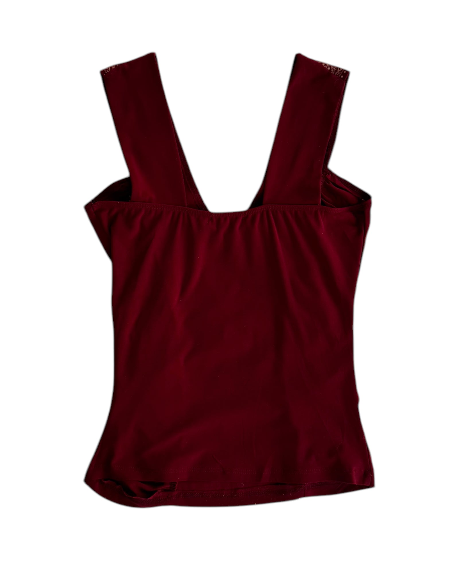 BLUSA ROJA DE TIRANTES GRUESOS, CON ESCOTE EN CORTE "V", BRILLOS EN TODO EL FRENTE Y TIRANTES, REMANGADO A LOS LADOS QUE DAN EFECTO ARRUGADO, LISO Y SIN ESTAMPADOS AL REVERSO, 92% POIESTER, 8% ELASTANO