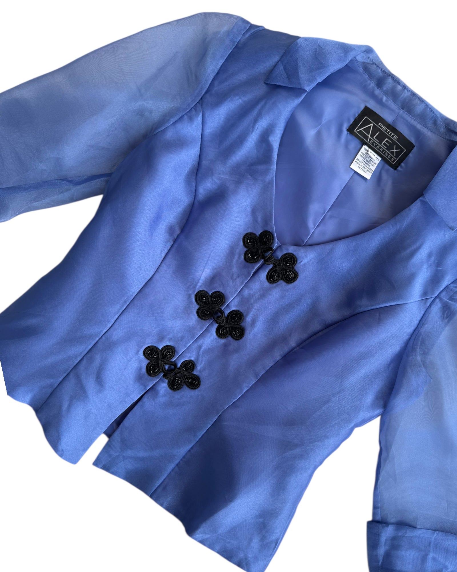 CHAQUETA DE CHIFÓN COLOR LAVANDA. MANGAS 3/4 TRANSPARENTES CON RIBETES NEGROS DE CUENTAS EN PARTE FRONTAL. CUELLO ABIERTO. SIN DETALLES. EN PERFECTAS CONDICIONES. 100% POLIESTER.