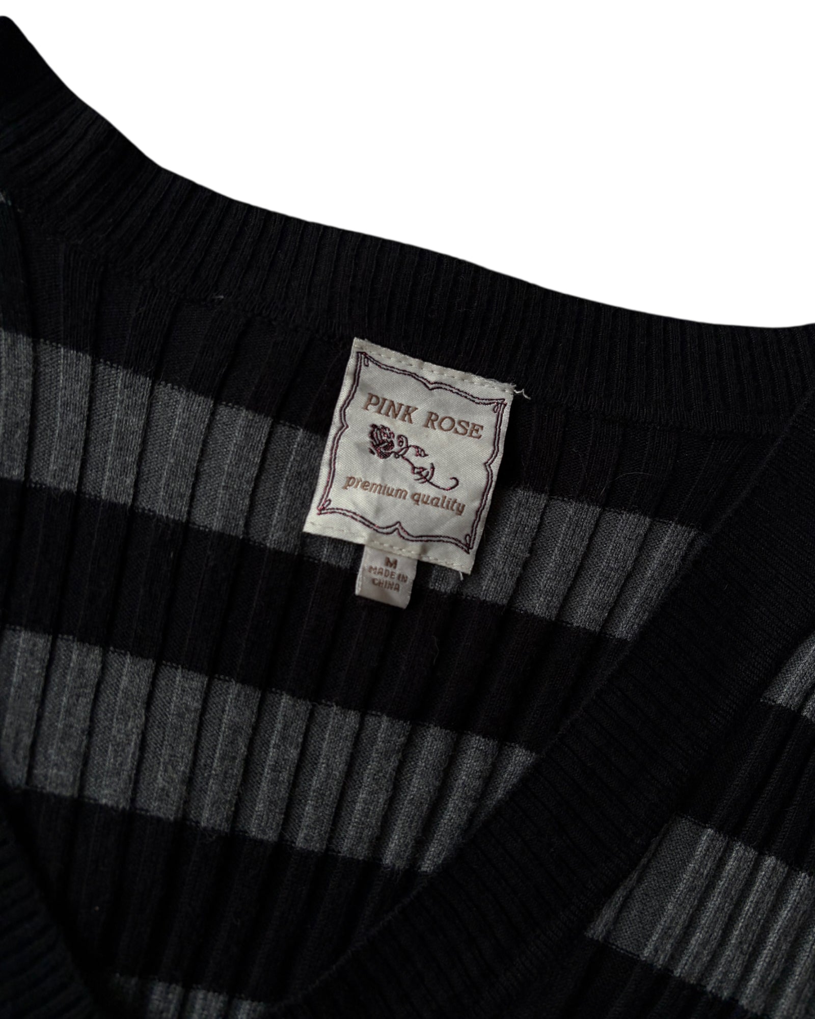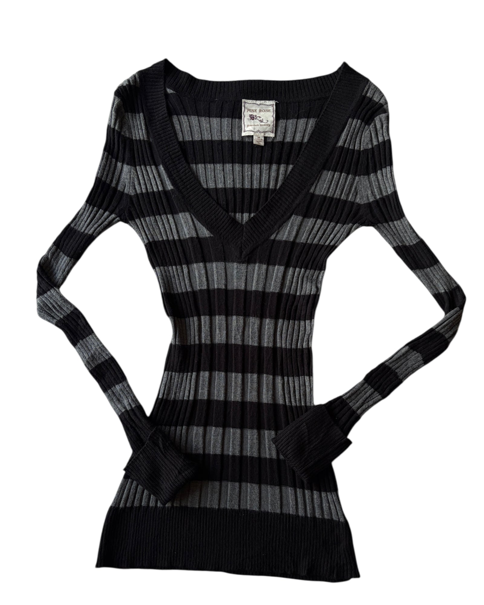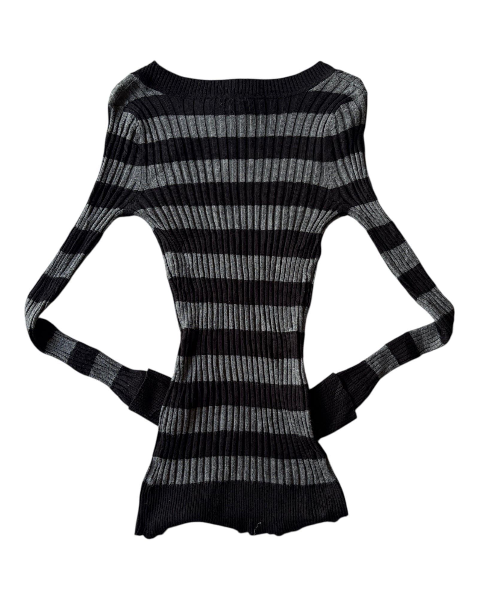 SUETER COLOR GRIS Y NEGRO, ESTAMPADO DE RAYAS HORIZONTALES Y CUELLO EN V PROFUNDO, MANGA LARGA Y CORTE AJUSTADO DEL CUERPO.