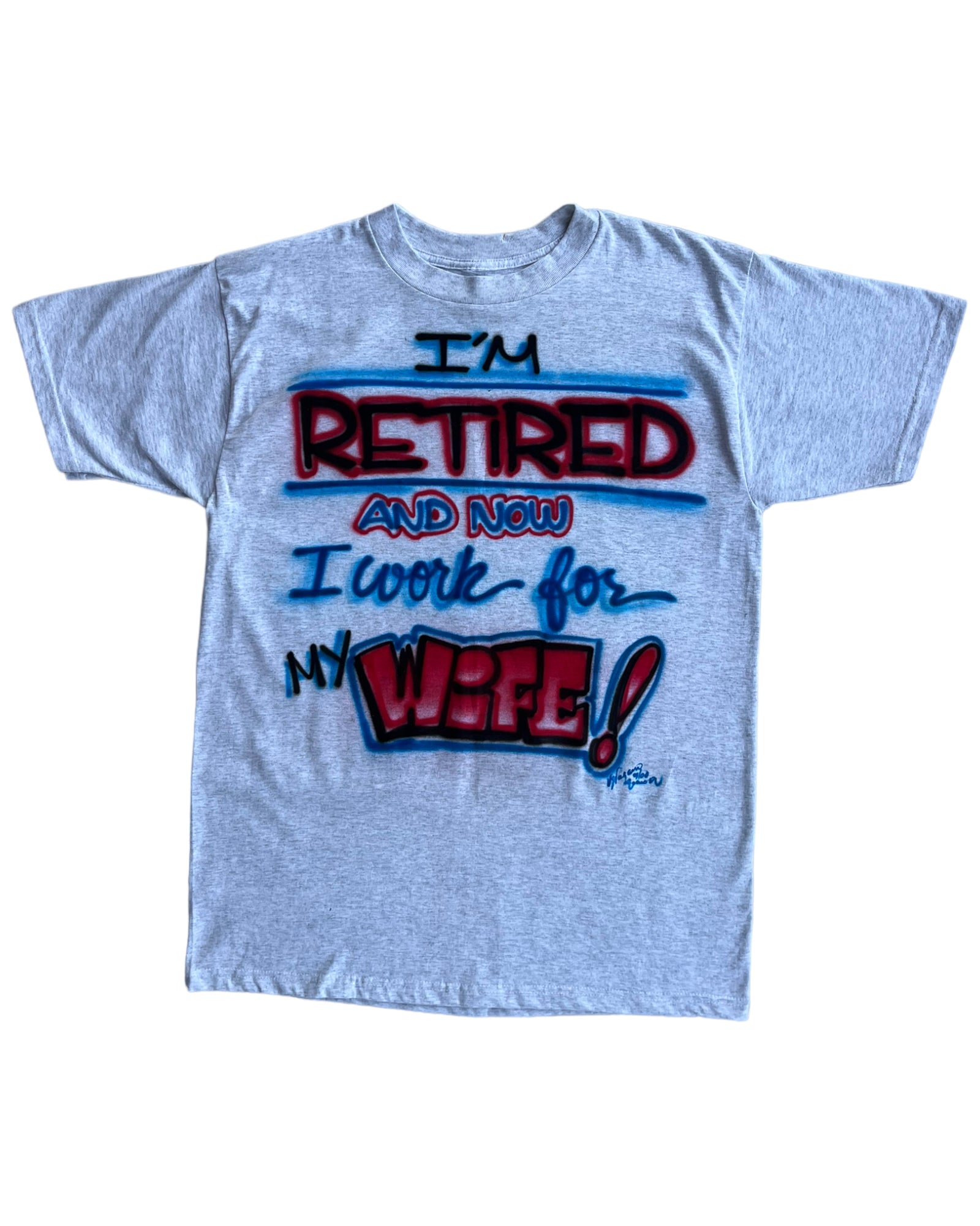 PLAYERA 100% ALGODÓN DE COLOR GRIS CLARO CON LAS LETRAS "IM RETIRED AND NOW I WORK FOR MY WIFE" PINTADAS A MANO CON AERÓGRAFO EN COLORS AZUL, NEGRO Y ROJO . FIRMA DEL ARTISTA EN LA PARTE INFERIOR DERECHA DEL ESTAMPADO. SIN DETALLES DE USO.