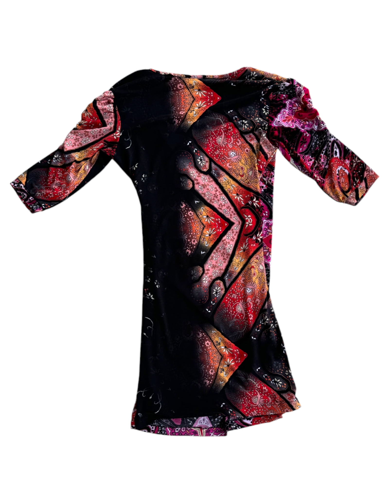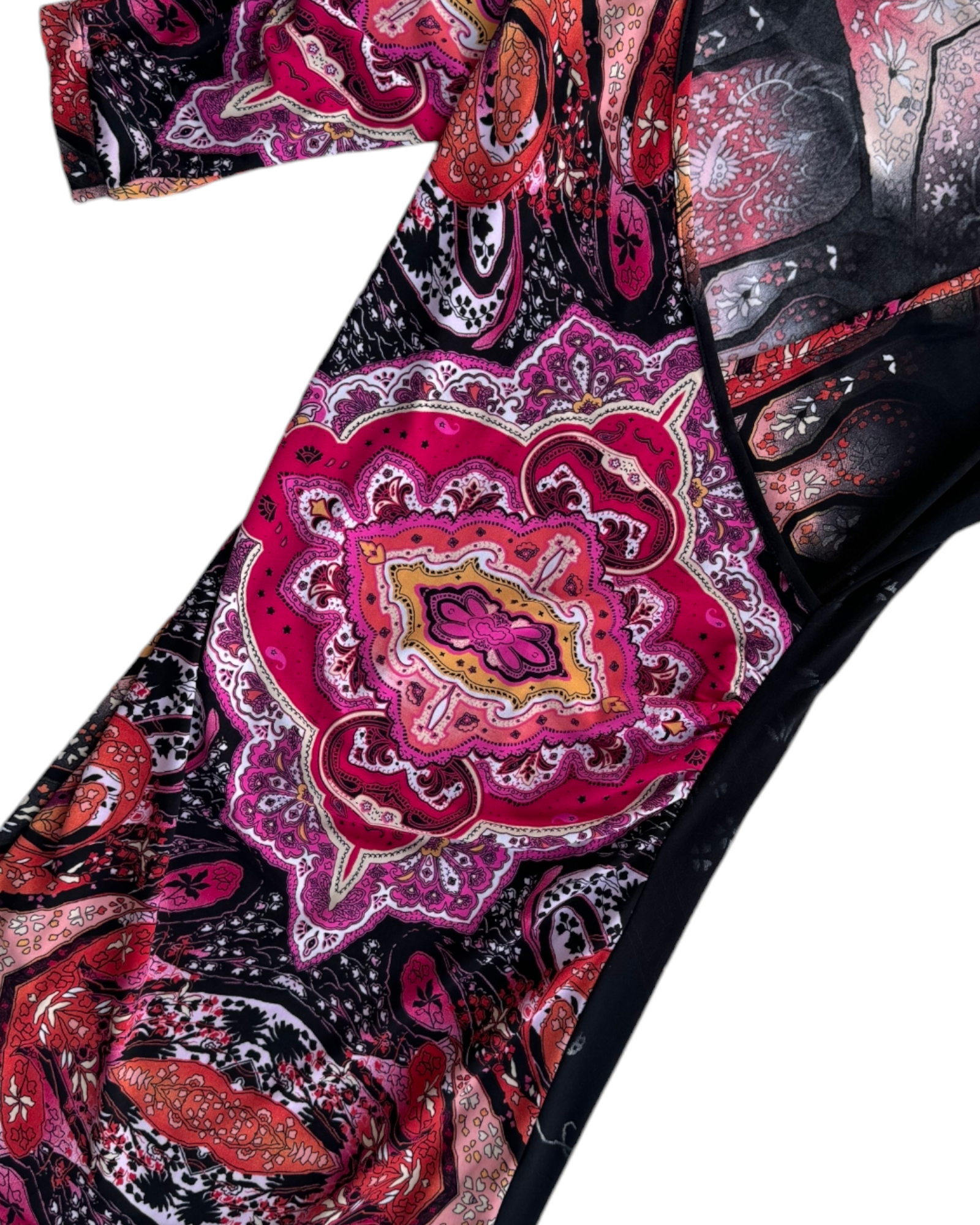 VESTIDO 100% POLIÉSTER DE MANGAS 3/4 ESCOTE EN V DE COLORES NEGROS Y FUCSIA CON PATRÓN CENTRAL DE MANDALA. MANGAS PUFFER. SIN DETALLES DE USO.