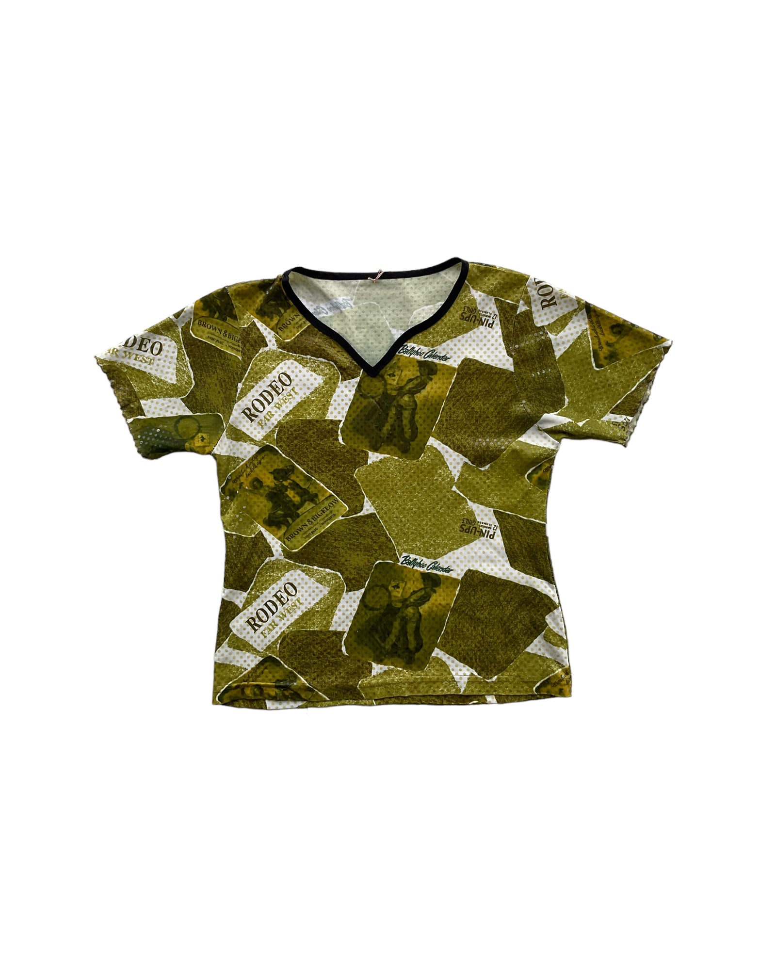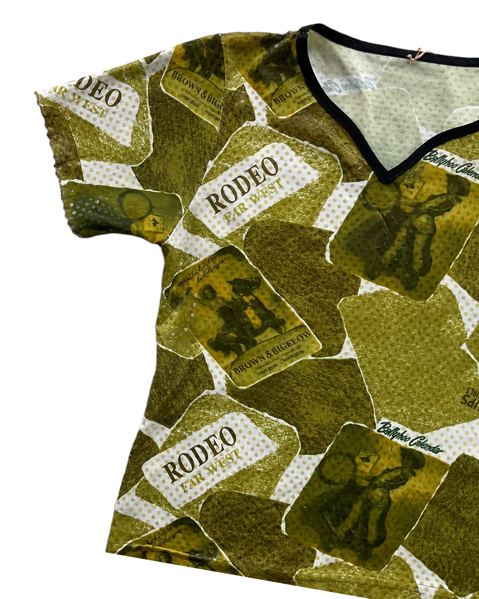 TOP CUELLO V, COLOR VERDE CON IMÁGENES DE MUJERES VAQUERAS EN COLORES BLANCO Y TONOS DE VERDE, DETALLES DE BRILLO. BORDE DEL CUELLO COLOR NEGRO, DOBLADILLO DE LECHUGA EN LAS MANGAS. SIN DETALLES DE USO.