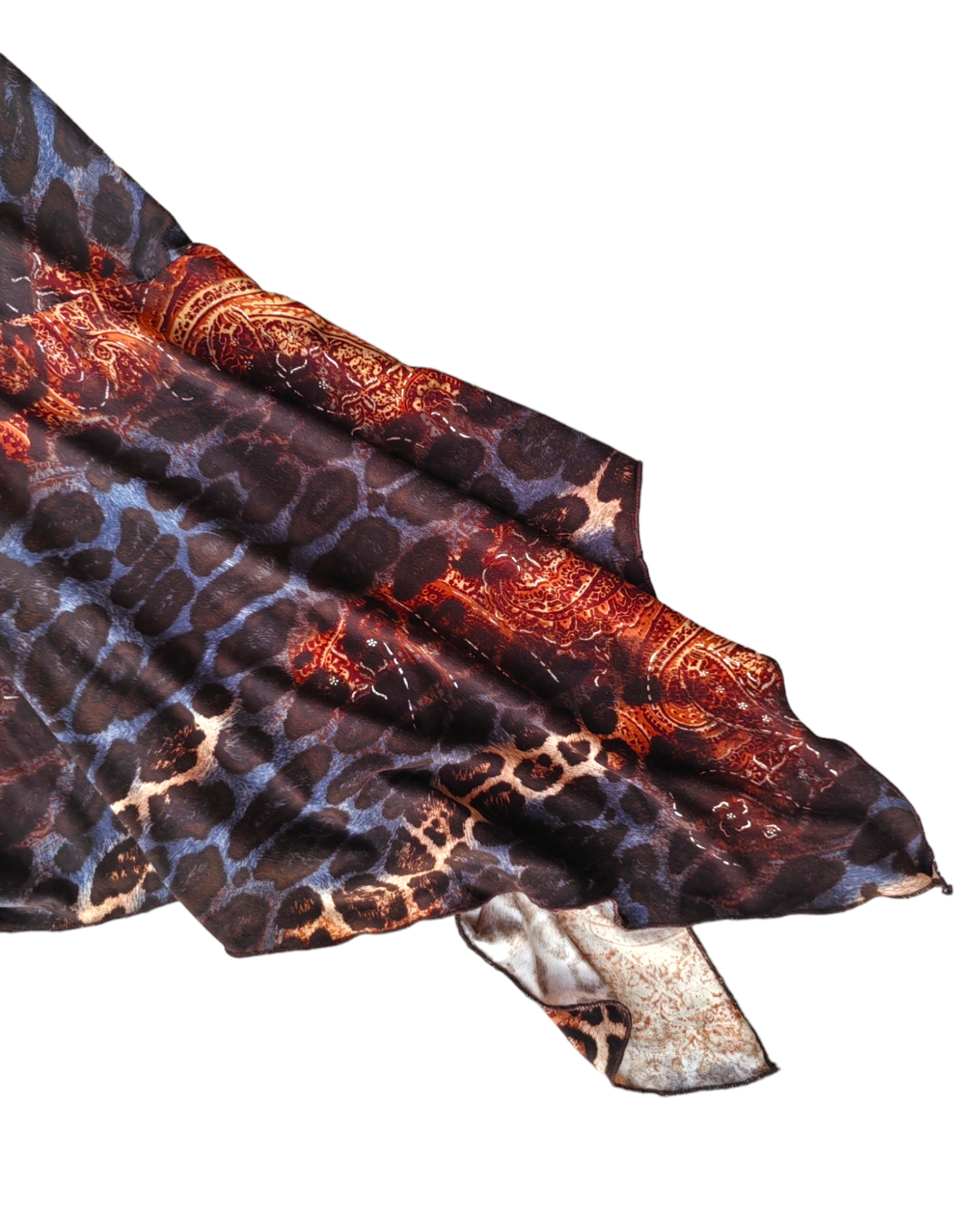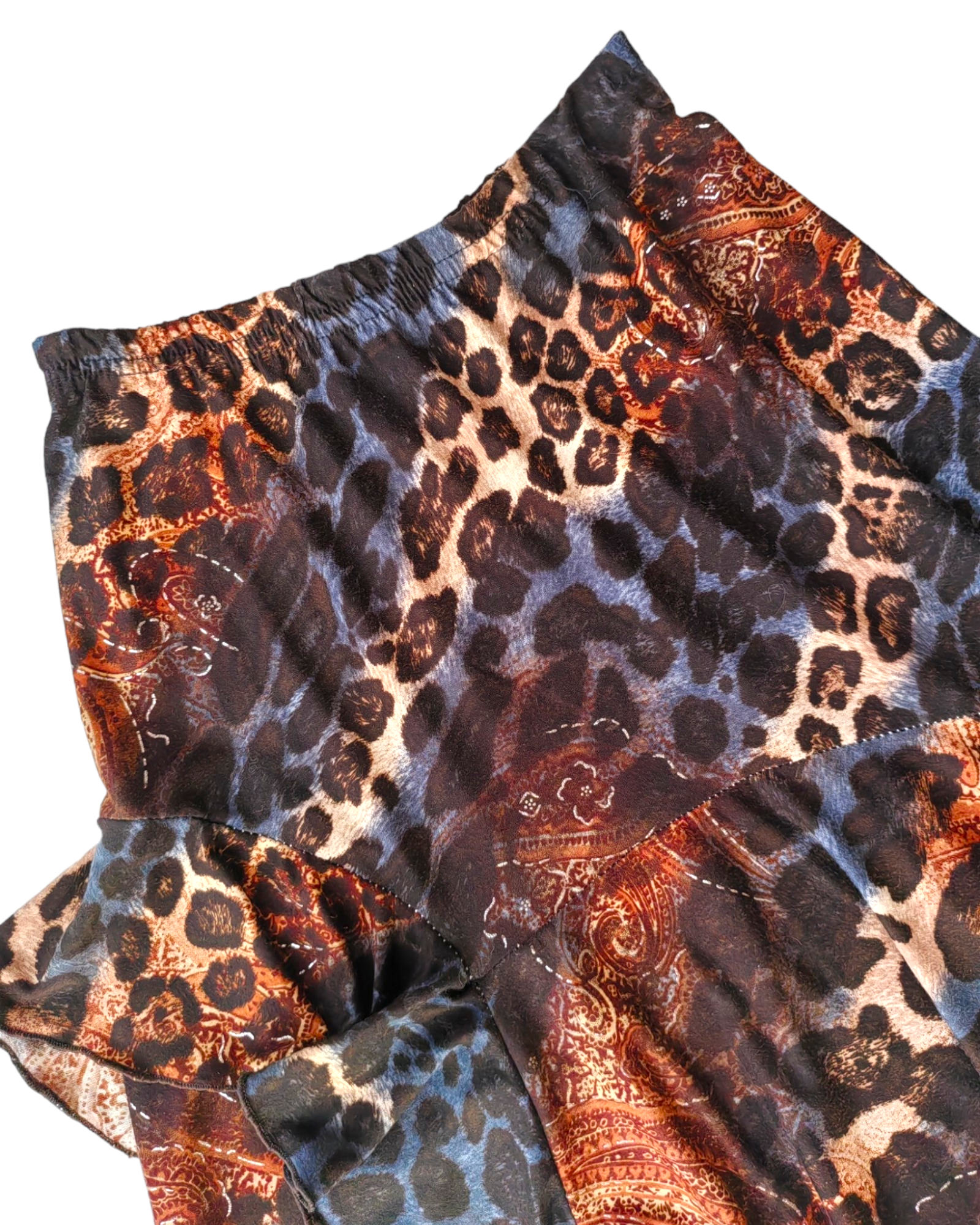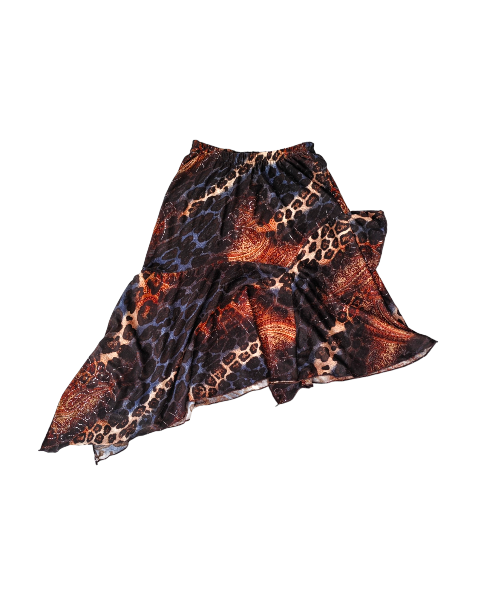 FALDA ANIMAL PRINT DE CHEETA DECOLORES AZUL, NARANJA, BEIGE Y DETALLES PLATEADO, CORTE ASIMÉTRICO, ELÁSTICO EN LA CINTURA, LIGERO DESGASTE EN LAS COSTURAS.