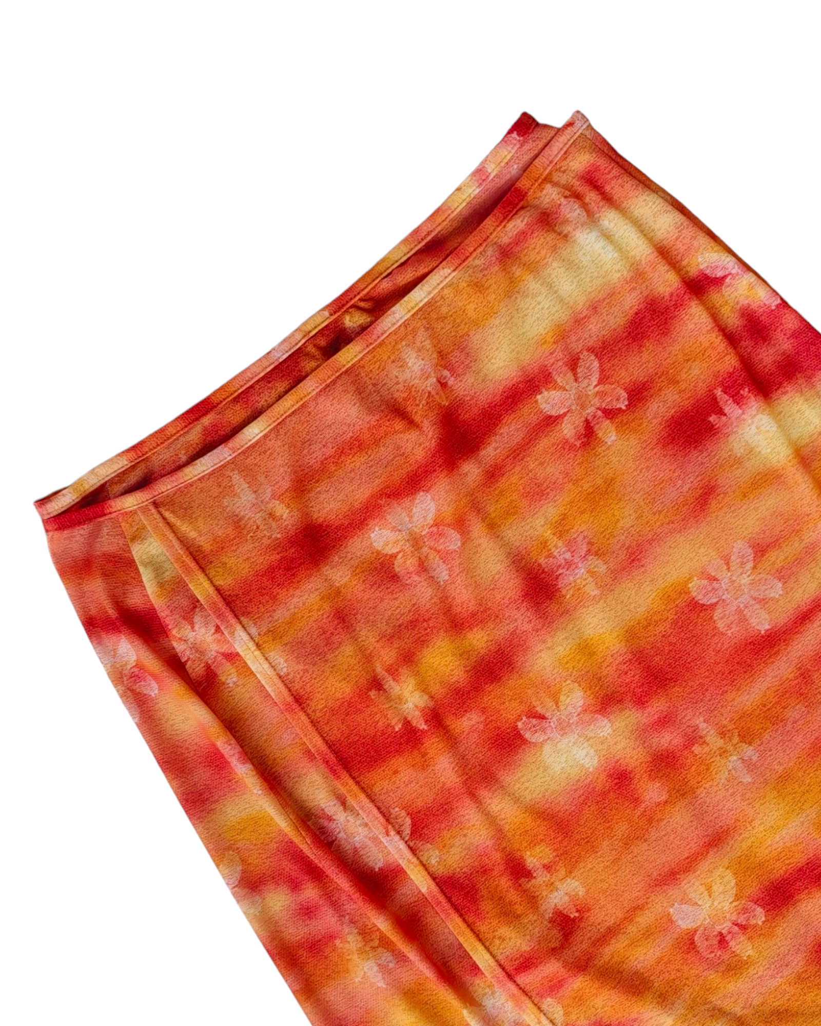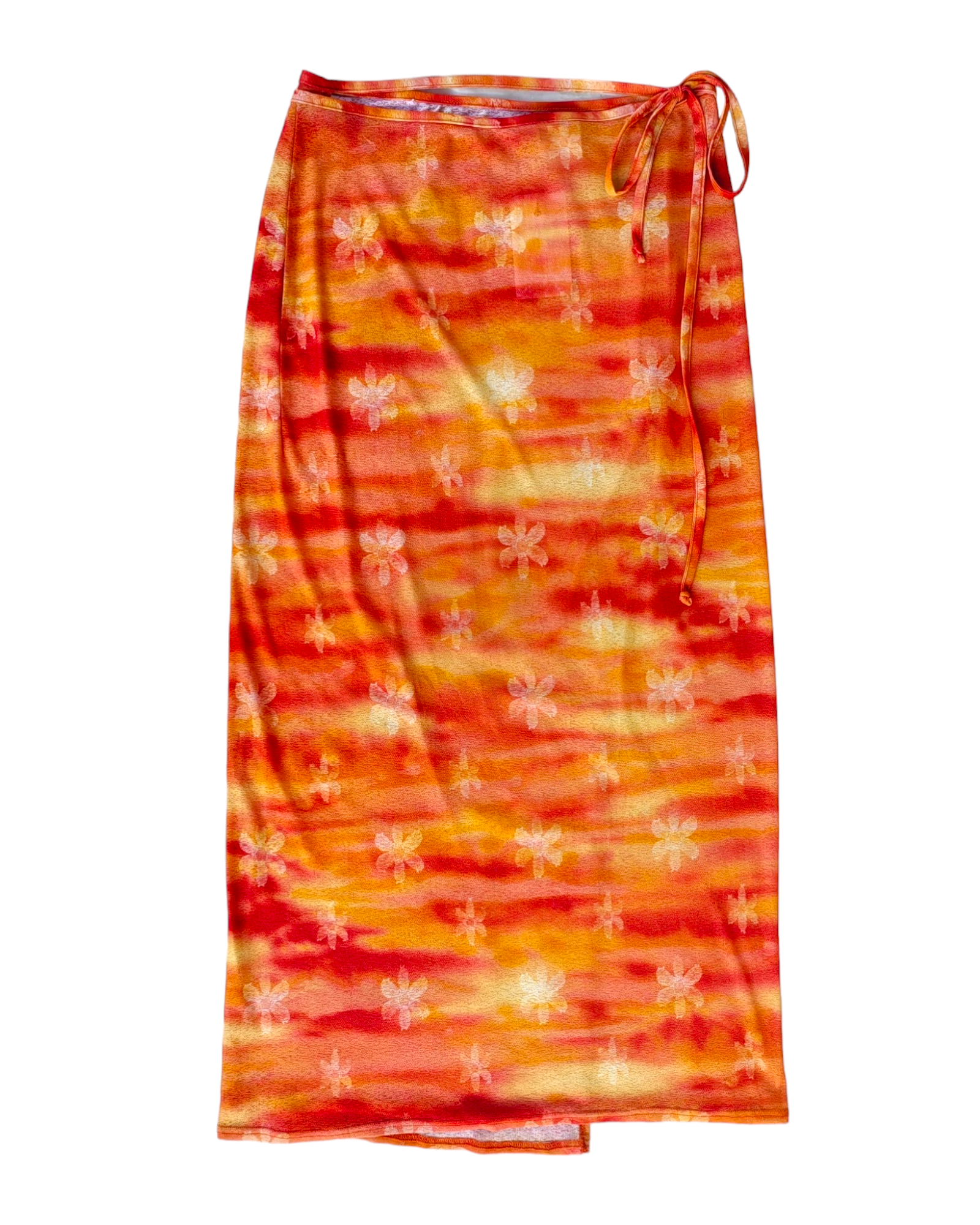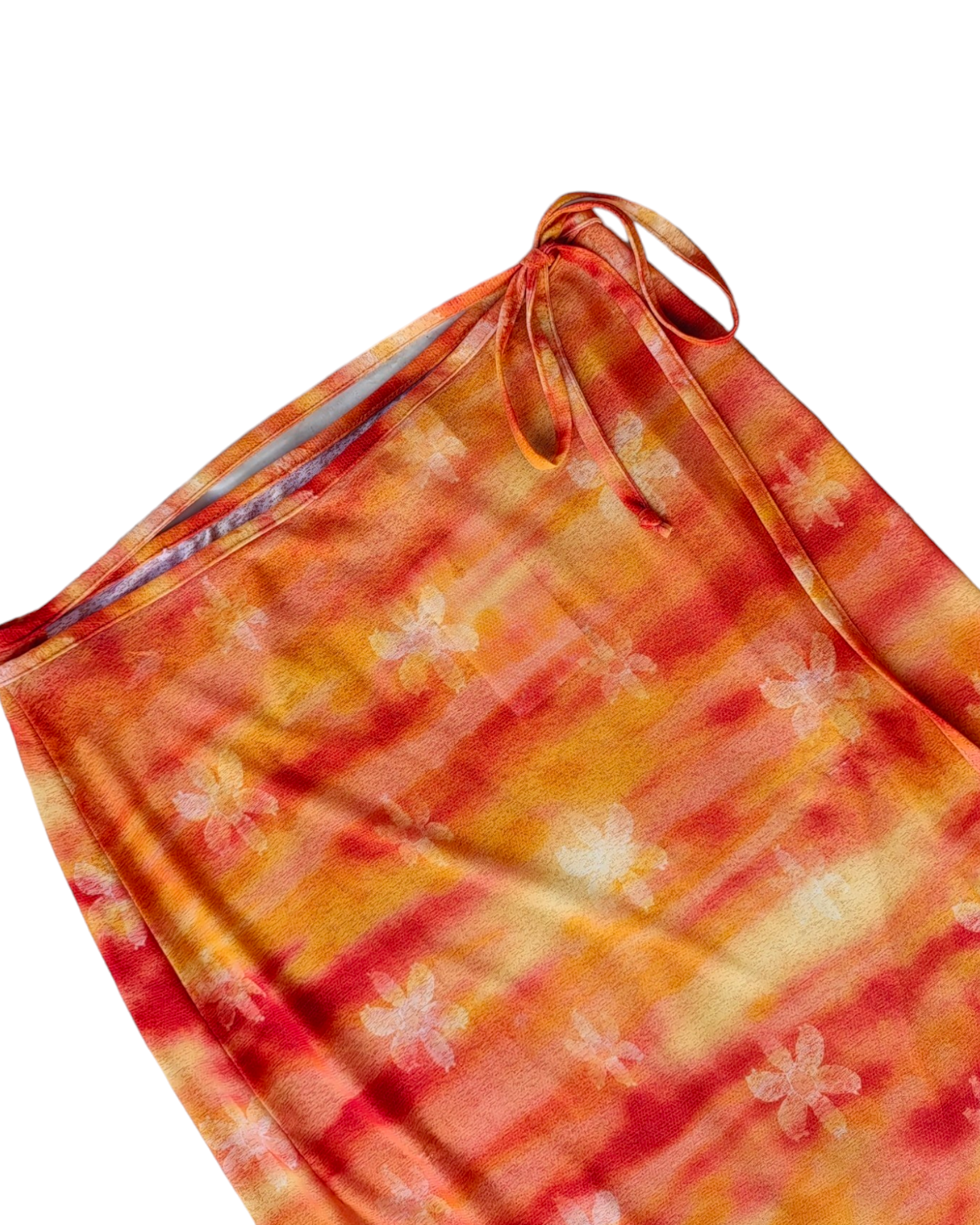 PAREO LARGO 100% POLIÉSTER DE COLOR NARANJA, AMARILLO Y ROJO CON PATRÓN DE FLORES AMARILLAS. CINTA PARA AJUSTAR A LA CINTURA. LIGERO DESGASTE EN ALGUNOS PUNTOS.