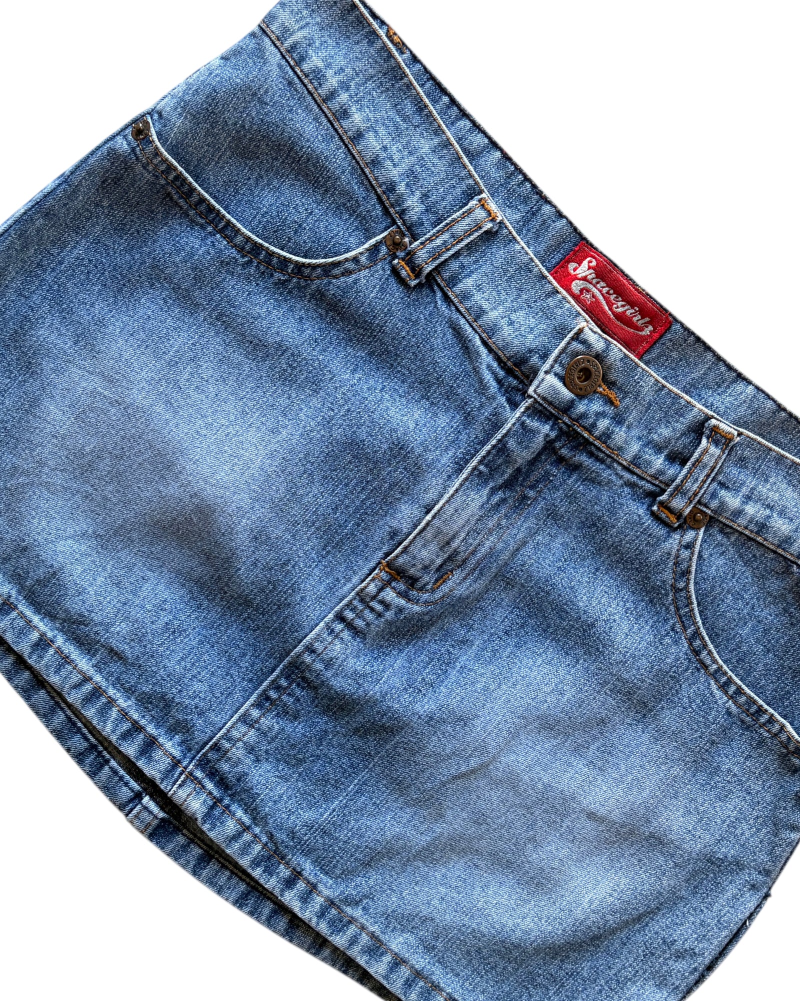 MINI FALDA DE MEZCLILLA SPACEGIRLZ DE DENIM EN COLOR AZUL MEDIO SIN ESTAMPADO CON BOLSILLOS DELANTEROS Y BOTONES EN LA CINTURA.