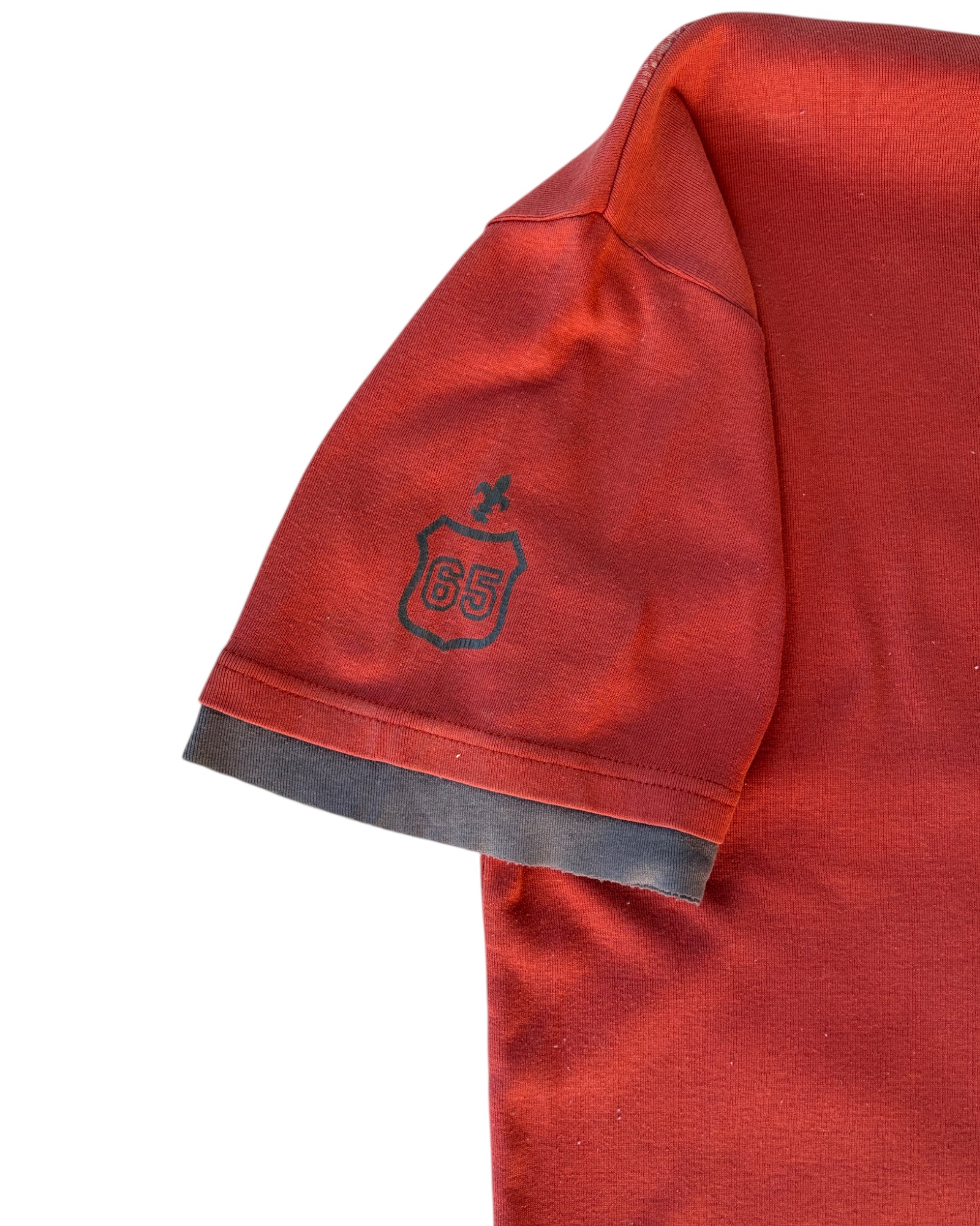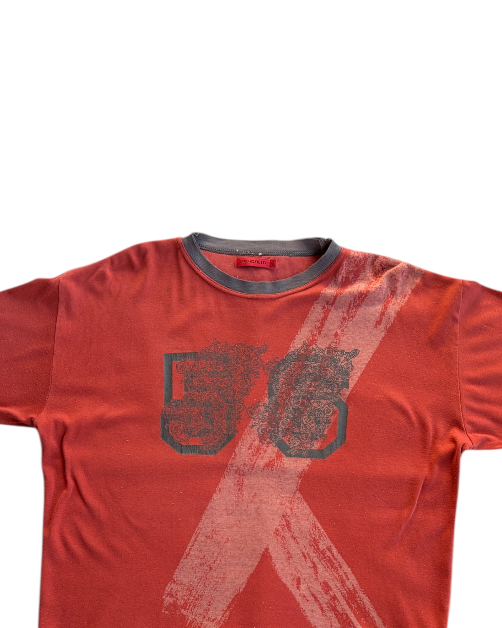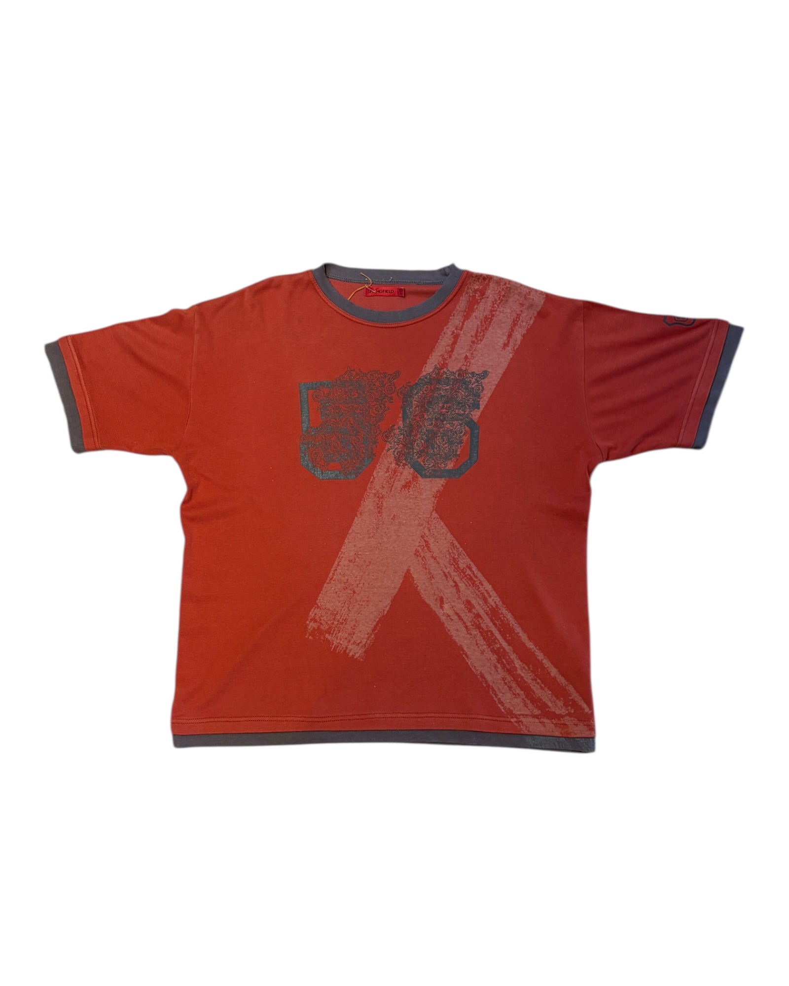 PLAYERA DE MANGA CORTA COLOR NARANJA LADRILLO CON PRINT DE NUMEROS 56 EN COLOR GRIS CON FLORES Y LINEAS BLANCAS ESTILO PINTADAS. DOBLE CAPA EN COLOR GRIS. 50% POLYESTER Y 50% ALGODON. NO TIENE DETALLES, EN PERFECTAS CONDICIONES.