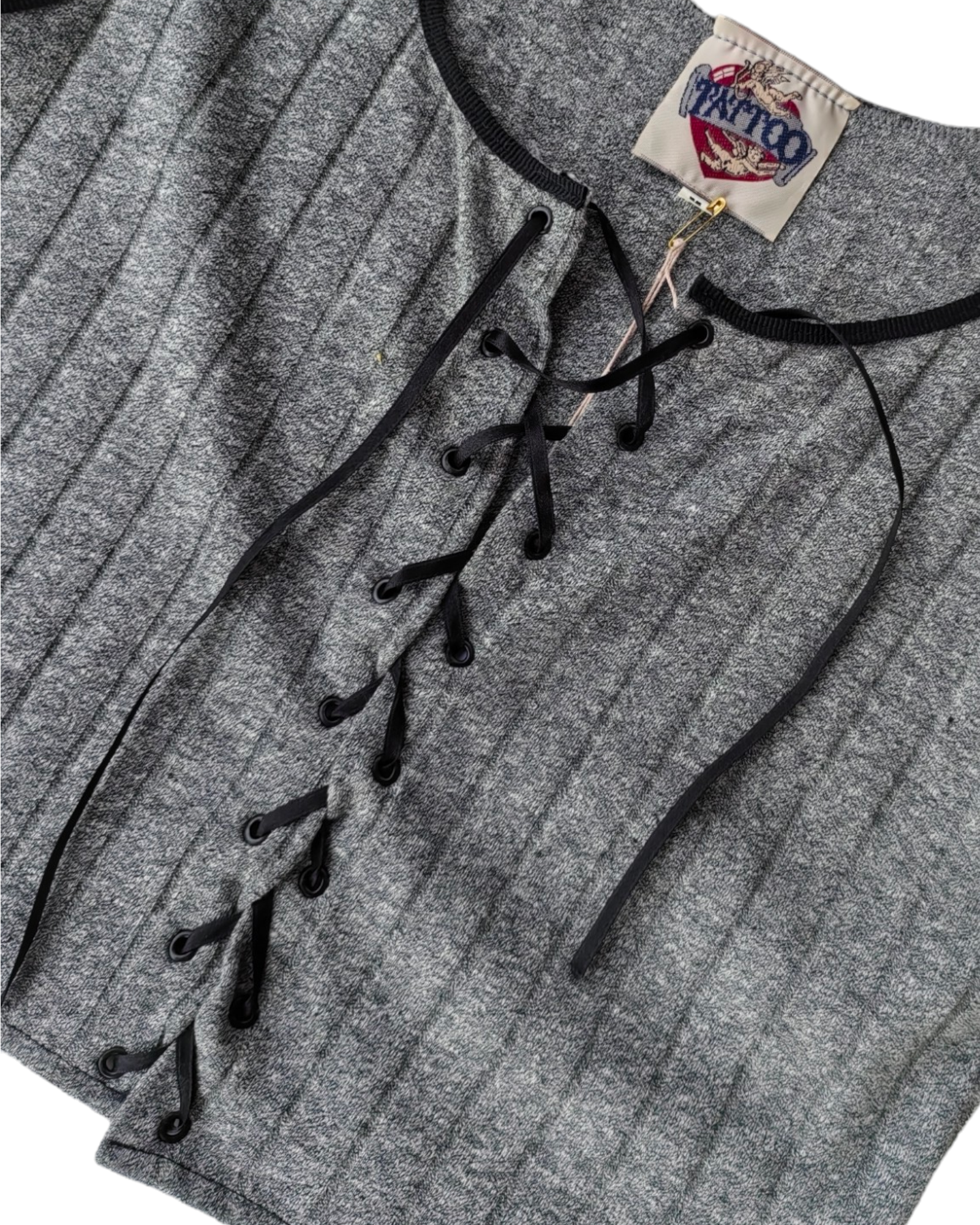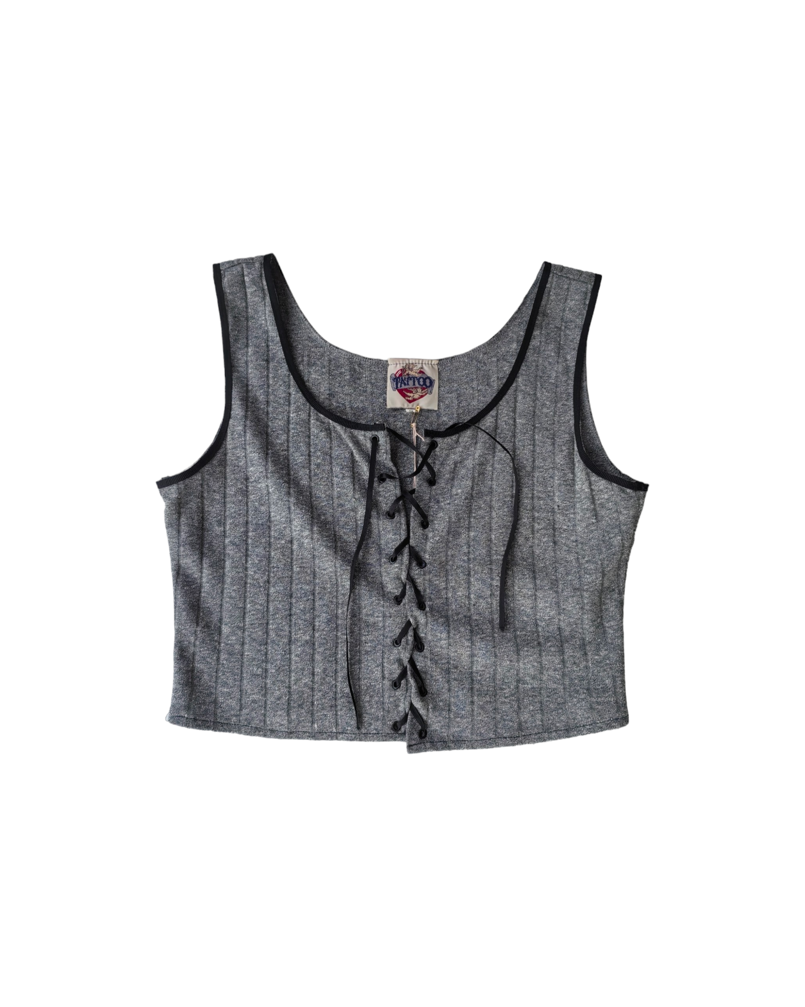TOP SIN MANGAS 50% ALGODÓN 50% POLIÉSTER COLOR GRIS CON DETALLES NEGROS EN EL CUELLO Y EL RUEDO DE LAS MANGAS, LISTÓN NEGRO PARA AMARRAR EL FRENTE TIPO CORSET. SIN DETALLES DE USO