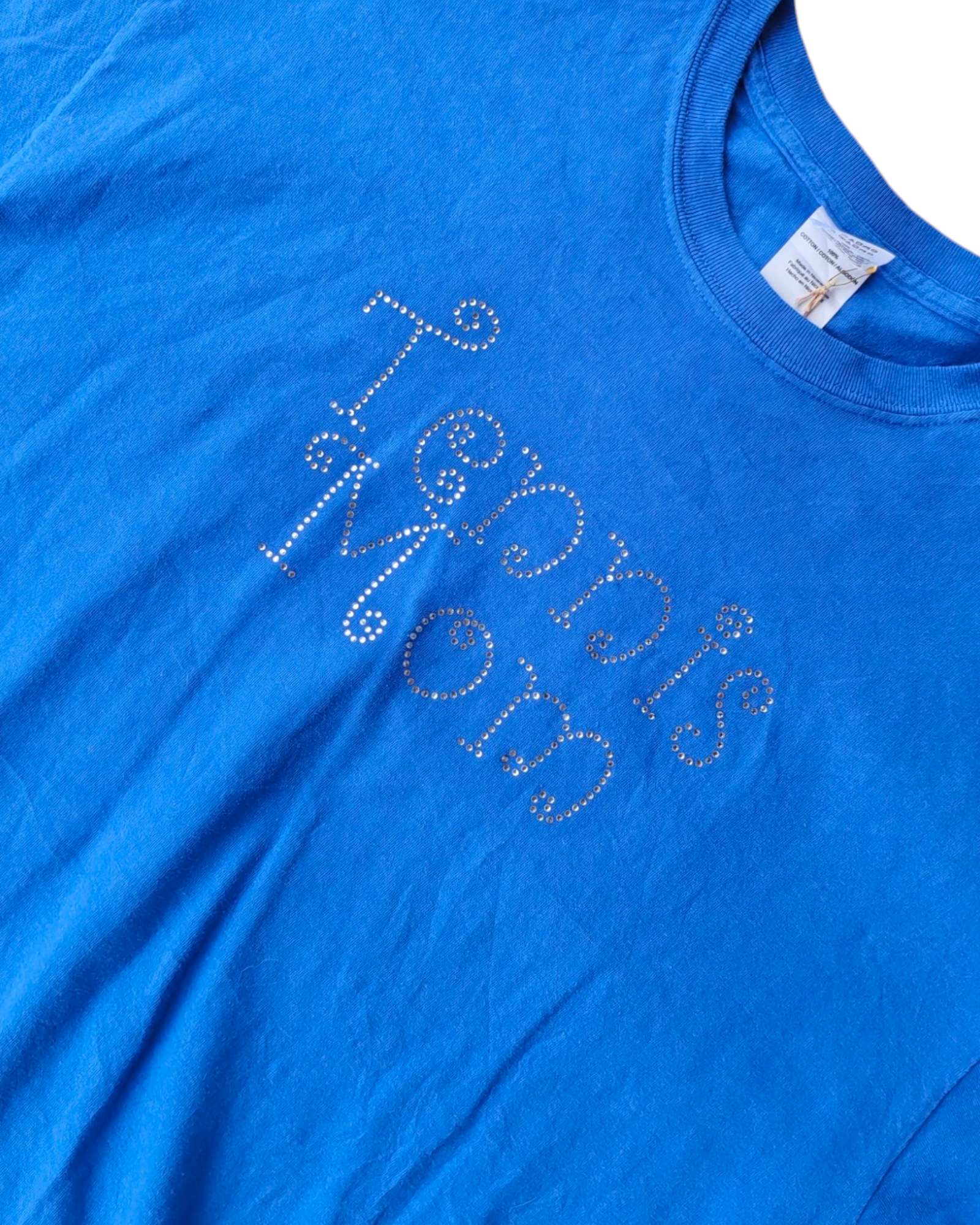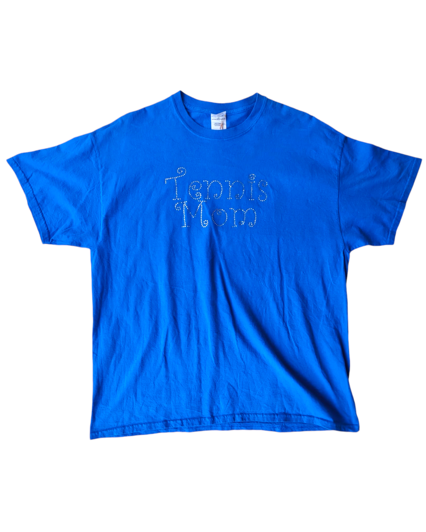 PLAYERA 100% ALGODÓN COLOR AZUL REY CON LETRAS "TENNIS MOM" ESCRITAS EN BRILLOS DE COLOR PLATEADO. SIN DETALLES DE USO.