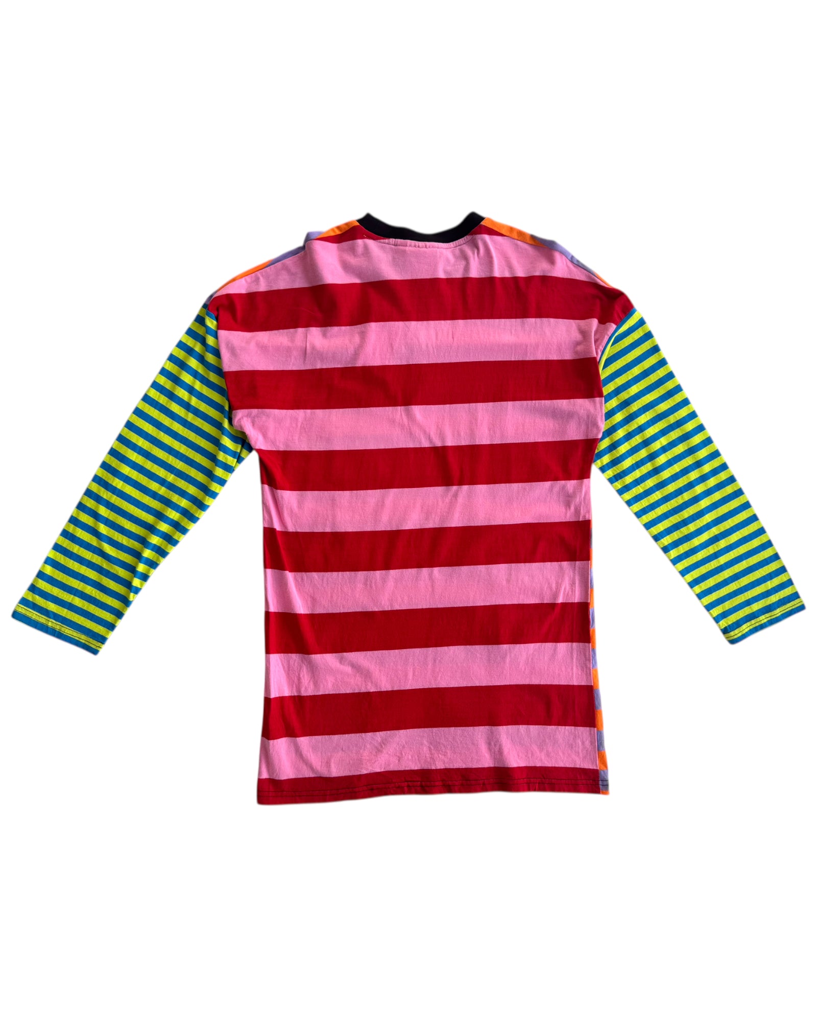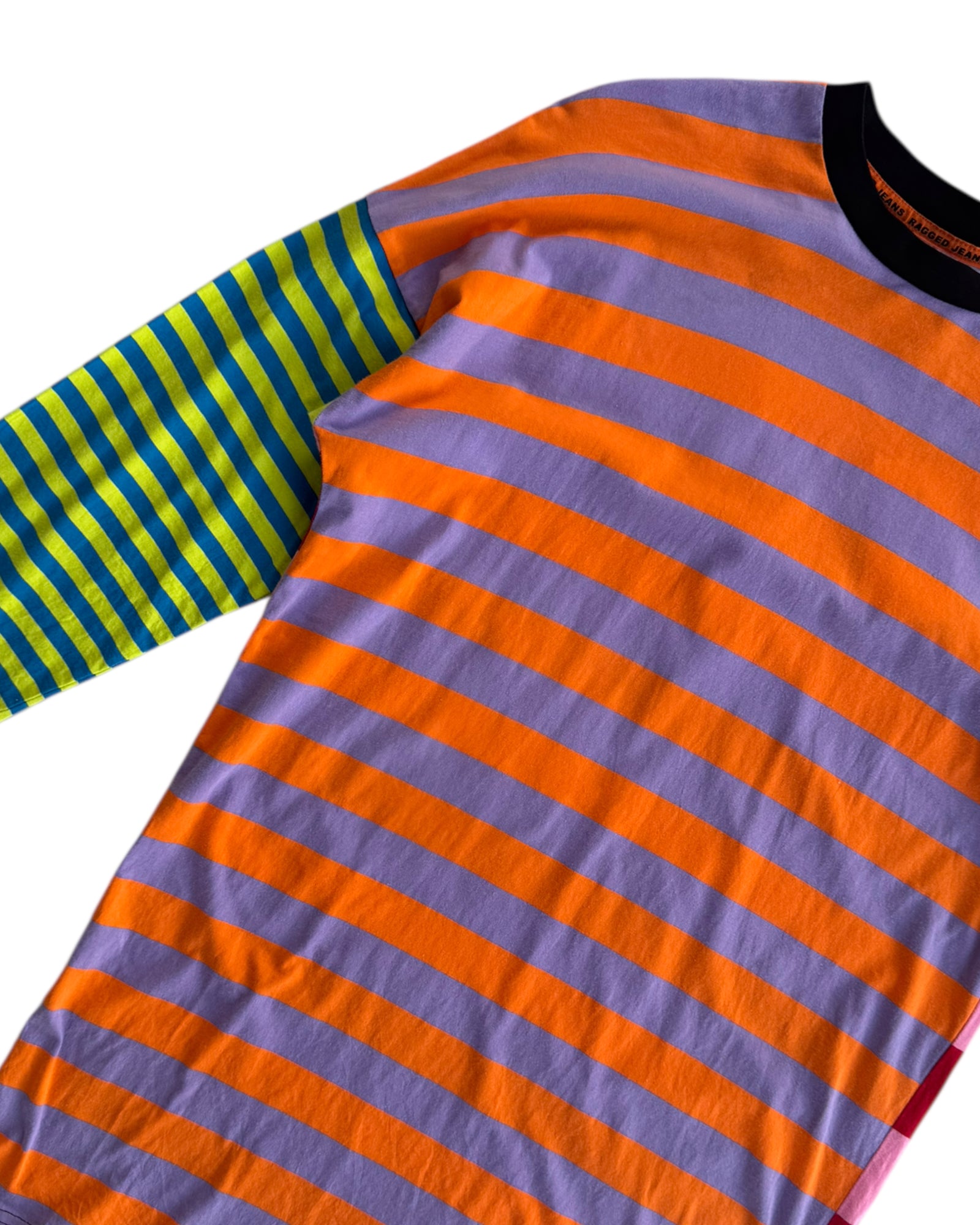 PLAYERA DE MANGA LARGA 100% ALGODÓN DE RAYAS EN DISTINTOS COLORES. PARTE FRONTAL RAYAS NARANJAS CON LILA. PARTE TRASERA RAYAS ROJAS CON ROSA. MANGAS COLOR AMARILO CON AZUL.