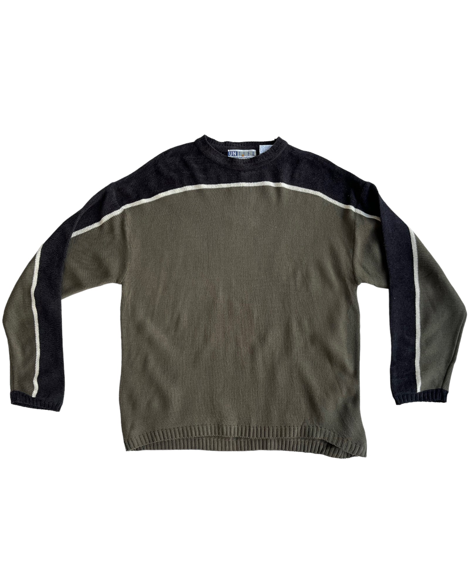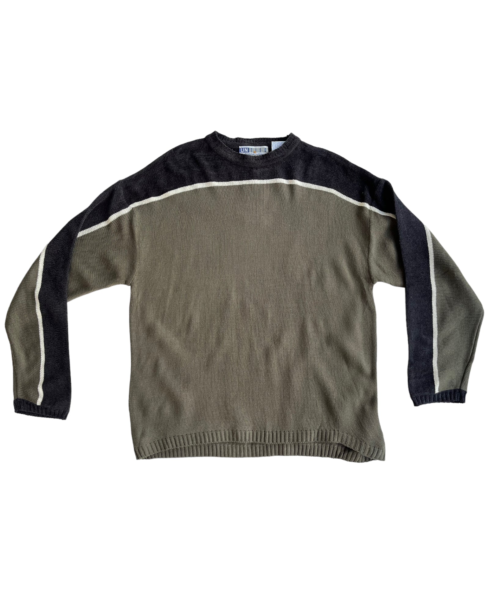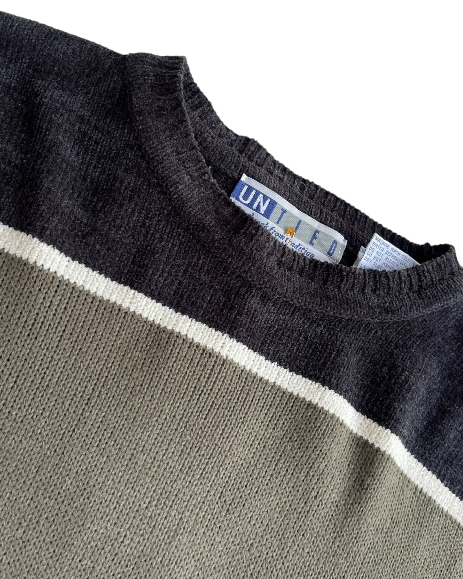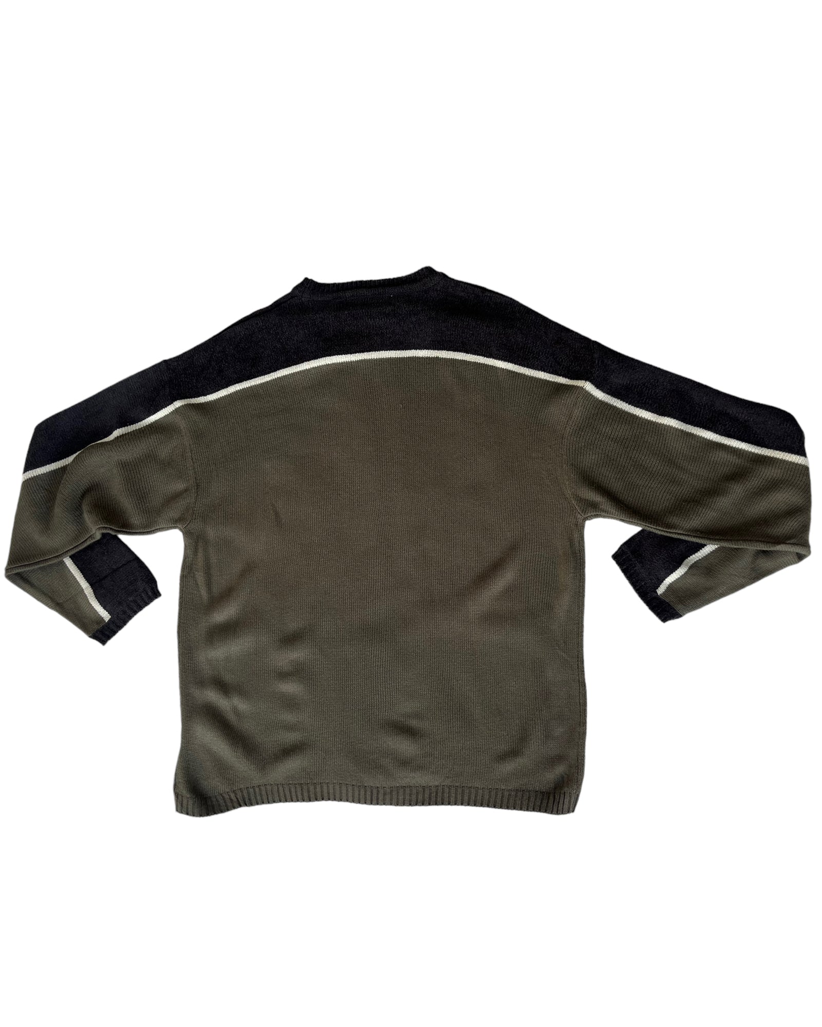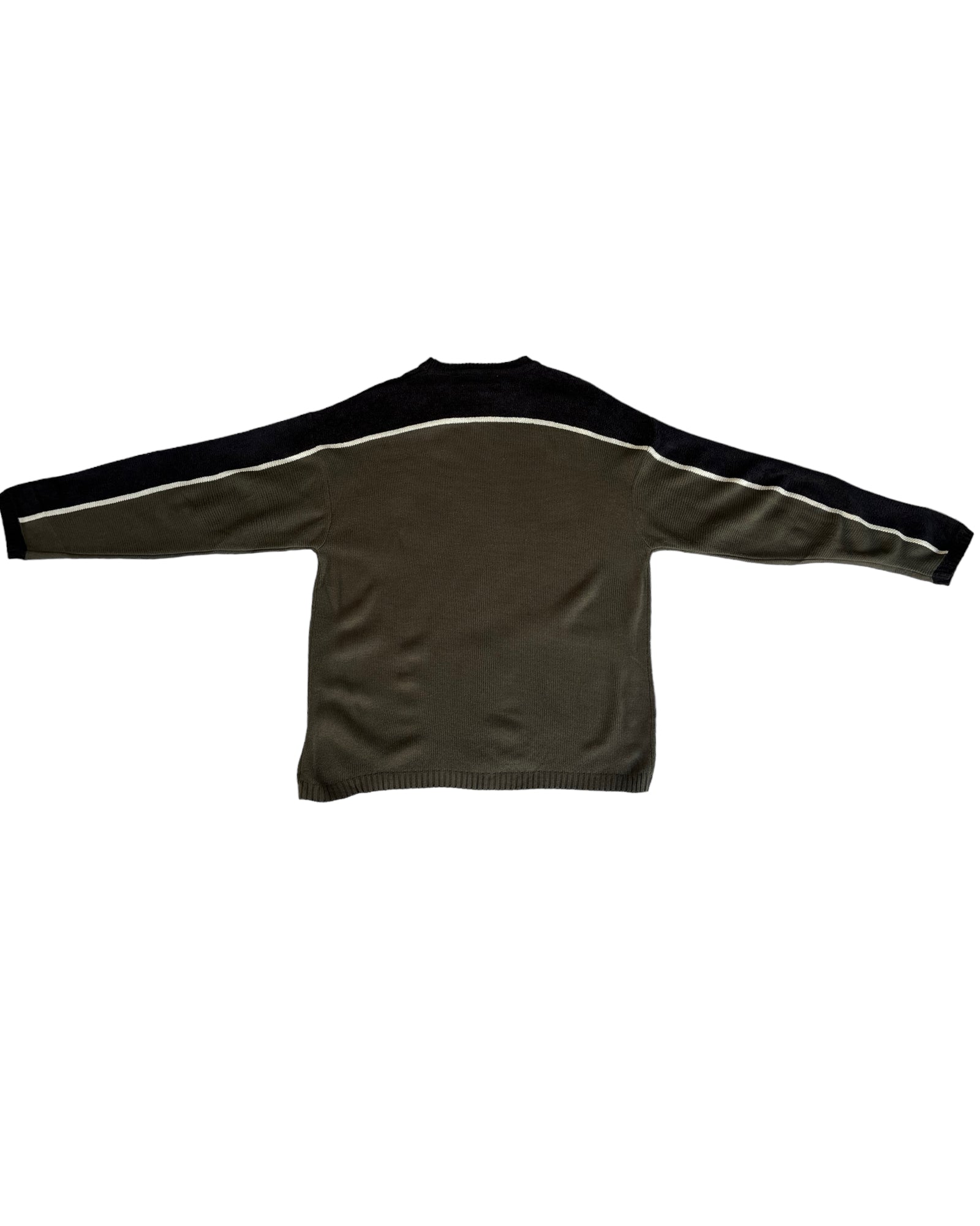 SUÉTER GRIS CLARO CON UNA RAYA BLANCA Y GRIS OSCURO DESDE EL PECHO A LAS MANGAS, 100% ACRÍLICO.