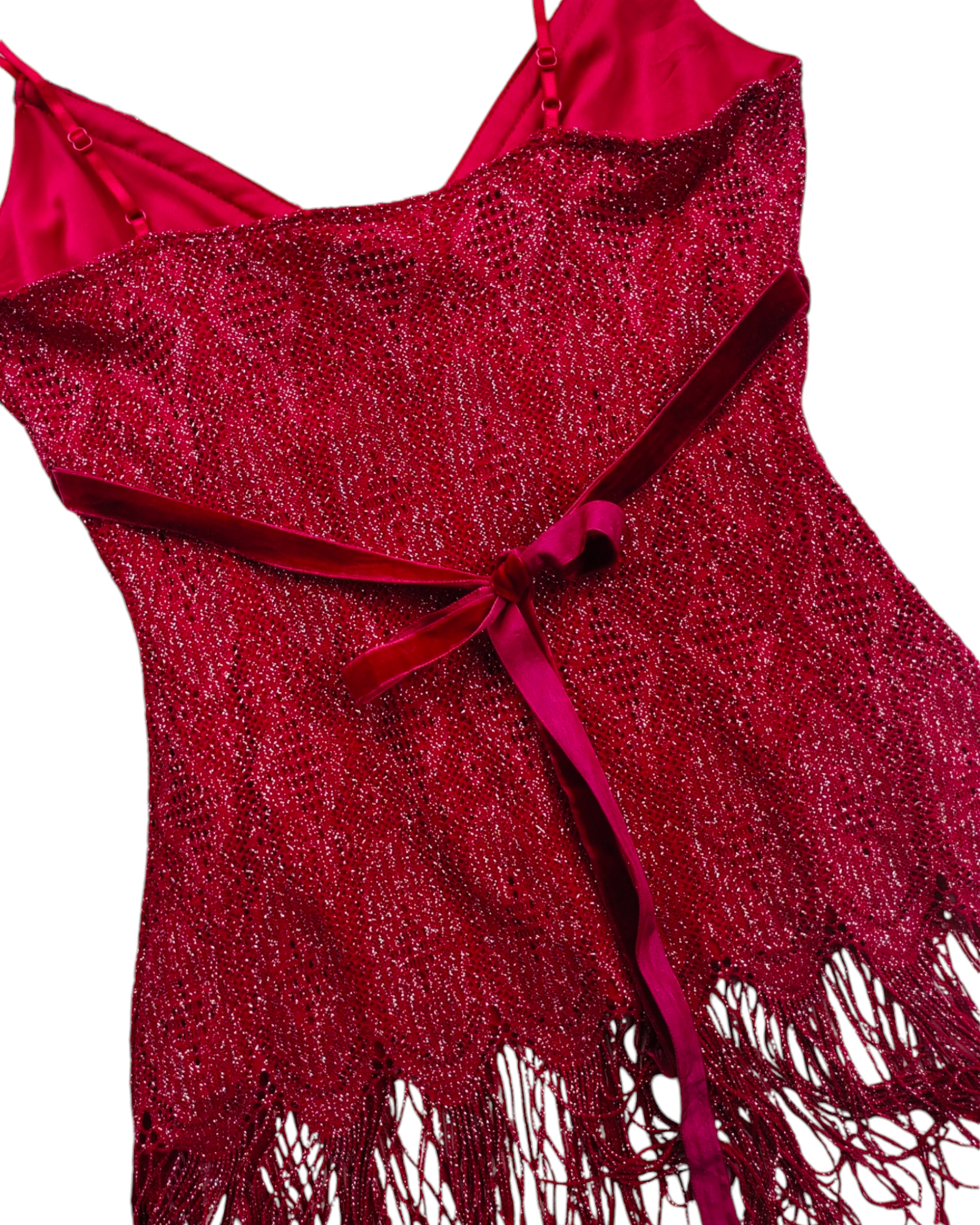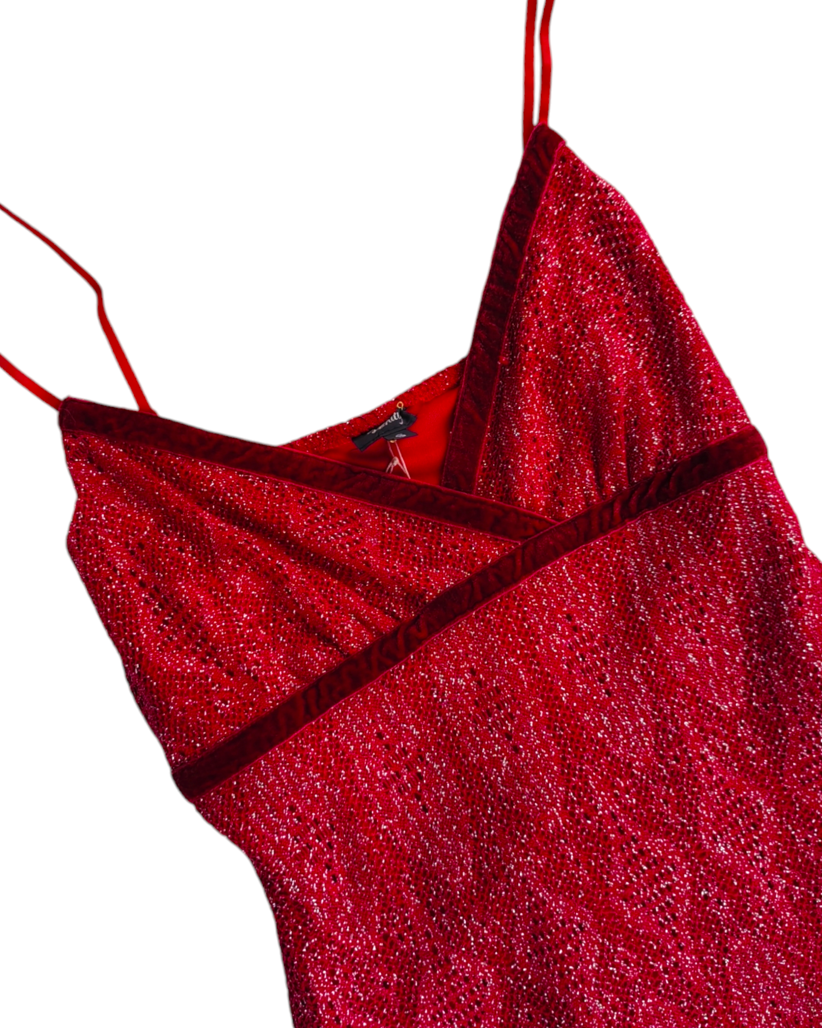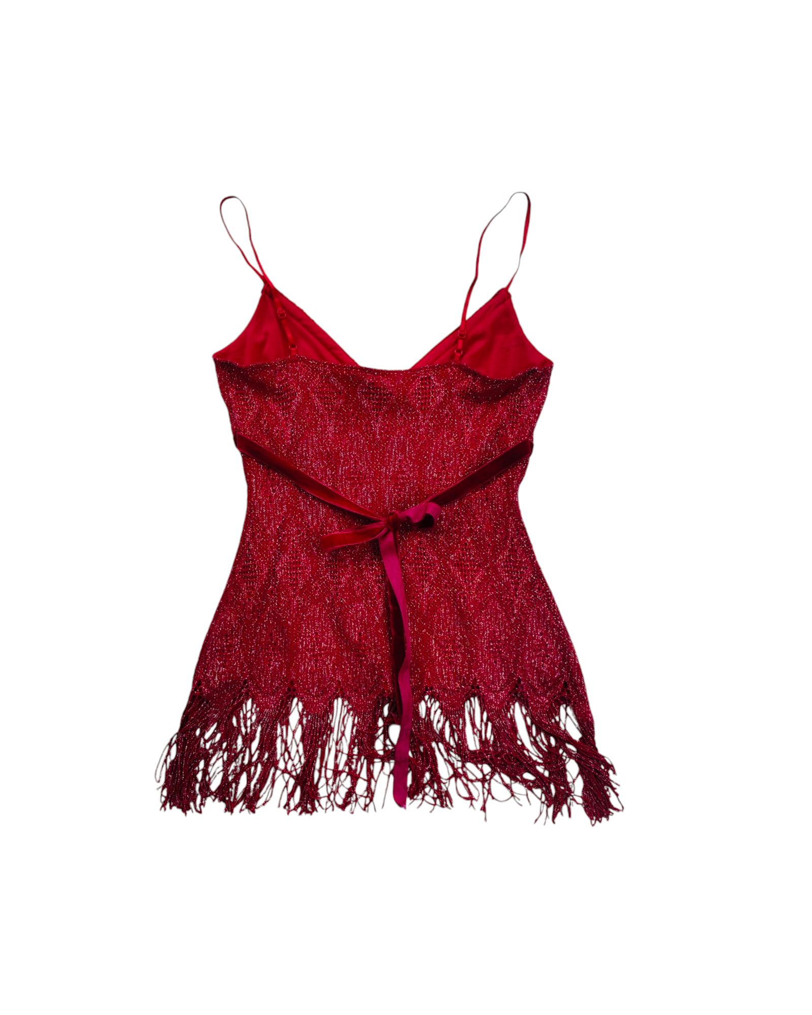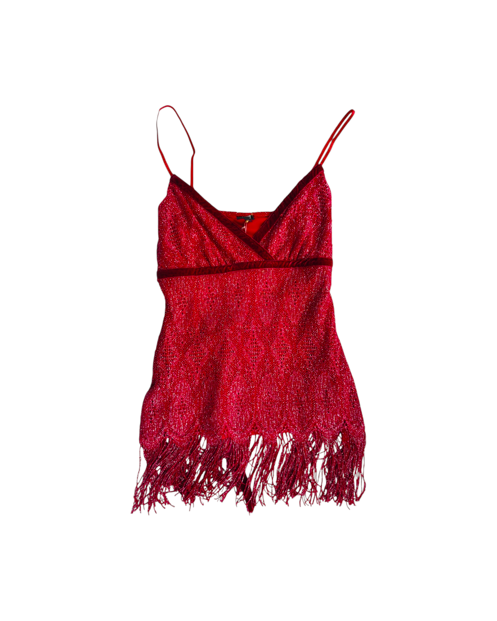 TOP SPAGUETTI STRAP AJUSTABLES 90% ACETATO 10% LUREX, FORRO 100% POLIÉSTER, COLOR ROJO CON FIBRAS BRILLANTES DORADAS, , DETALLES EN EL ESCOTE Y LA CINTURA DE TERCIOPELO, LISTÓN DE TERCIOPELO PARA AJUSTAR LA ESPALDA. FLECOS INFERIORES. SIN DETALLES DE USO.