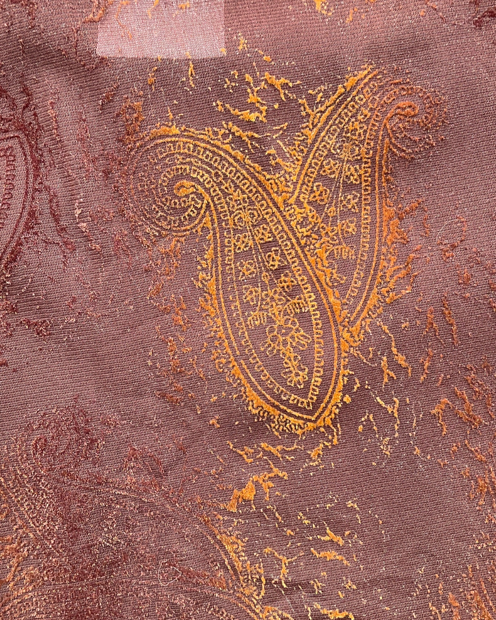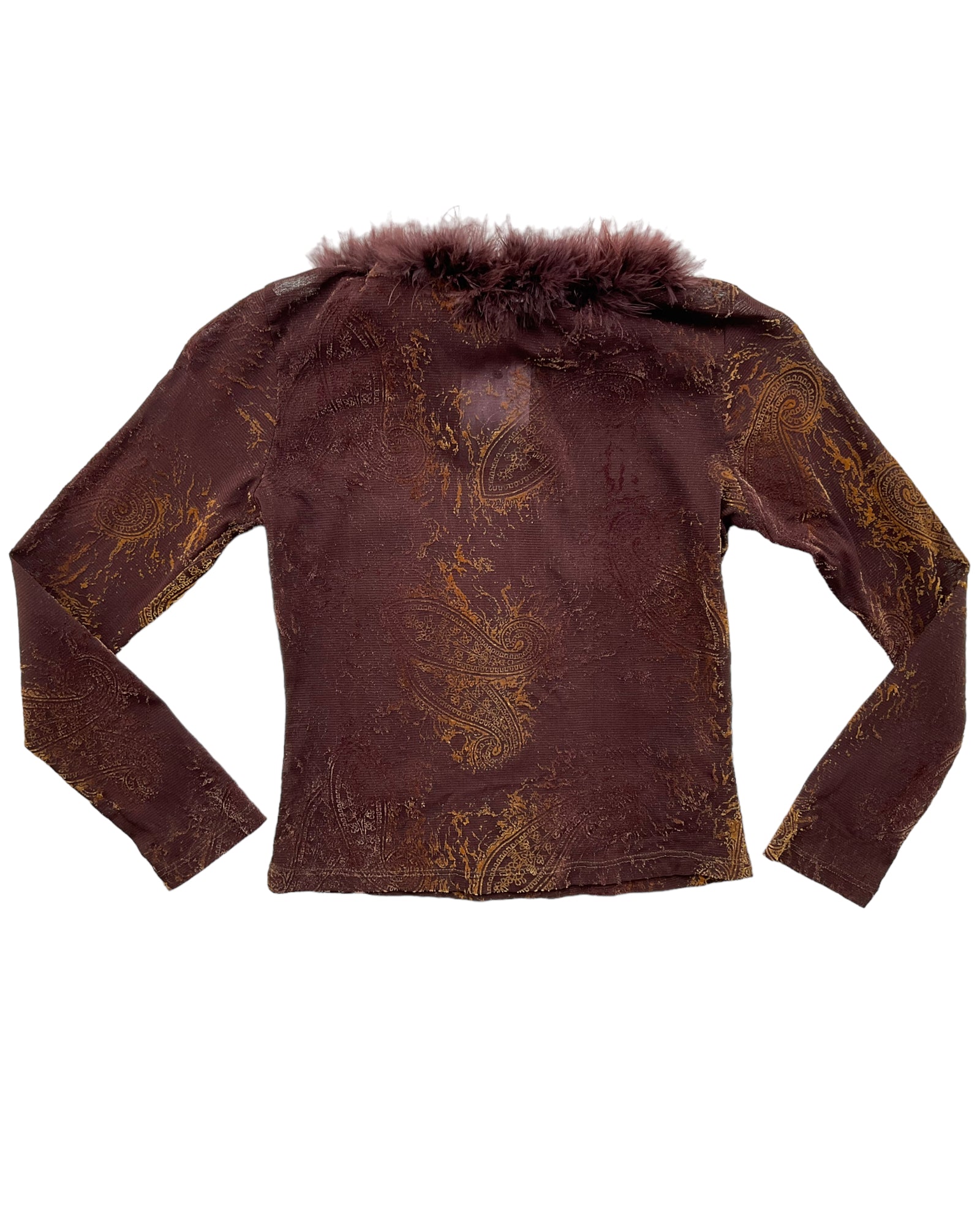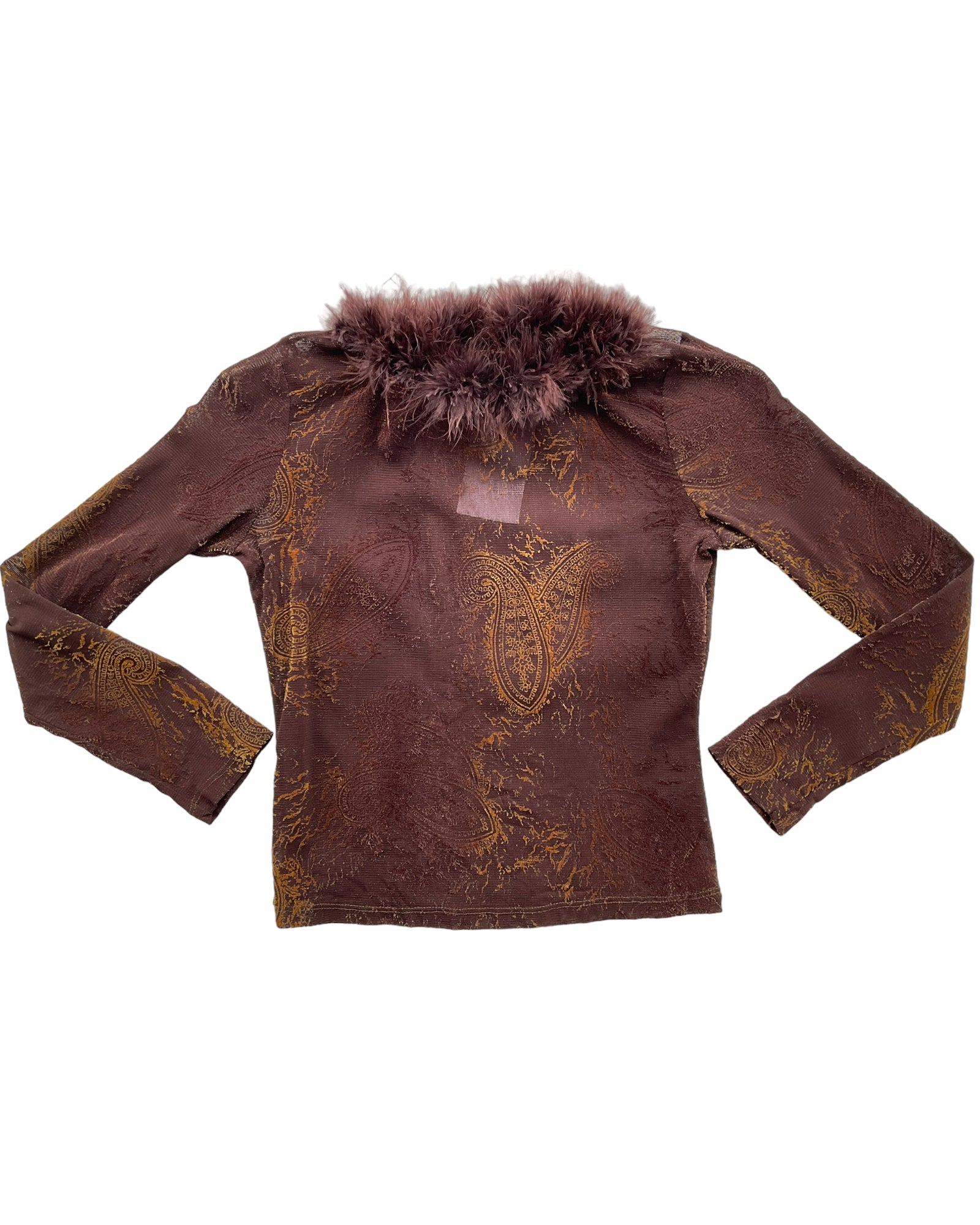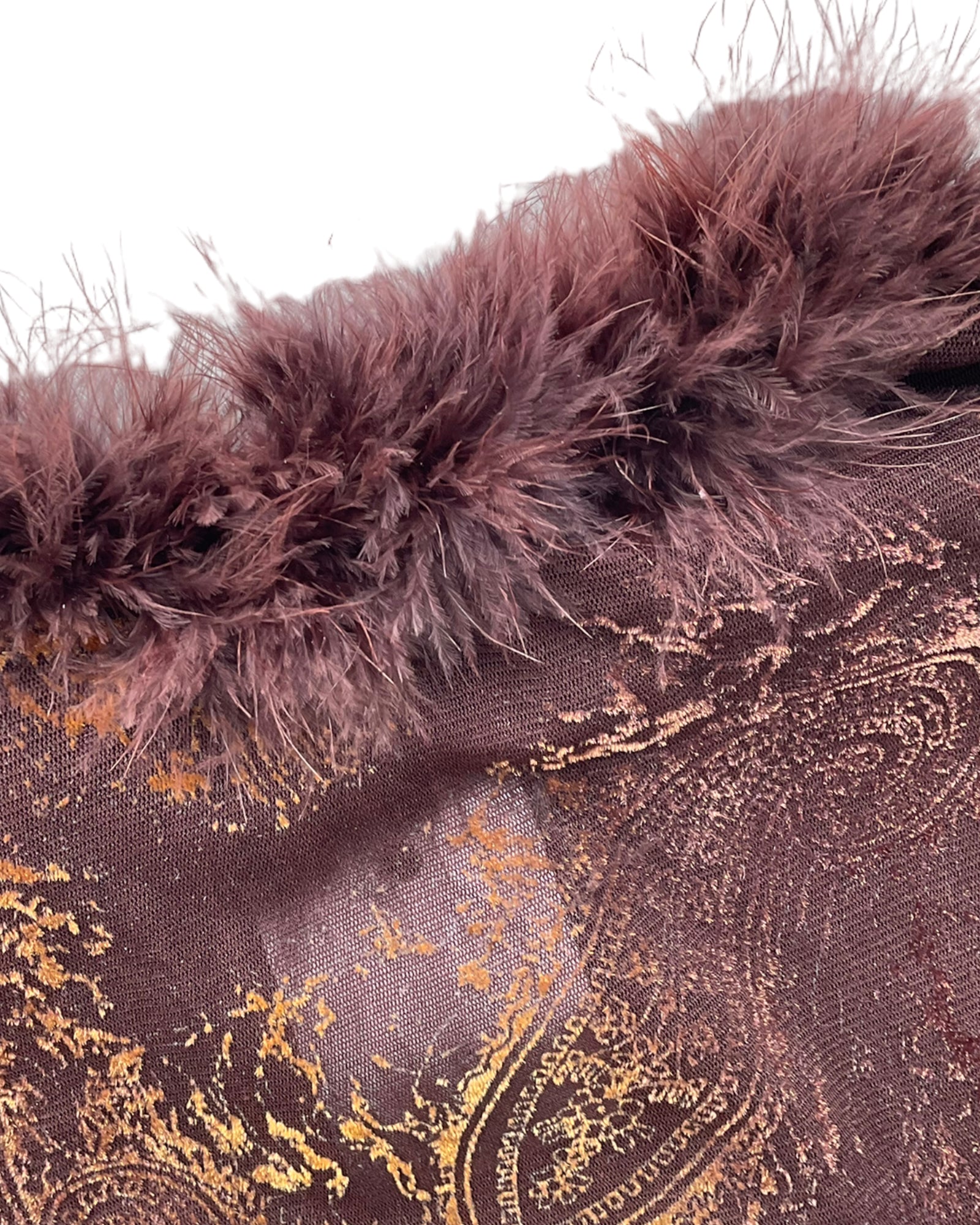 TOP DE MALLA COLOR CAFÉ CON PATRONES DE BACTERIAS EN RELIEVE EN COLOR DORADO Y EL CUELLO CUBIERTO DE PLUMAS COLOR CAFÉ. SIN DETALLES DE USO