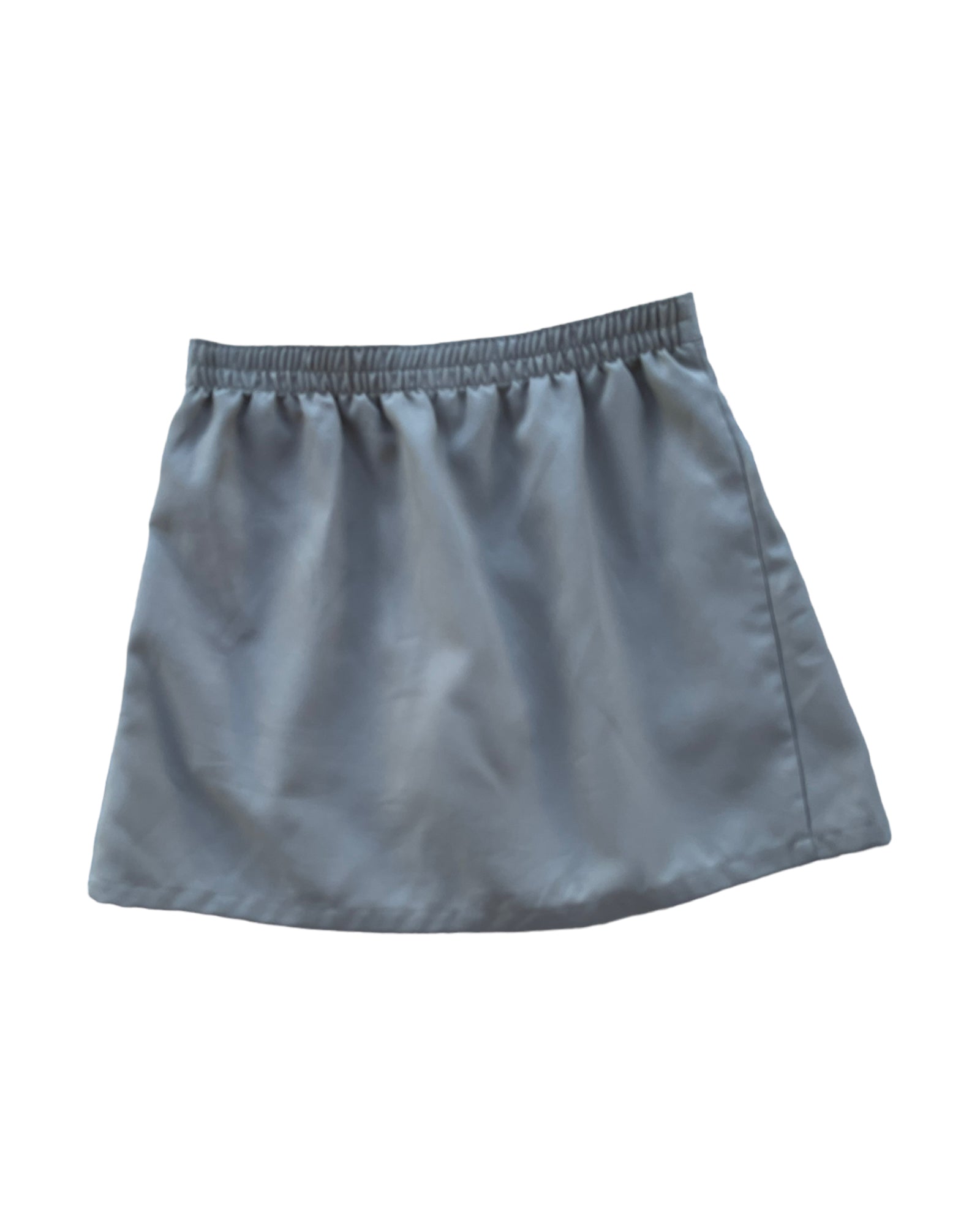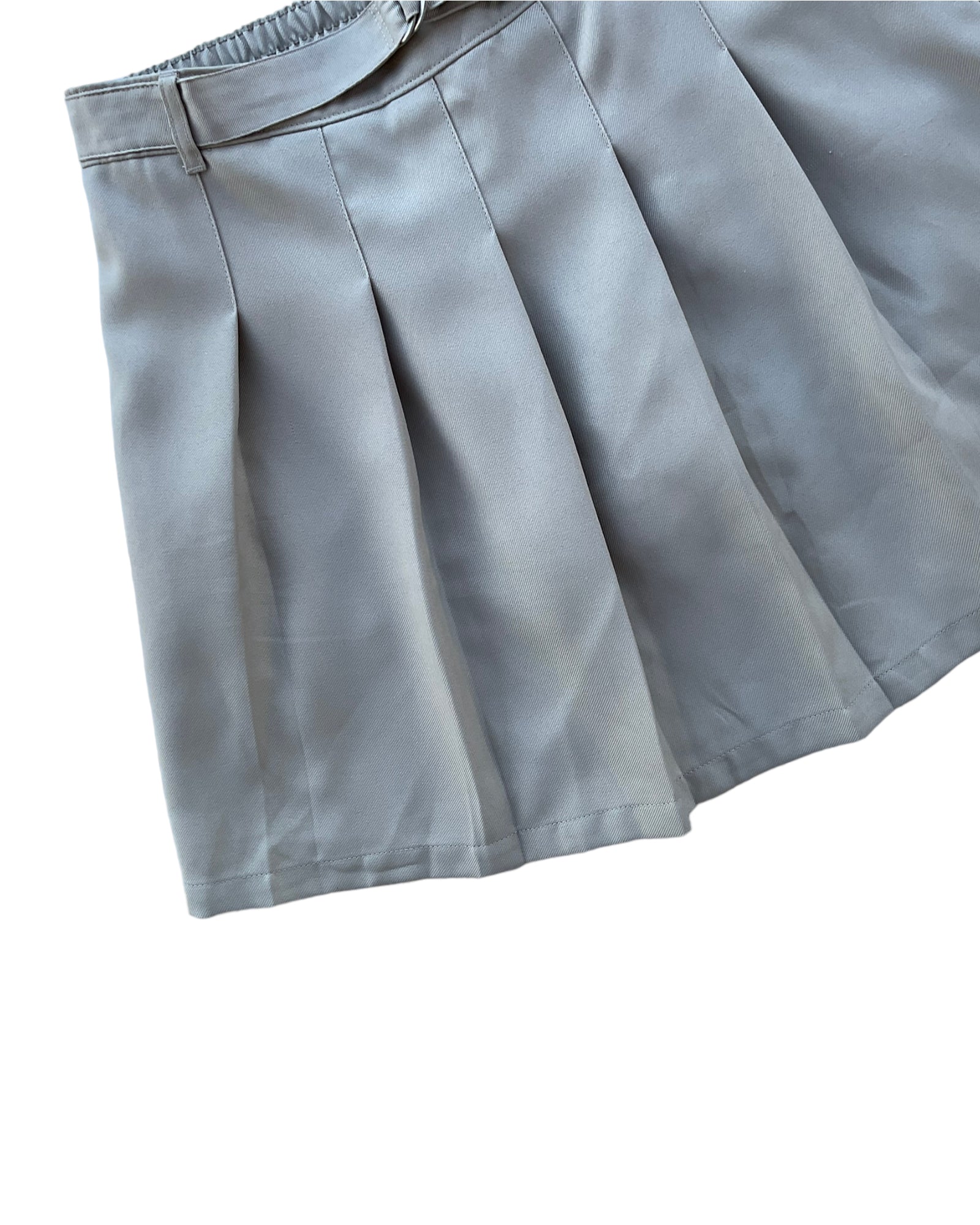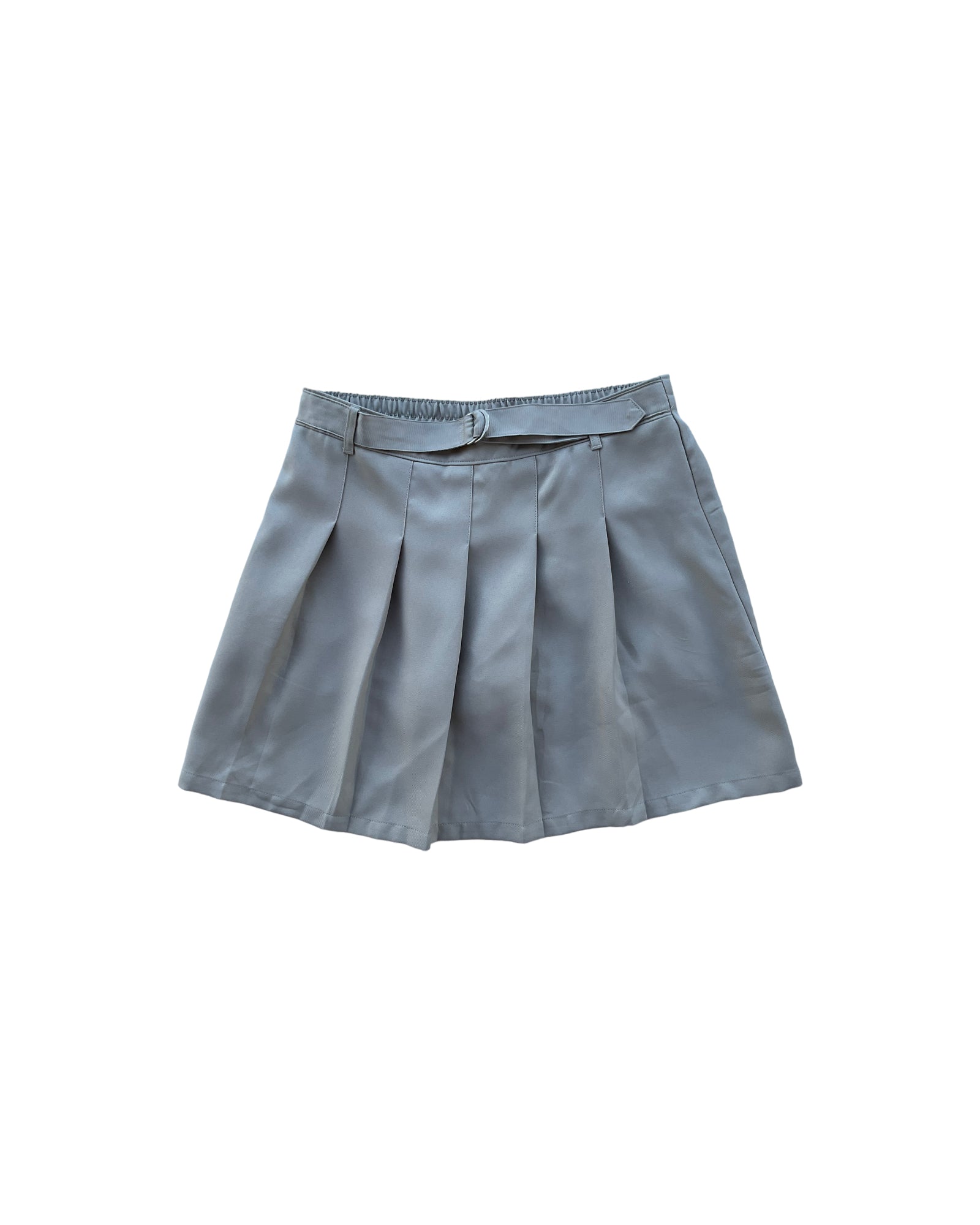 FALDA SHORT COLOR BEIGE 100% POLIÉSTER, CON ELÁSTICO EN LA PARTE TRASERA Y UN CINTURÓN INTEGRADO CON HEBILLA PLATEADA. SIN DETALLES DE USO