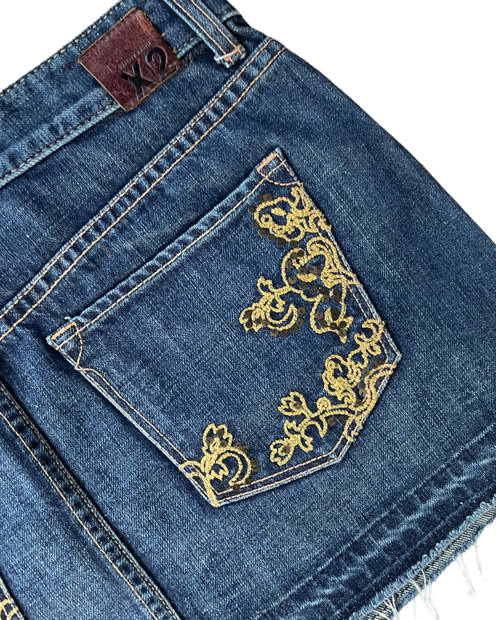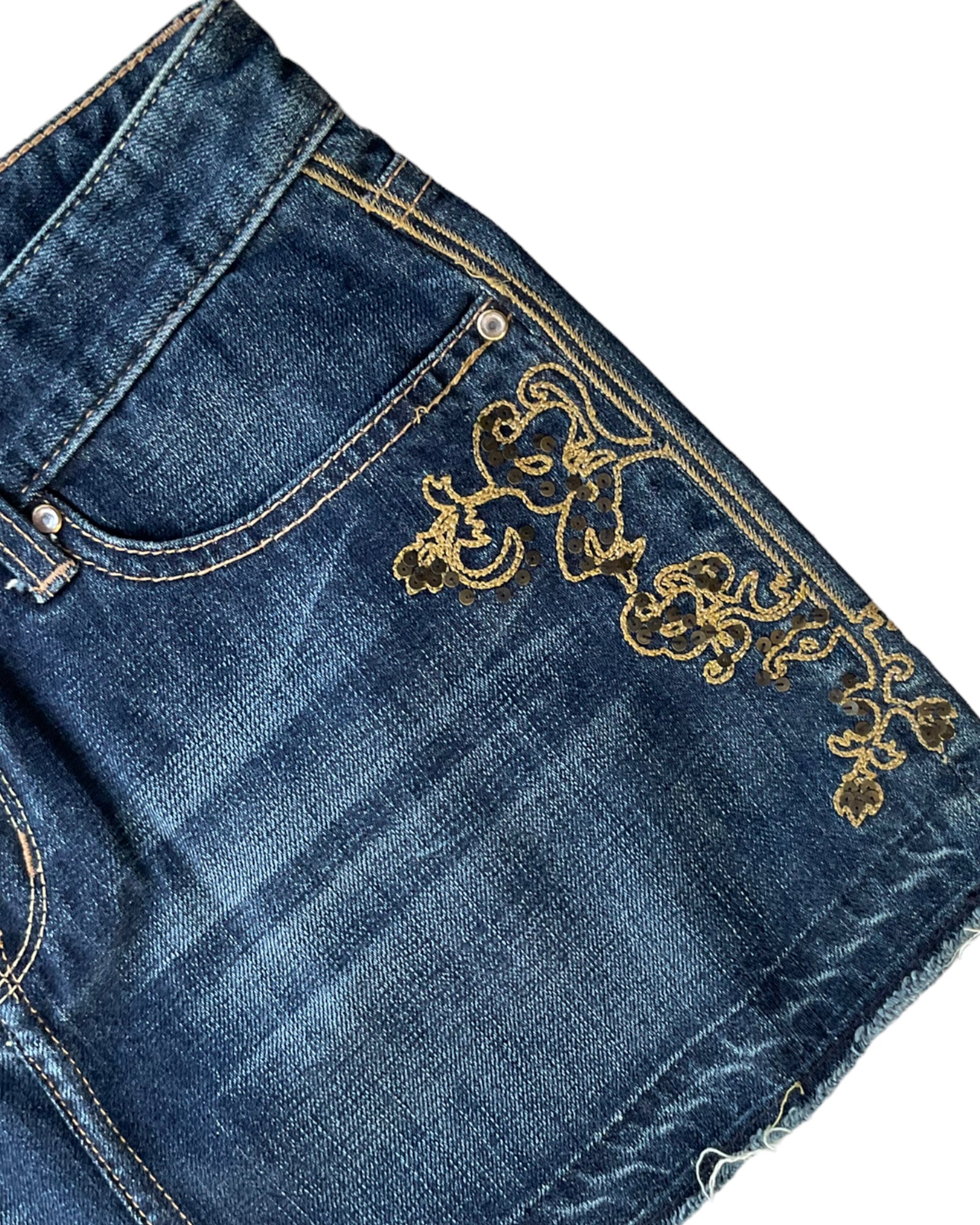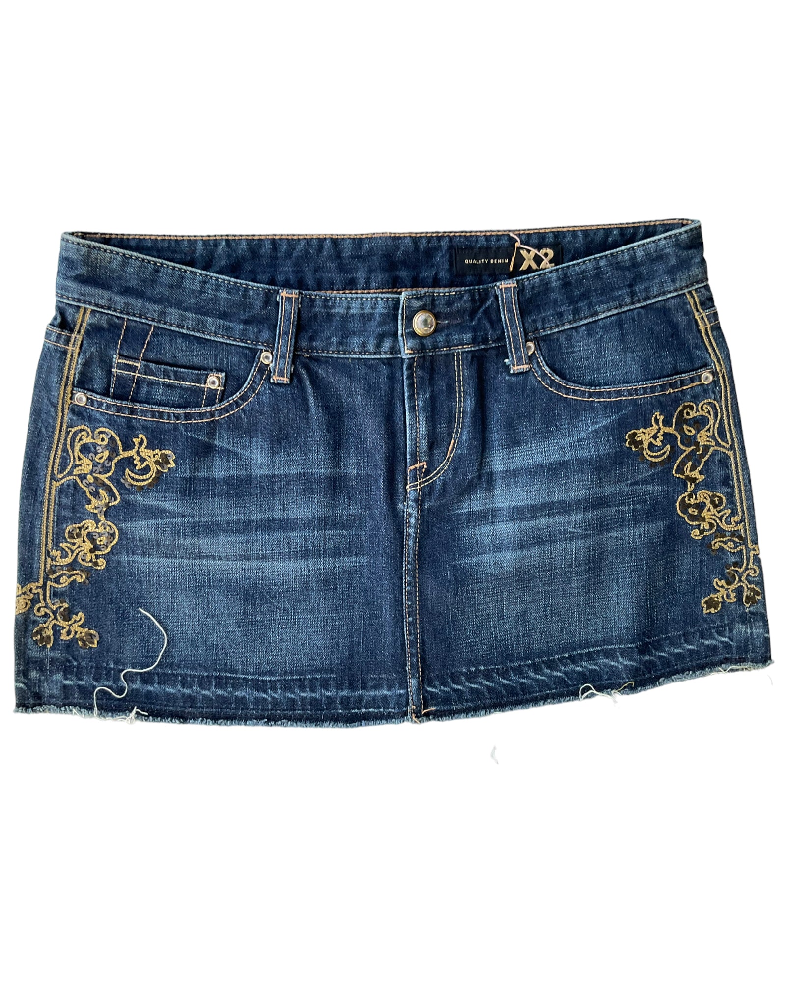 MINI FALDA DE MEZCLILLA AZUL OSCURO DESLAVADO, CORTE BAJO CON CIERRE Y GEMA EN EL BOTÓN. BORDADO DORADO CON LENTEJUELAS A LOS COSTADOS Y GEMAS EN LAS UNIONES. DOS BOLSILLOS DELANTEROS Y DOS BOLSILLOS TRASEROS CON PATRÓN BORDADO DORADO. DOBLADILLO DESHILACHADO 100% ALGODÓN