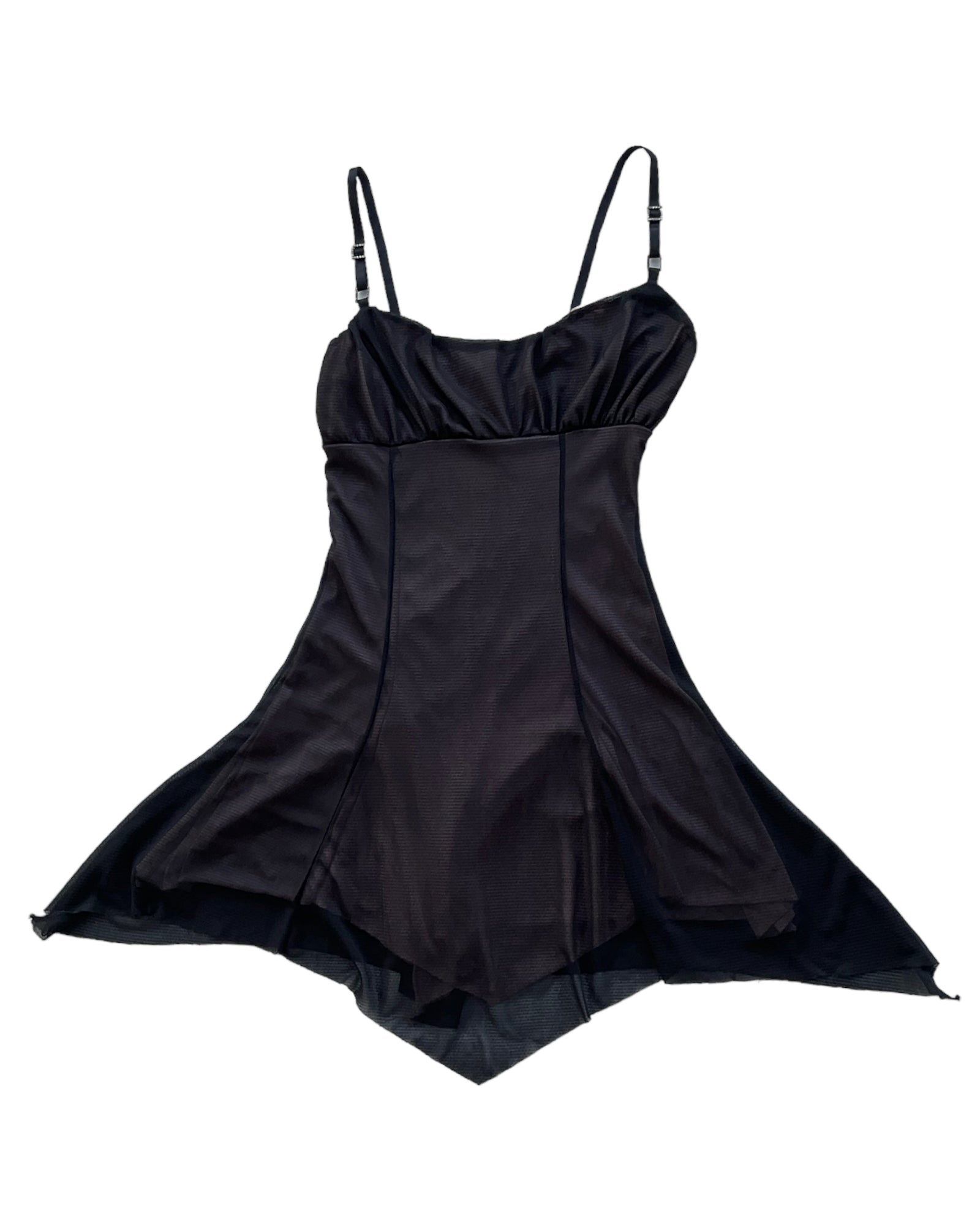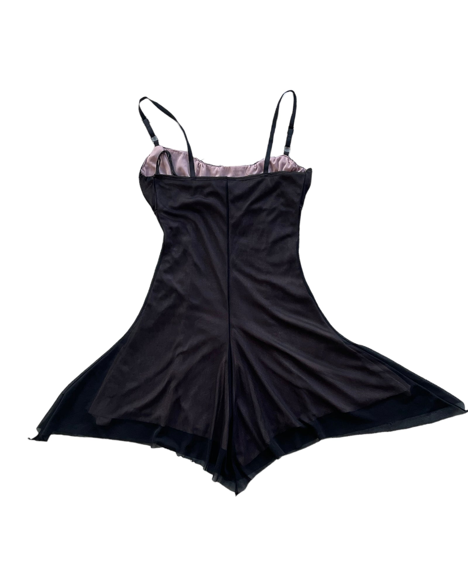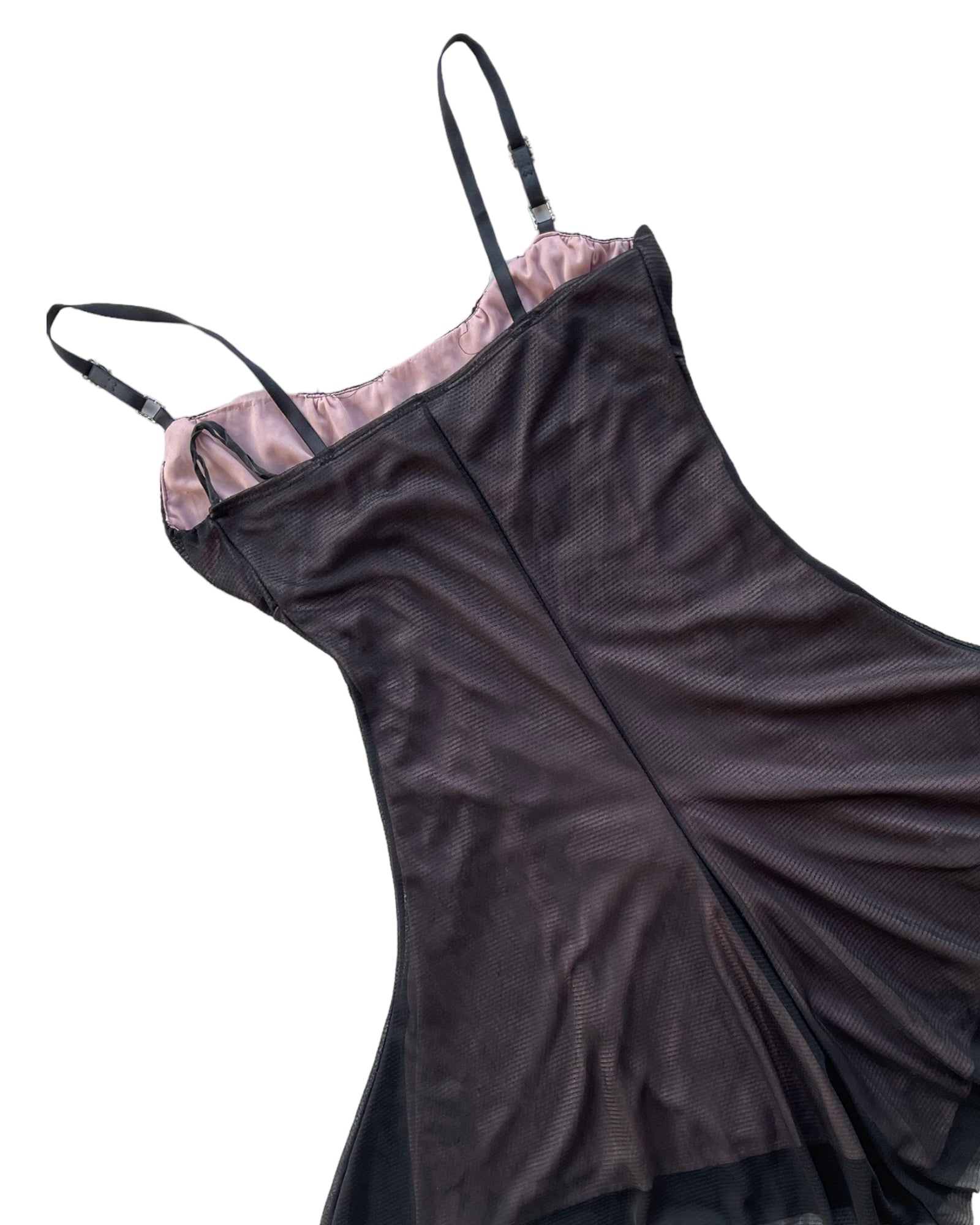 VESTIDO DE TIRANTES COLOR ROSA RECUBIERTO CON MAYA NEGRA. TIRANTES AJUSTABLES CON BRILLOS.