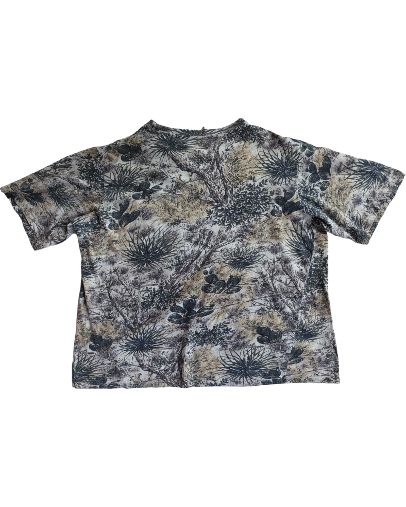 PLAYERA 100% ALGODÓN CON BOLSILLO FRONTAL. ESTAMPADO DE NATURALEZA DESÉRTICA EN TONOS DE VERDE. PEQUEÑO AGUJERO EN LA ESQUINA DEL BOLSILLO Y DESGASTE DE LOS COLORES.