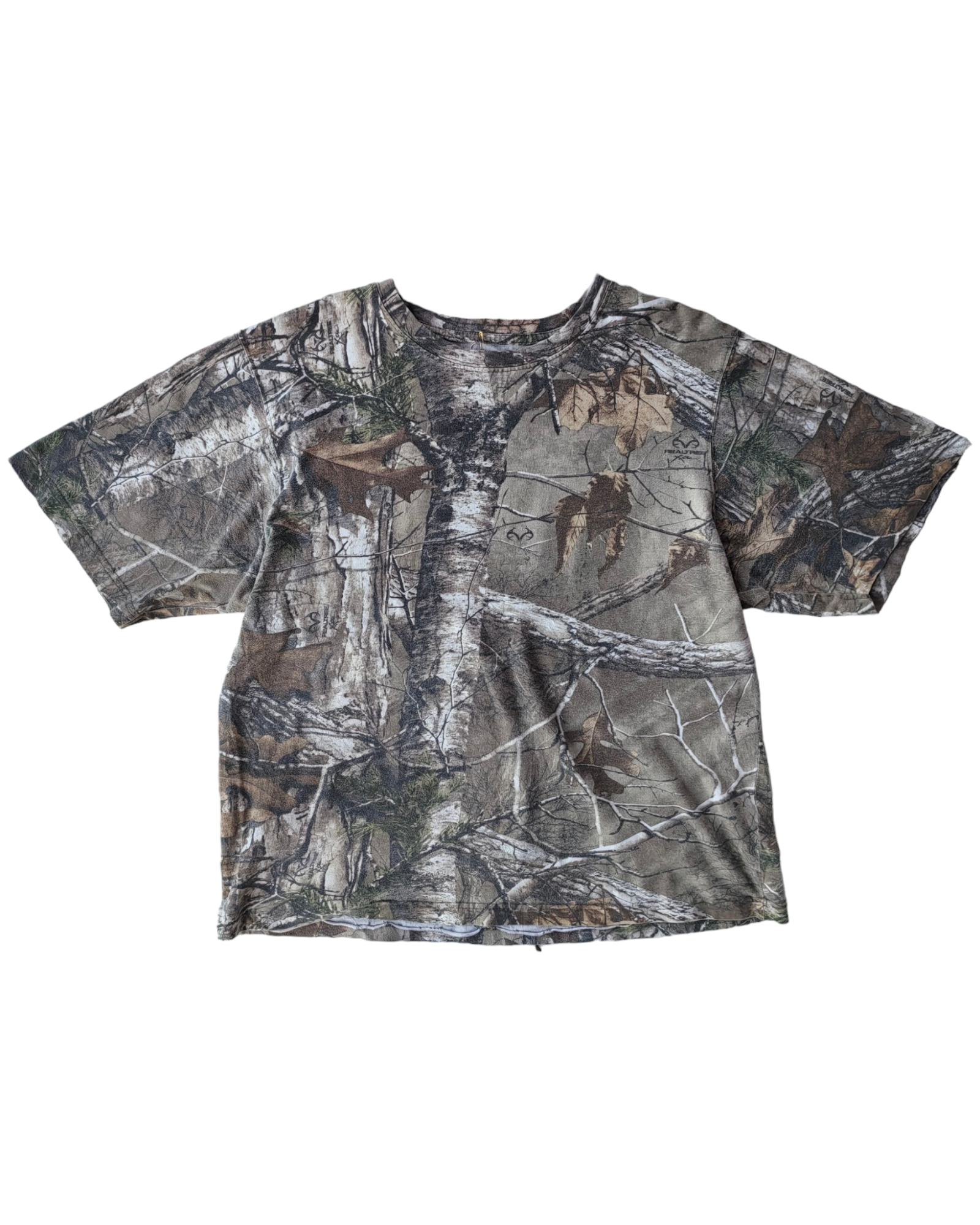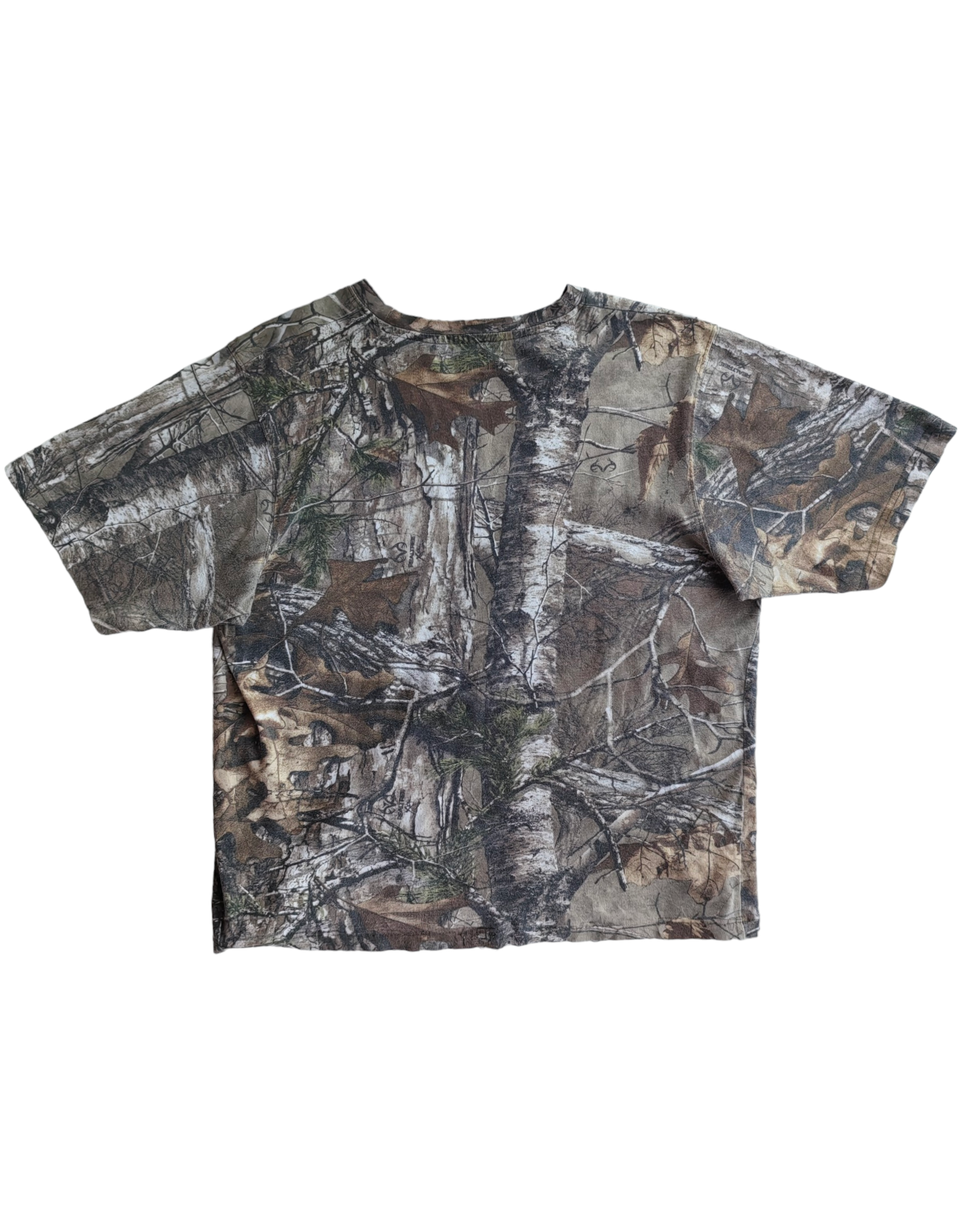 PLAYERA 100% ALGODÓN CON ESTAMPADO DE HOJAS SECAS TIPO CAMUFLAJE. ESTAMPA DE "REALTREE" DISTRIBUIDA EN EL PATRÓN. LIGERO DESGASTE EN LOS COLORES Y BOLITAS EN LA MANGA DERECHA.