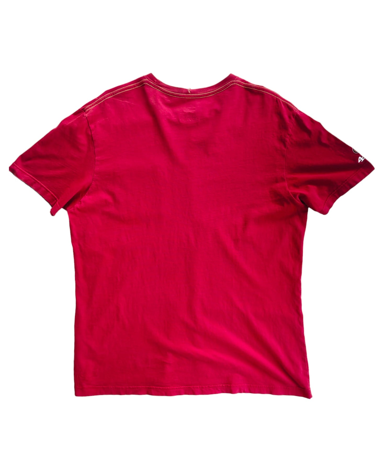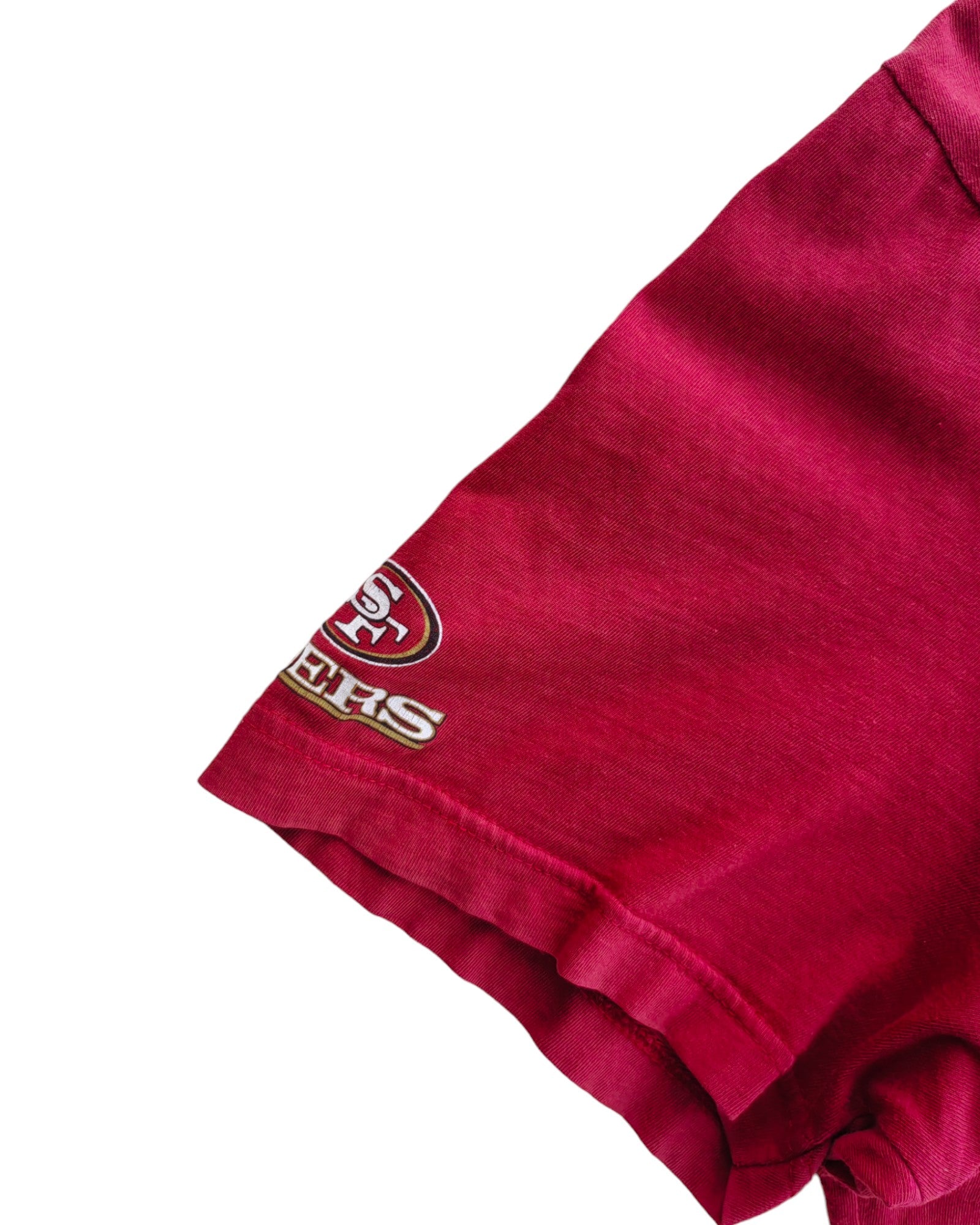 CAMISETA DE COLOR VINO, 1 BOLSILLO FRONTAL CON EL LOGO DEL SAN FRANCISCO FOOTBALL CON DETALLES DORADOS. "SF 49ERS" EN LA MANGA DERECHA. LIGERO DESGASTE EN EL ESTAMPADO Y PEQUEÑOS AGUJEROS EN LA PARTE INFERIOR.