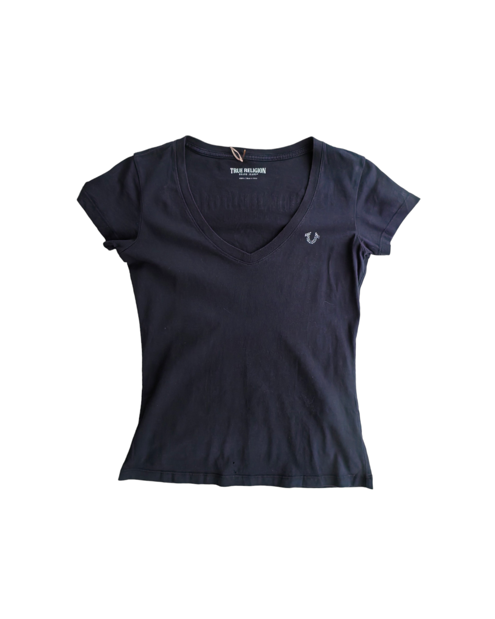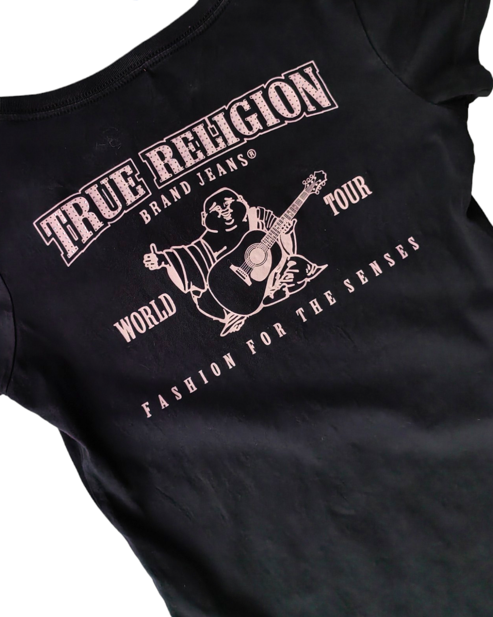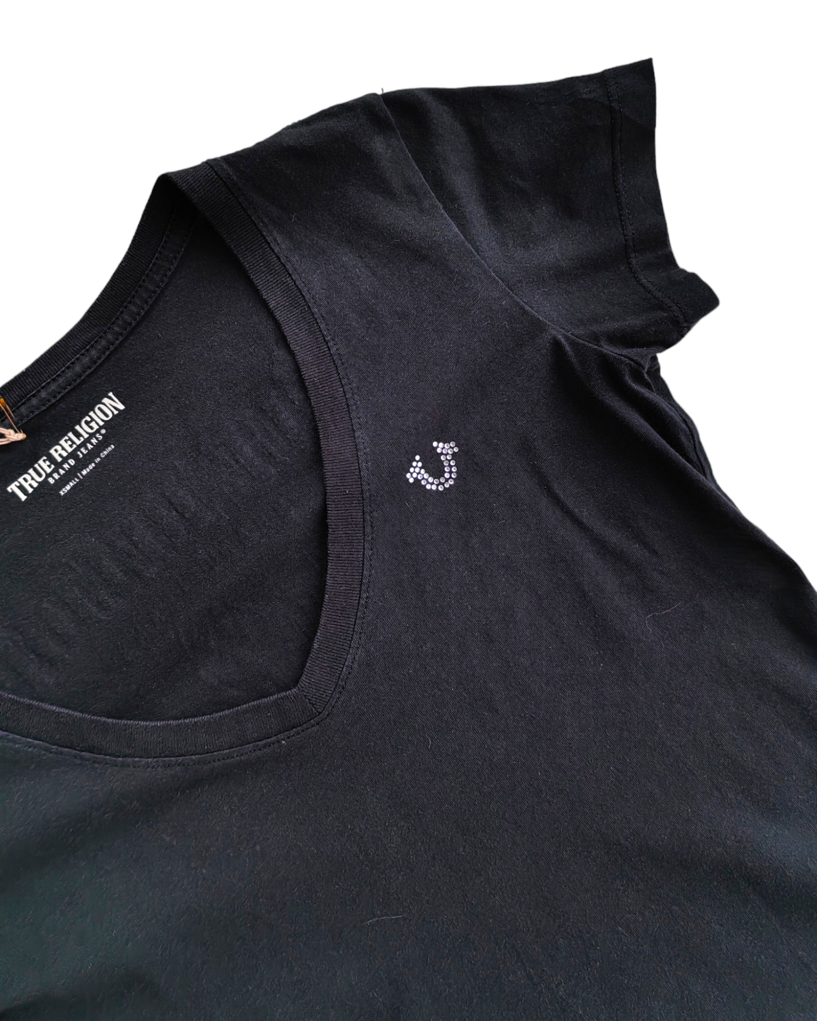 BLUSA 100% ALGODÓN COLOR NEGRO DE CUELLO EN V, HERRADURA HECHA CON BRILLOS EN EL PECHO. ESTAMPADO EN LA ESPALDA DE "TRUE RELIGION BRAND JEANS, WORLD TOUR FASHION FOR THE SENSES" EN COLOR ROSA CON DETALLES DE BRILLOS. ALGUNOS BRILLOS CAIDOS EN LA ESPALDA.