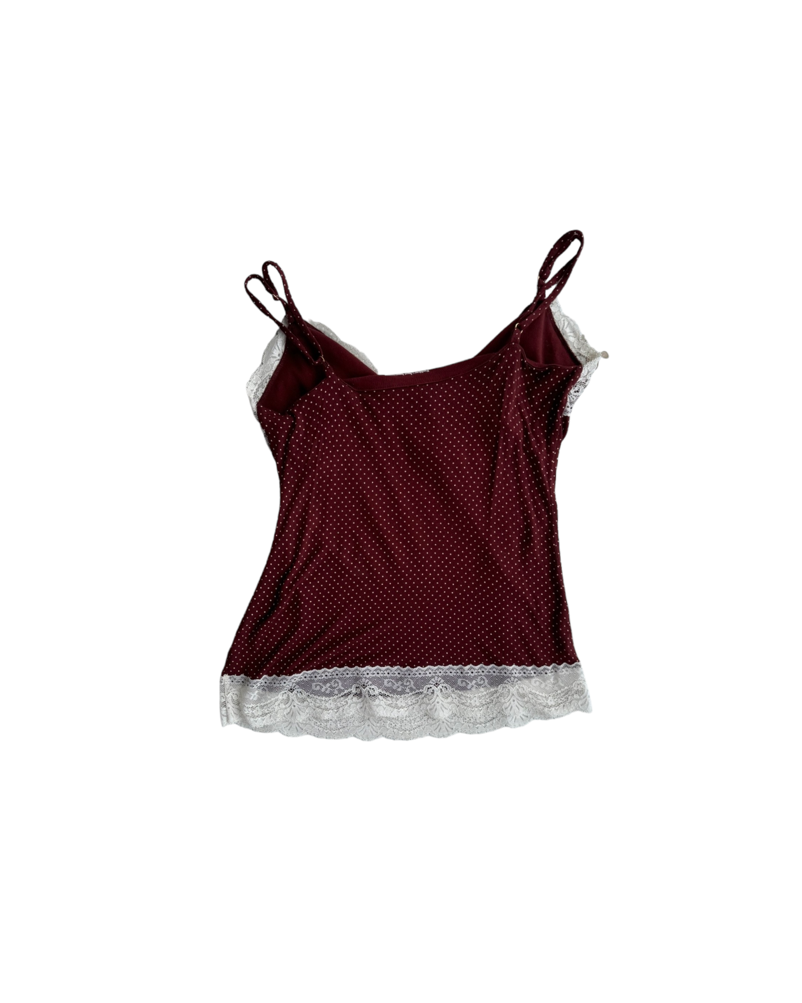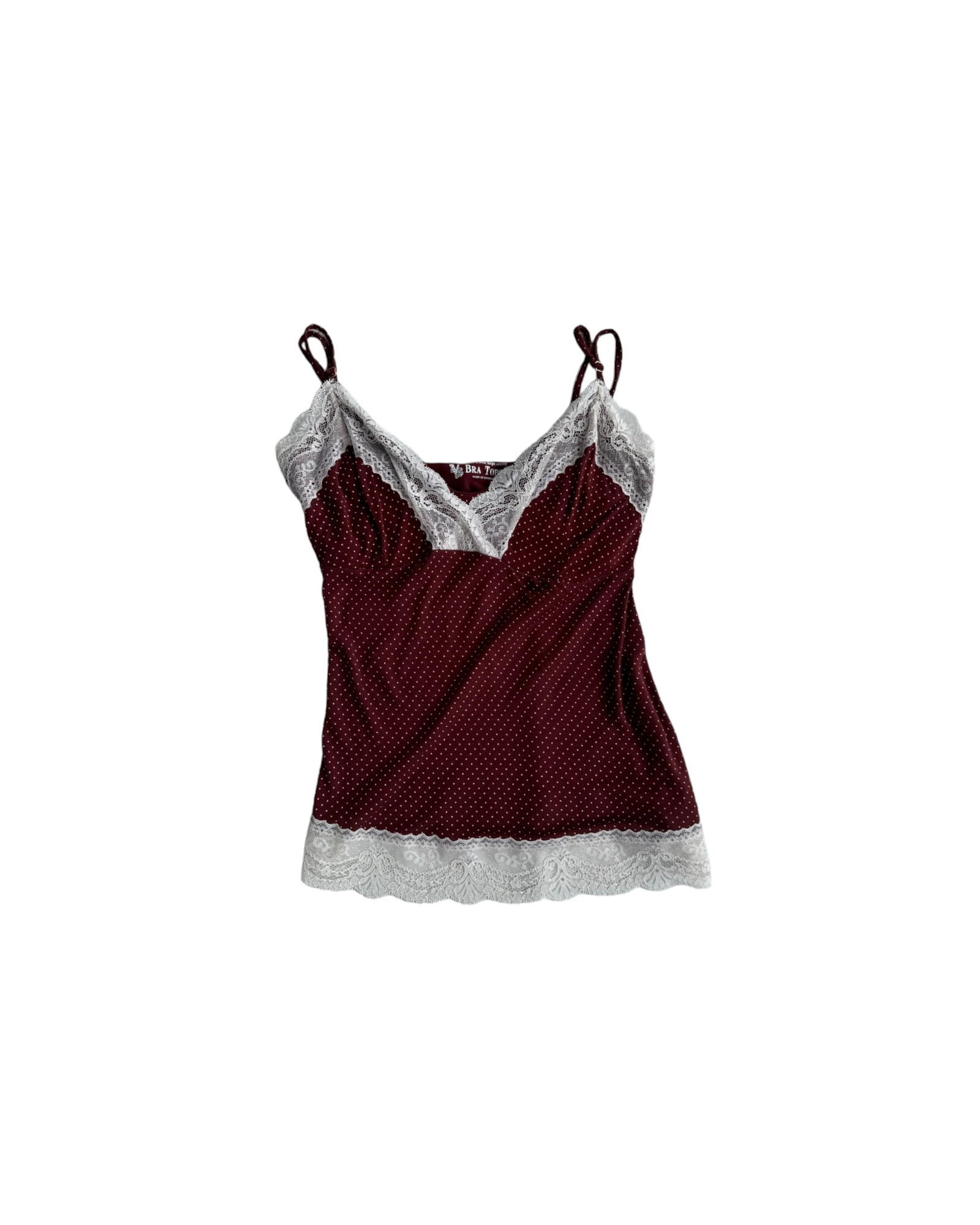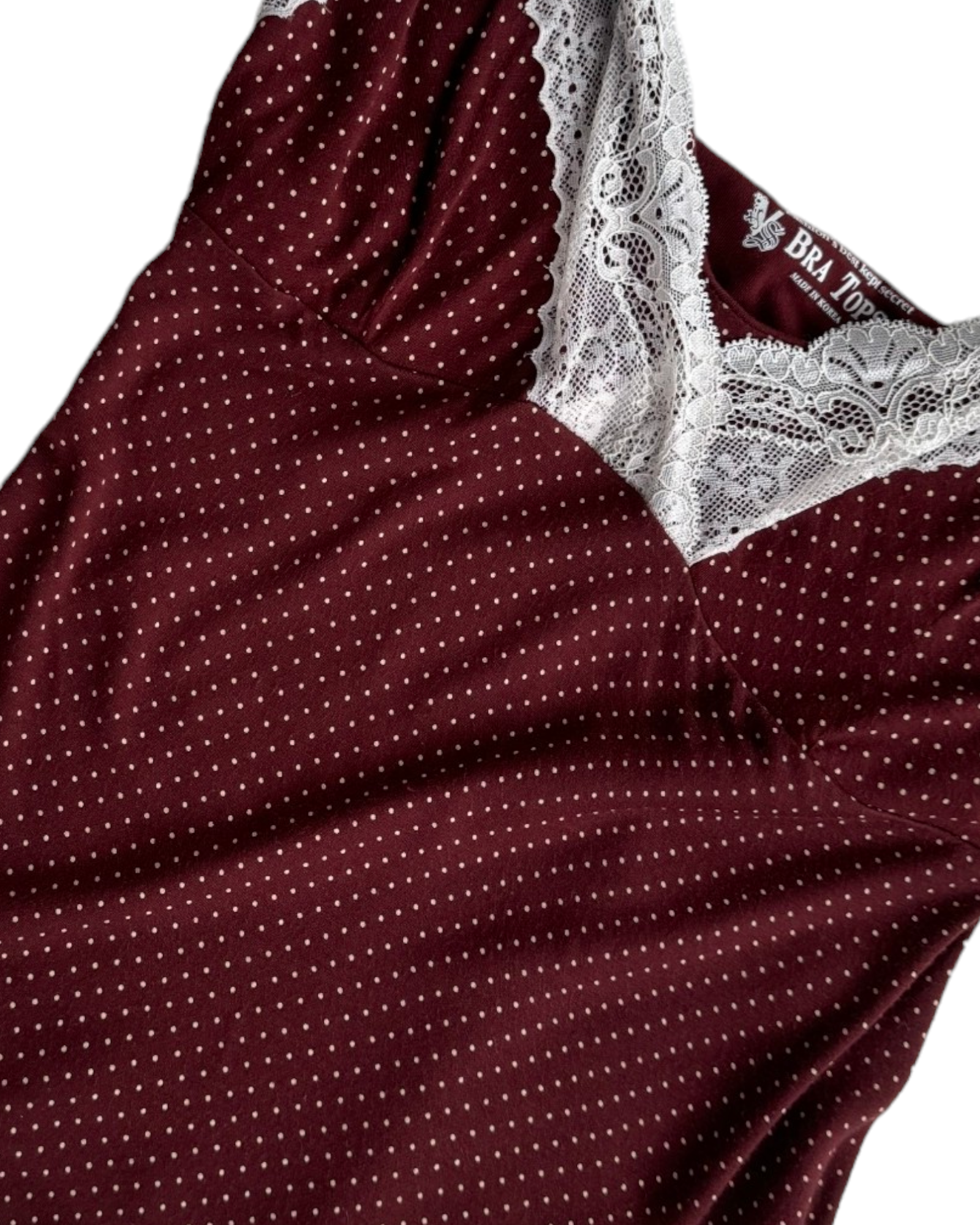 TOP LENCERO DE TIRANTES AJUSTABLES, BRA INTEGRADO EN EL TOP CON ELÁSTICO INTERIOR CUERPO: 100% MODAL, BRA: 95% ALGODÓN SUPIMA 5% SPANDEX. COLOR VINO CON PUNTITOS BLANCOS Y DETALLES DE ENCAJE BLANCO EN EL ESCOTE Y EL BORDE INFERIOR. SIN DETALLES DE USO.