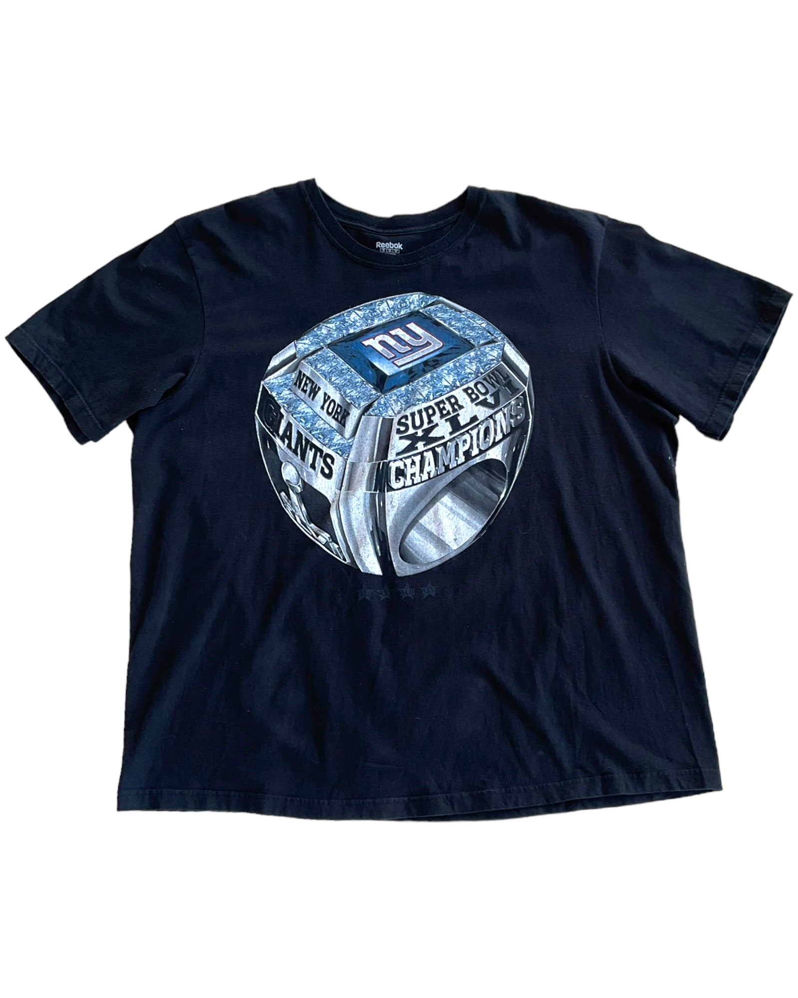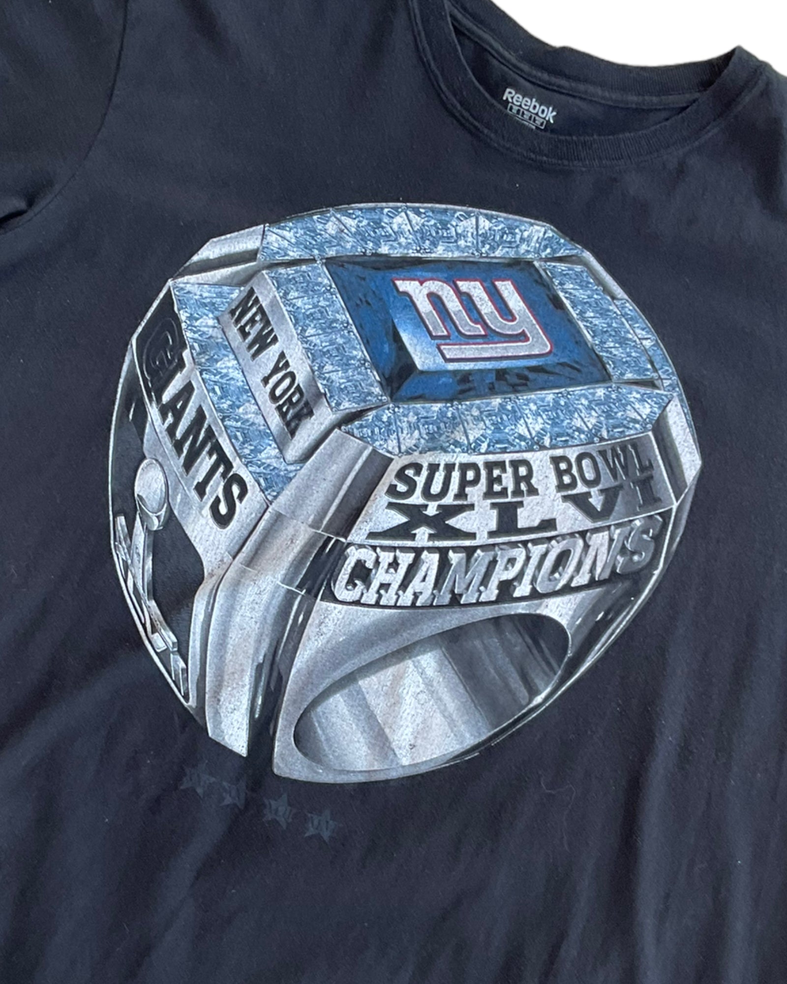 PLAYERA REBOOK 100% ALGODÓN CON ESTAMPADO CENTRAL DEL ANILLO DEL SUPER BOWL XLVI GIANTS CHAMPIONS.