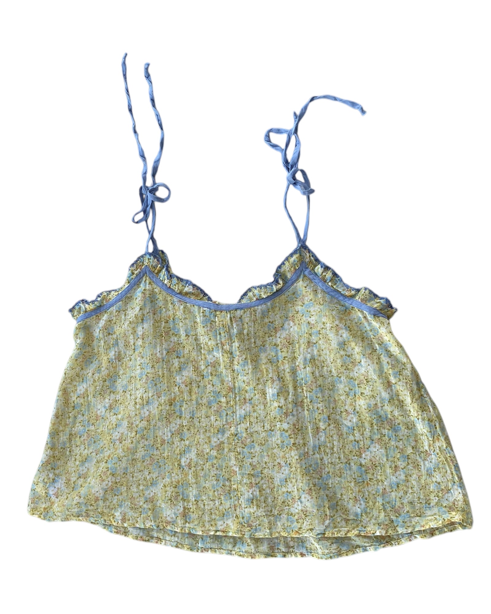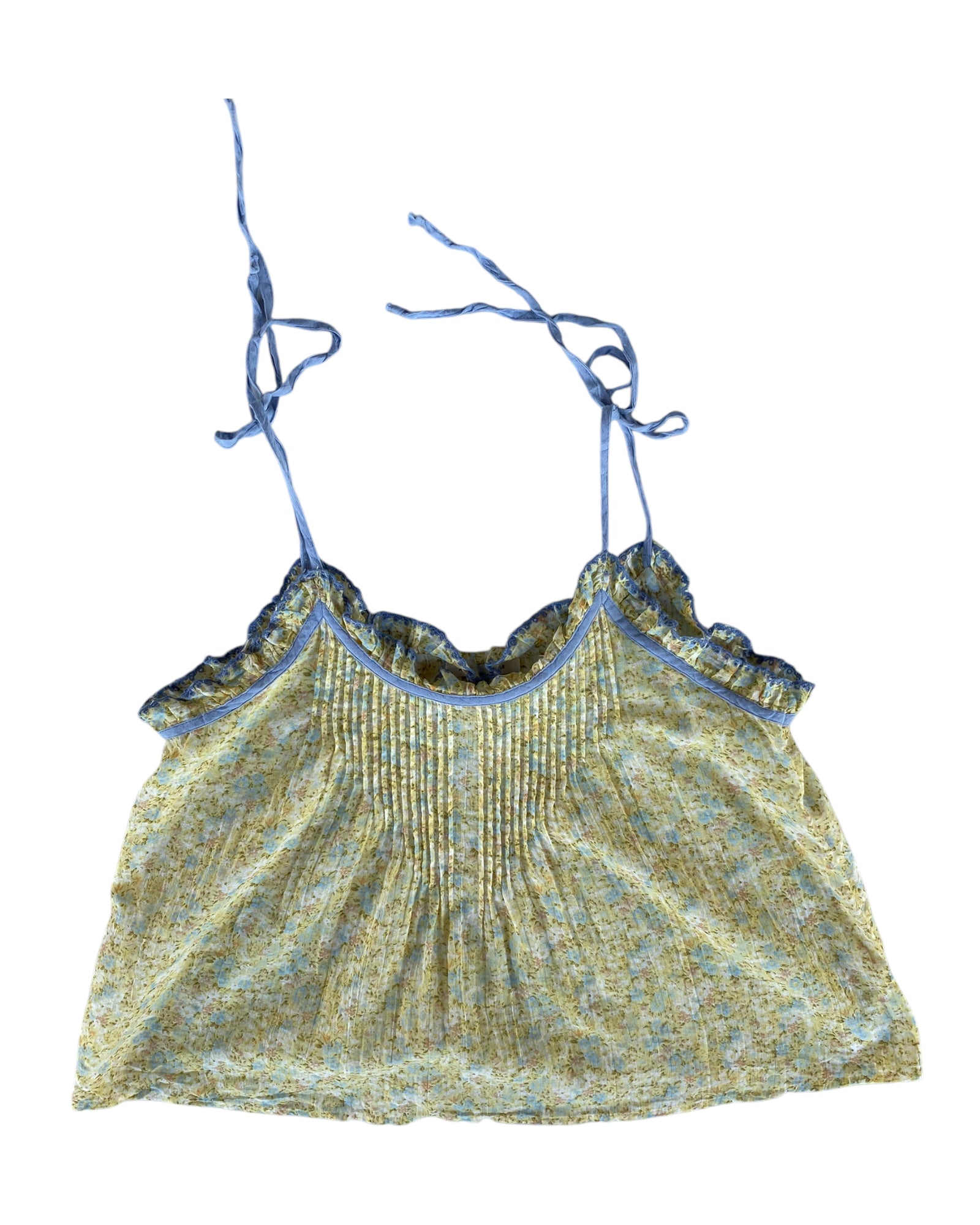 TOP AMARILLO CLARO CON ESTAMPADO DE FLORES PEQUEÑAS Y TIRANTES AJUSTABLES EN COLOR AZUL CLARO, NO TIENE DETALLES Y ESTA MUY FRESCO, 100% ALGODÓN