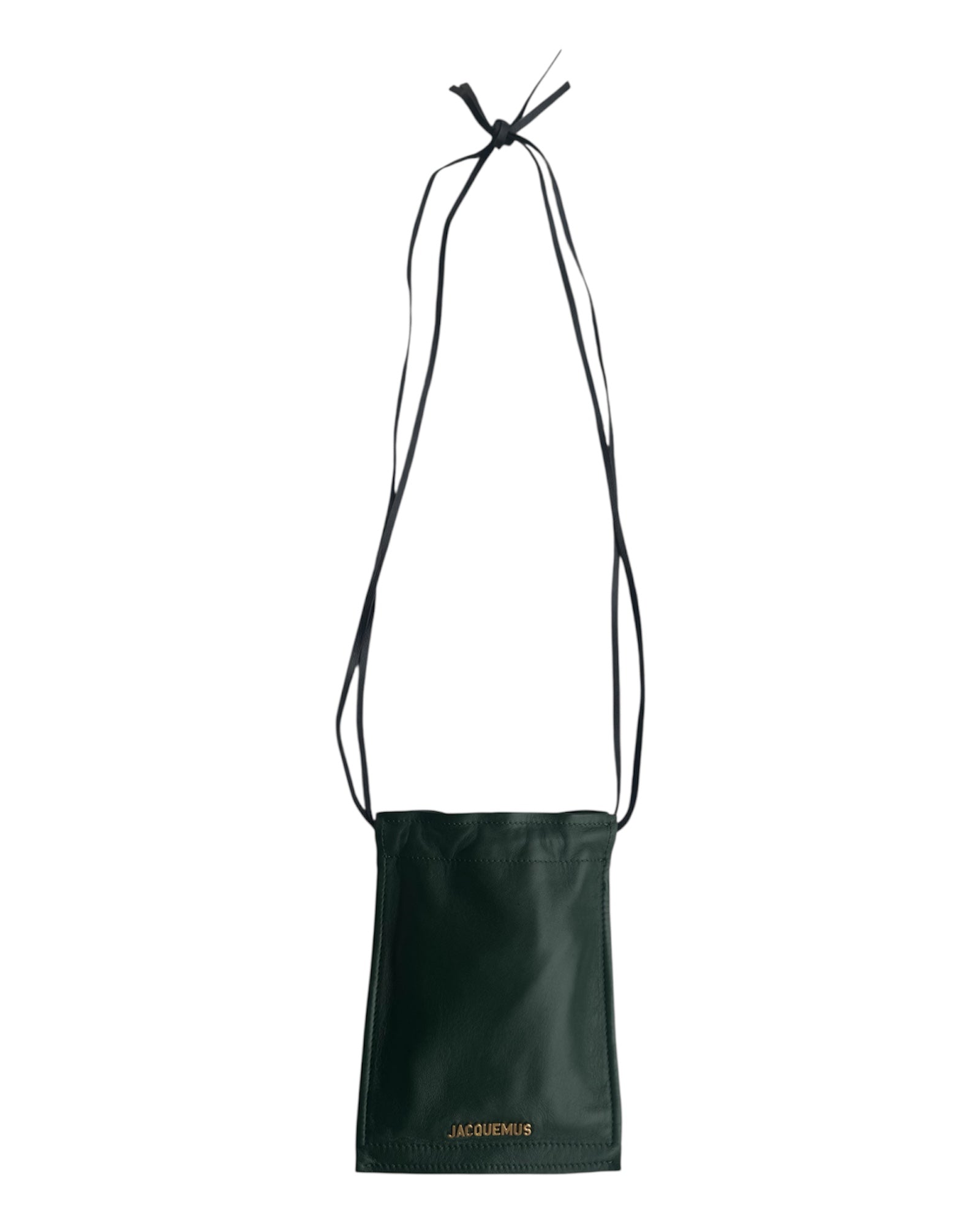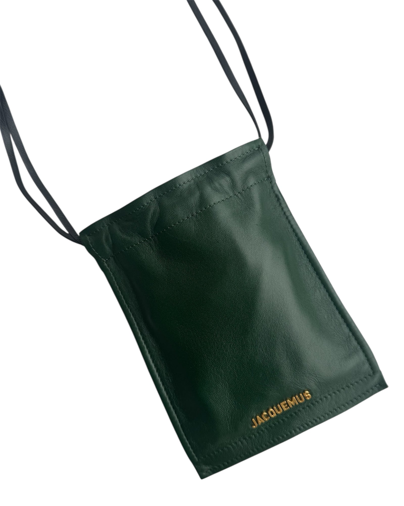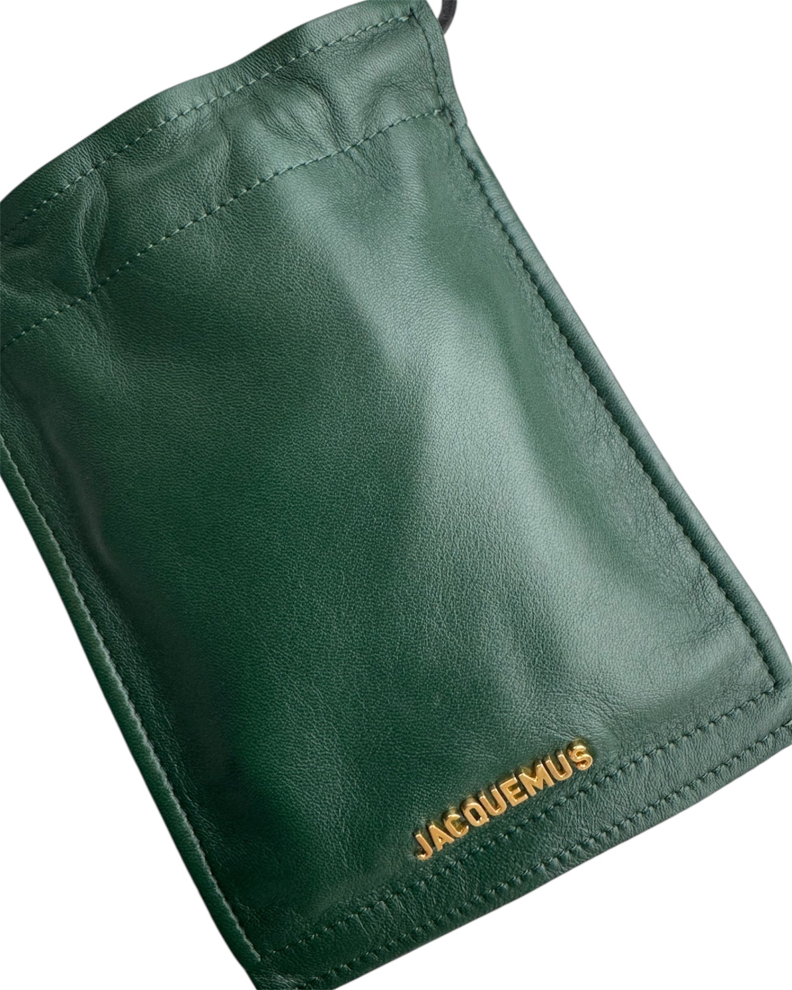BOLSA 100% PIEL GENUINA EN COLOR VERDE BOSQUE ESTILO POUCH CON LETRAS DORADAS EN 3D DE "JACQUEMUS". ASA DE PIEL EN COLOR NEGRO DELGADA Y AJUSTABLE. EN PERFECTO ESTADO, INCLUYE CUBRE POLVO.
