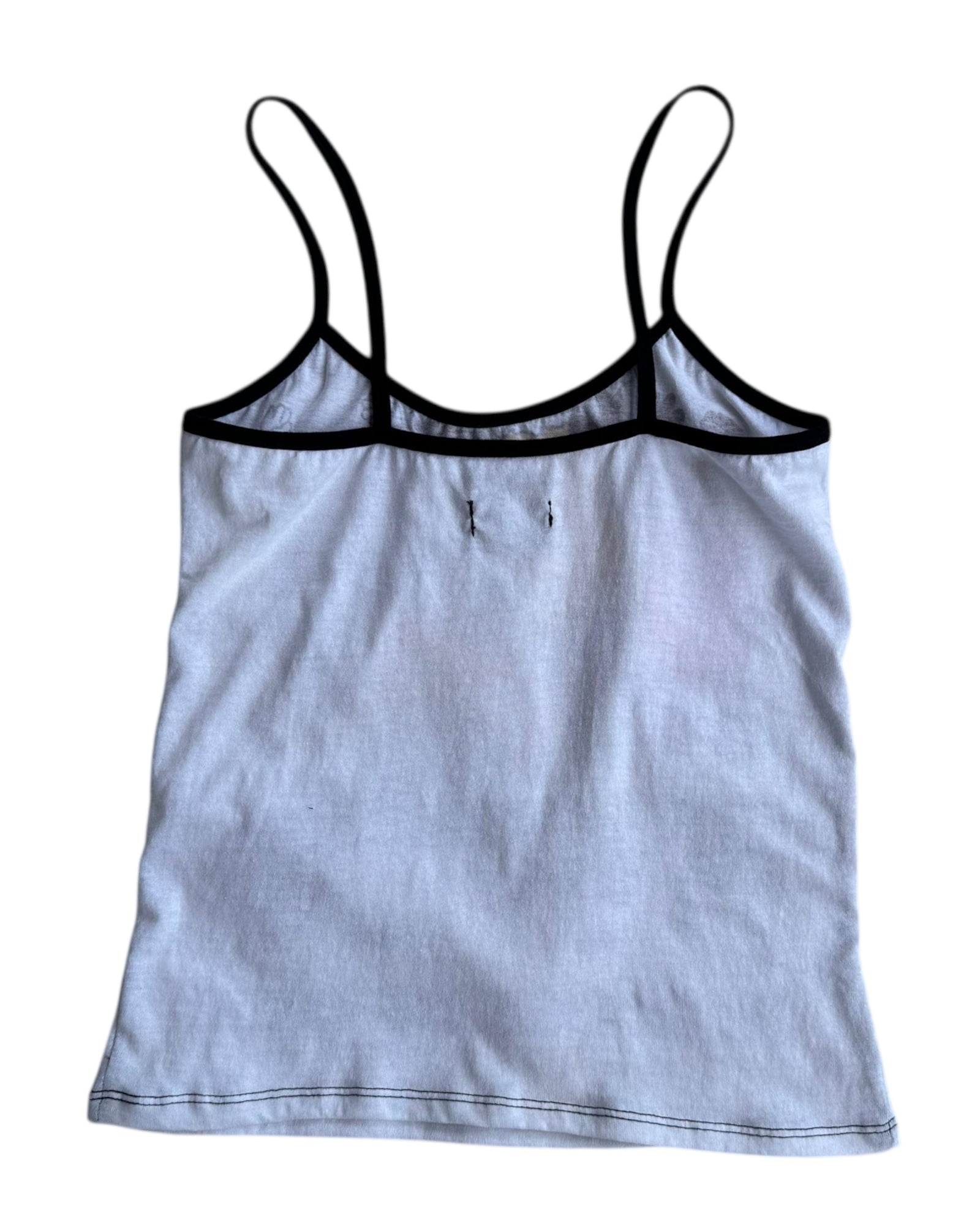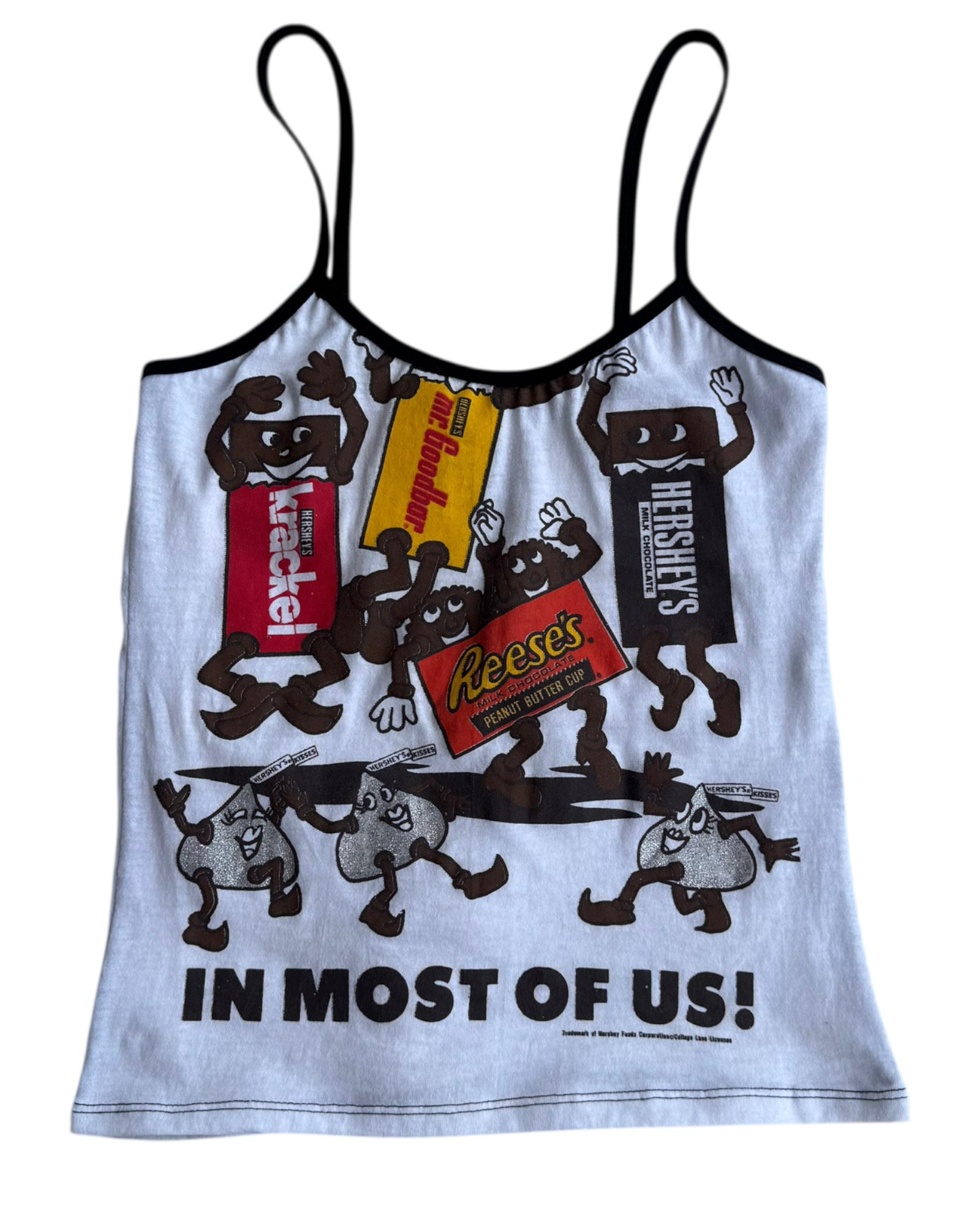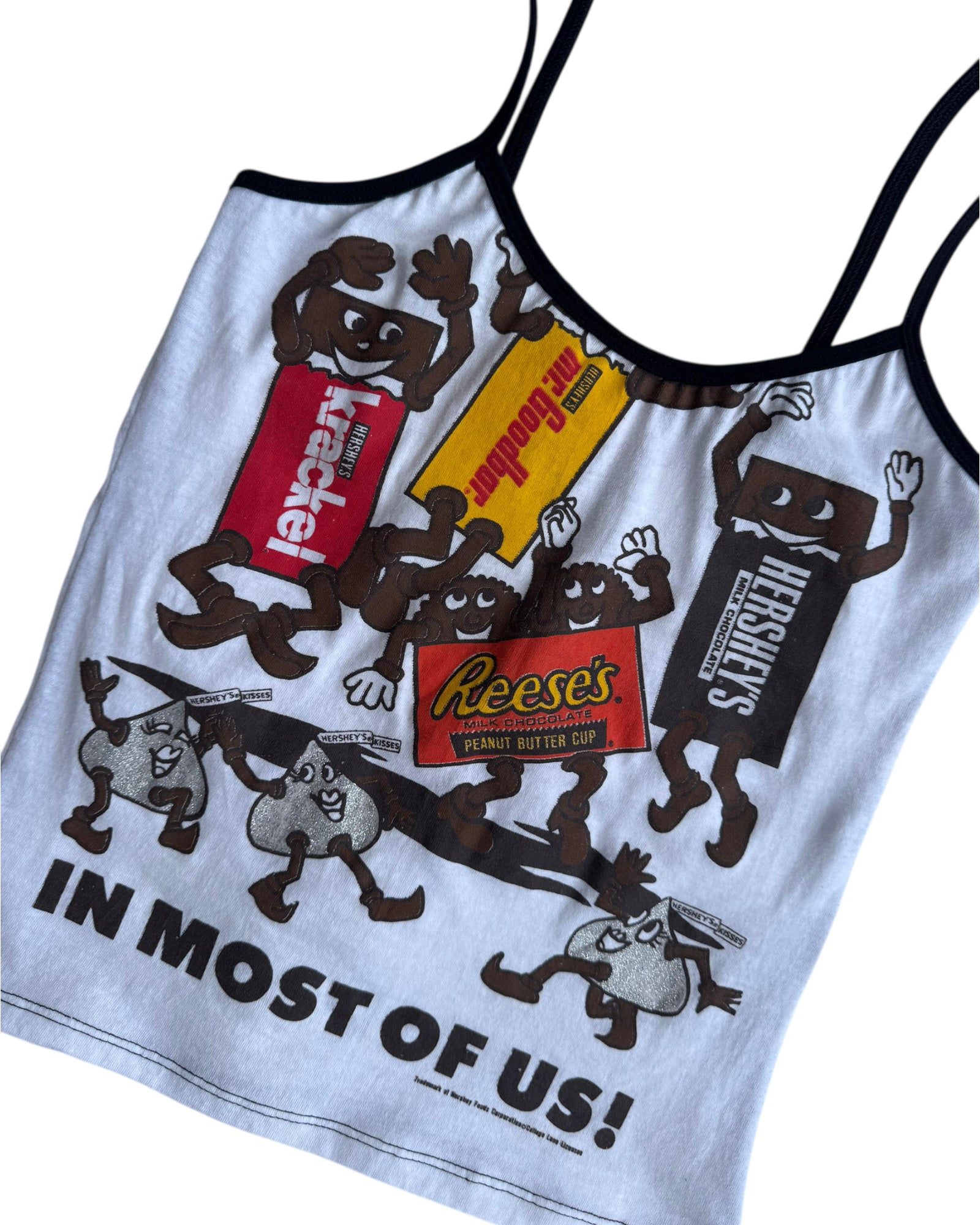 TOP HECHO EN COLABORACIÓN POR LUPE BÁEZ X REMATE. 100% UPCYCLING DE PRENDAS RECAUDADAS POR LUPE BÁEZ, COLOR BLANCO CON PRINT DE HERSHE´Y´S EN LA PARTE DELANTERA. SIN DETALLES.