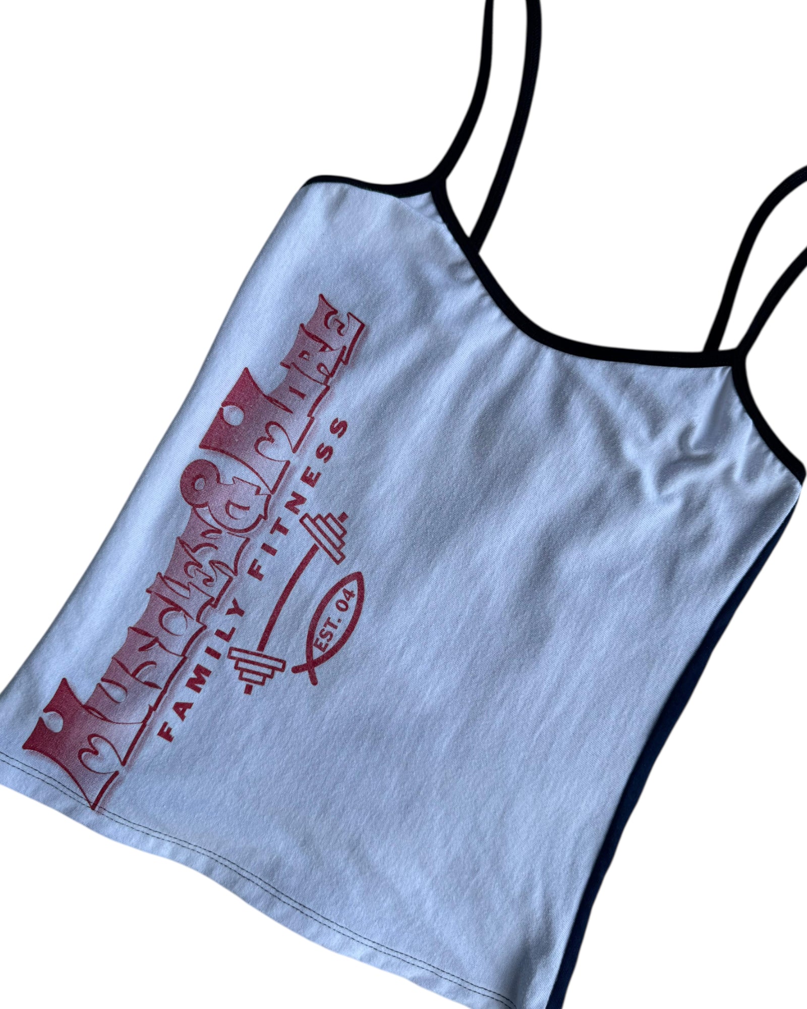 TOP HECHO EN COLABORACIÓN POR LUPE BÁEZ X REMATE. 100% UPCYCLING DE PRENDAS RECAUDADAS POR LUPE BÁEZ, COLOR AZUL EN PARTE TRASERA Y COLOR BLANCO CON ESTAMPADO "MUSCLE MORE" CON LETRAS ROJAS EN PARTE DELANTERA SIN DETALLES.