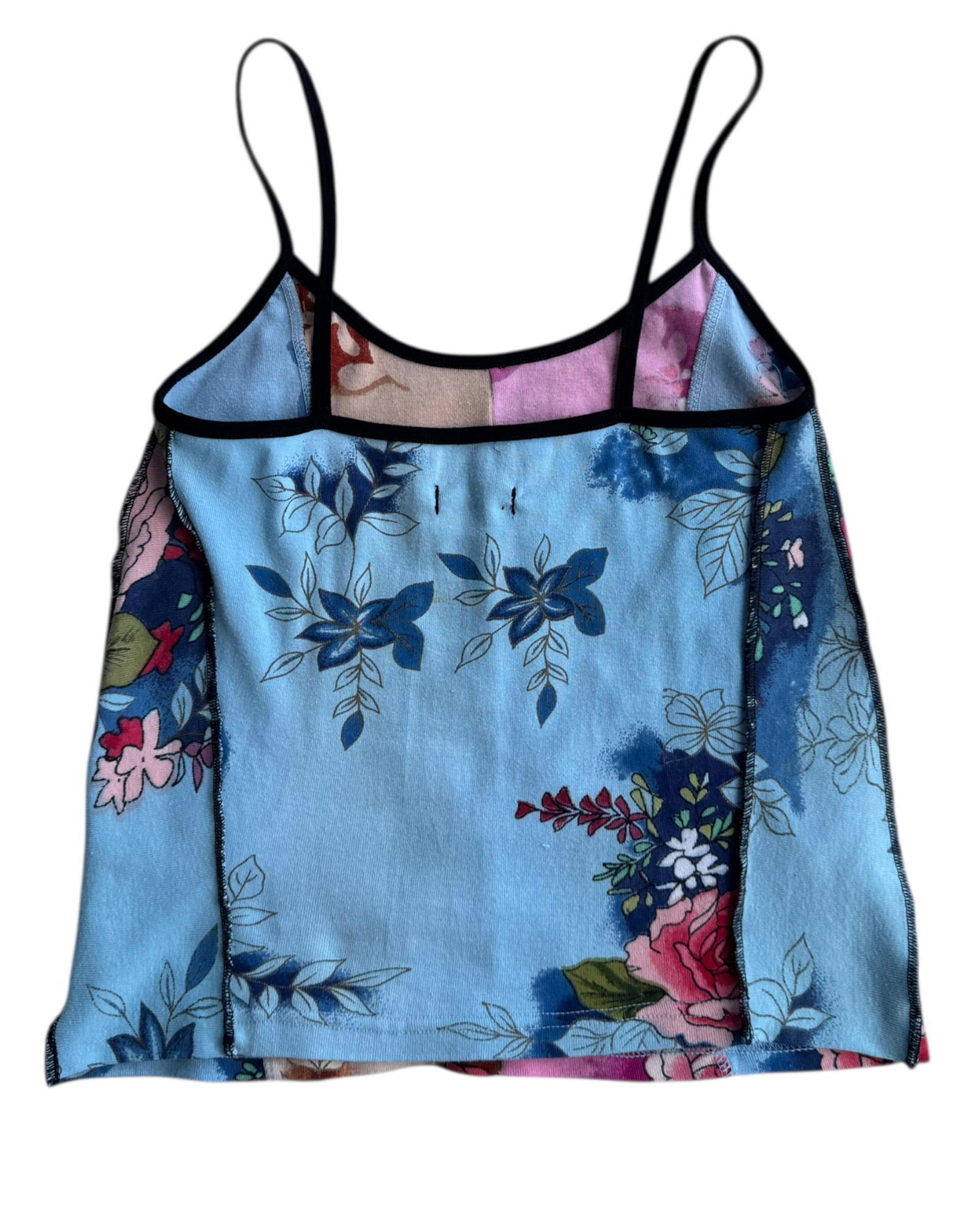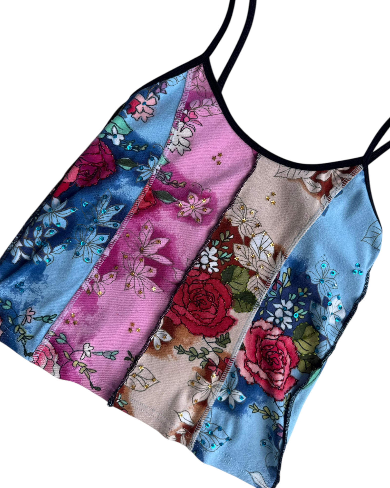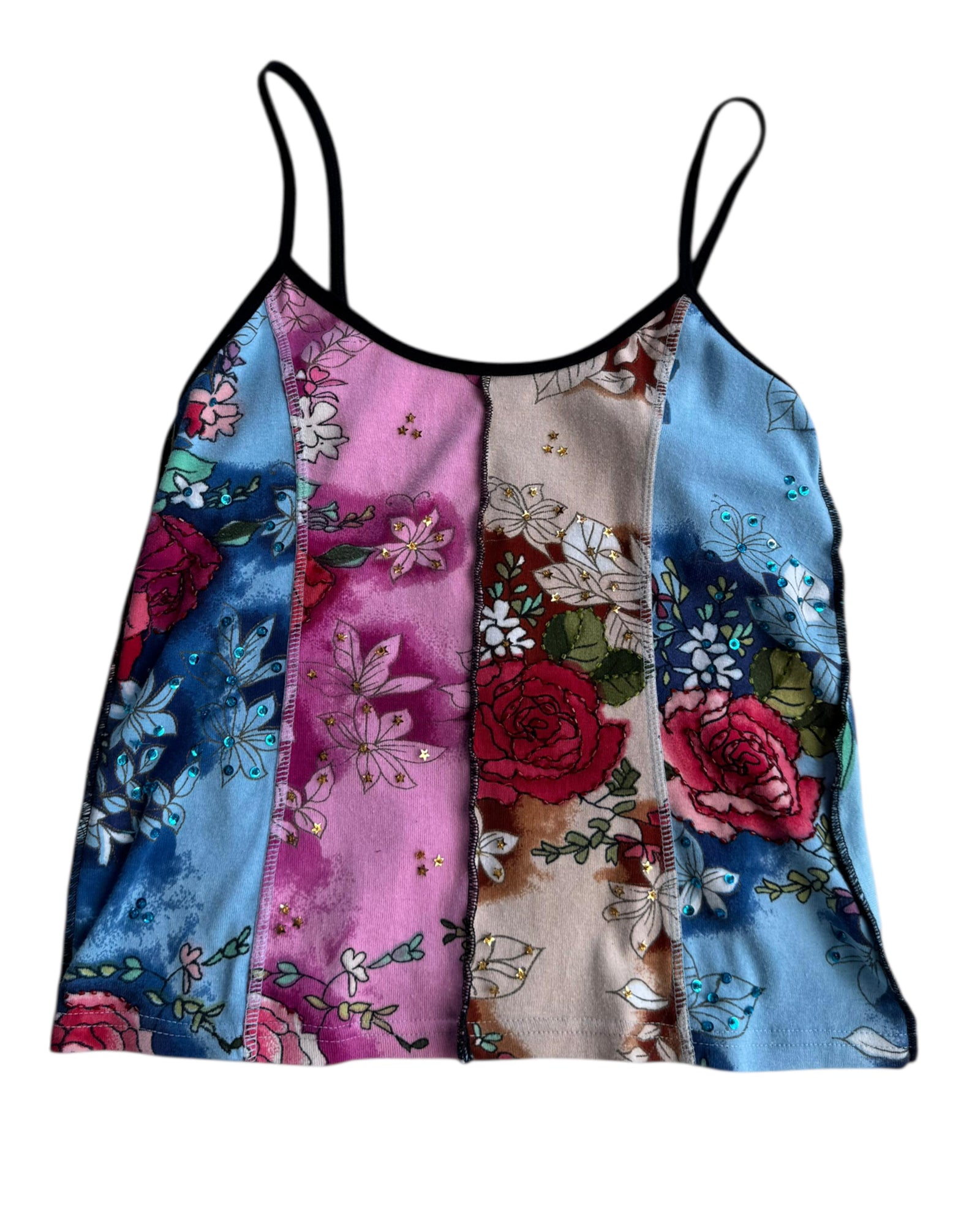 TOP HECHO EN COLABORACIÓN POR LUPE BÁEZ X REMATE. 100% UPCYCLING DE PRENDAS RECAUDADAS POR LUPE BÁEZ, COLOR AZUL CON ROSA, ESTAMPADO FLORAL Y PIEDRERIA EN PARTE DELANTERA. SIN DETALLES.