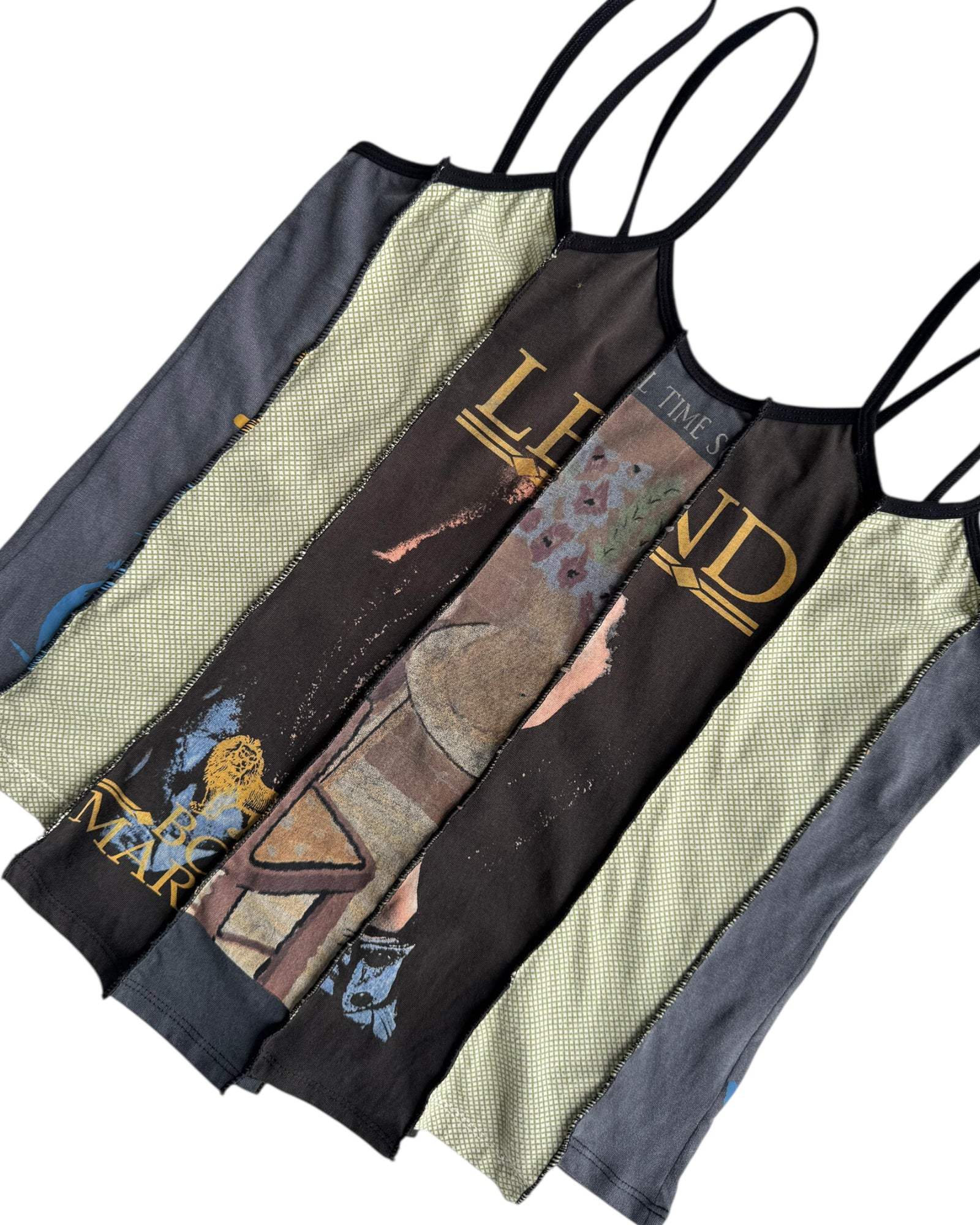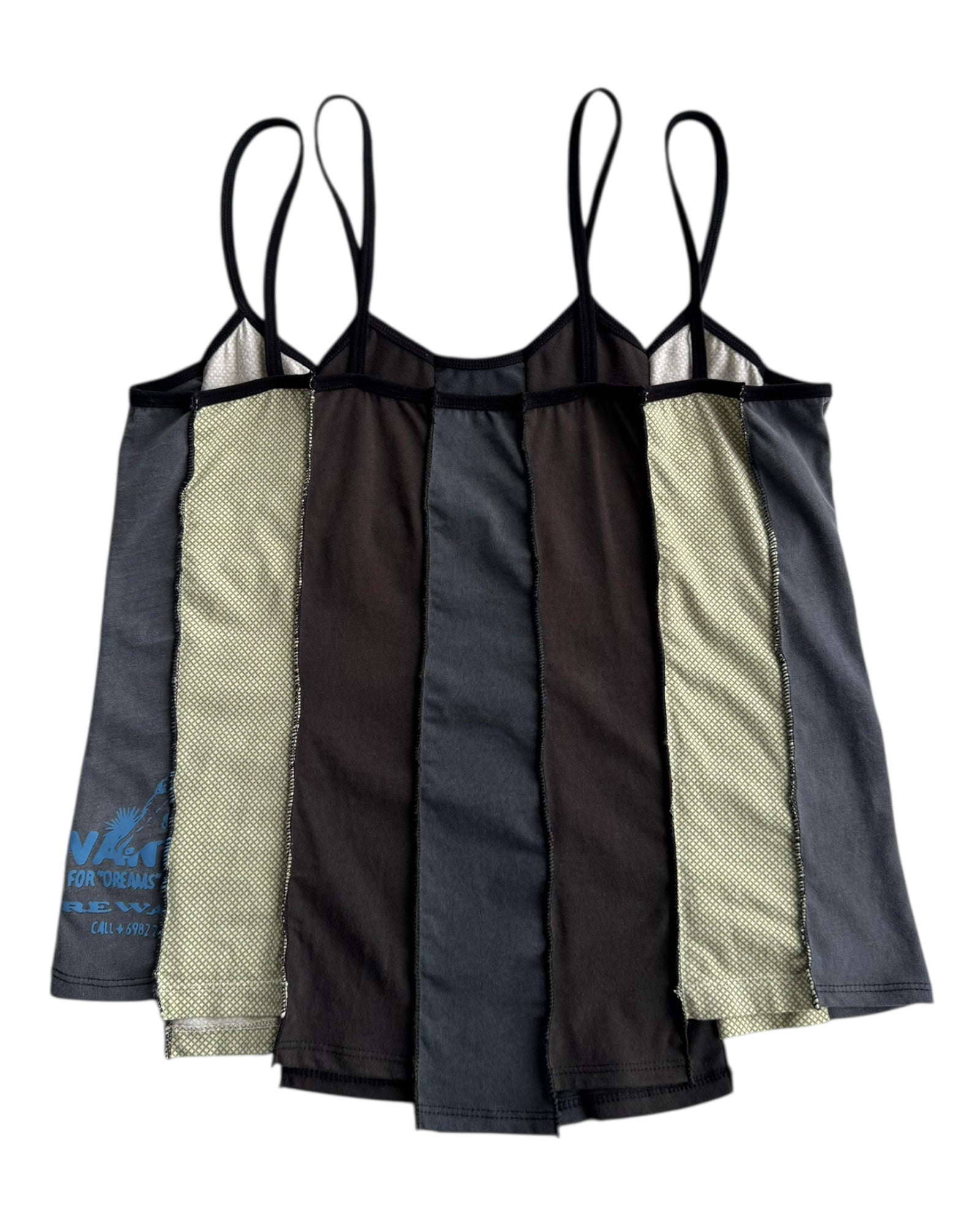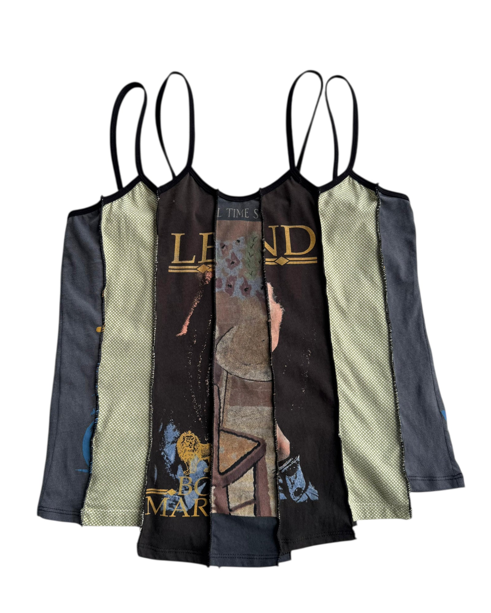 TOP HECHO EN COLABORACIÓN POR LUPE BÁEZ X REMATE. 100% UPCYCLING DE PRENDAS RECAUDADAS POR LUPE BÁEZ. COLOR CAFÉ, GRIS Y VERDE CON DIFERENTES PATRONES EN PARTE DELANTERA. SIN DETALLES.