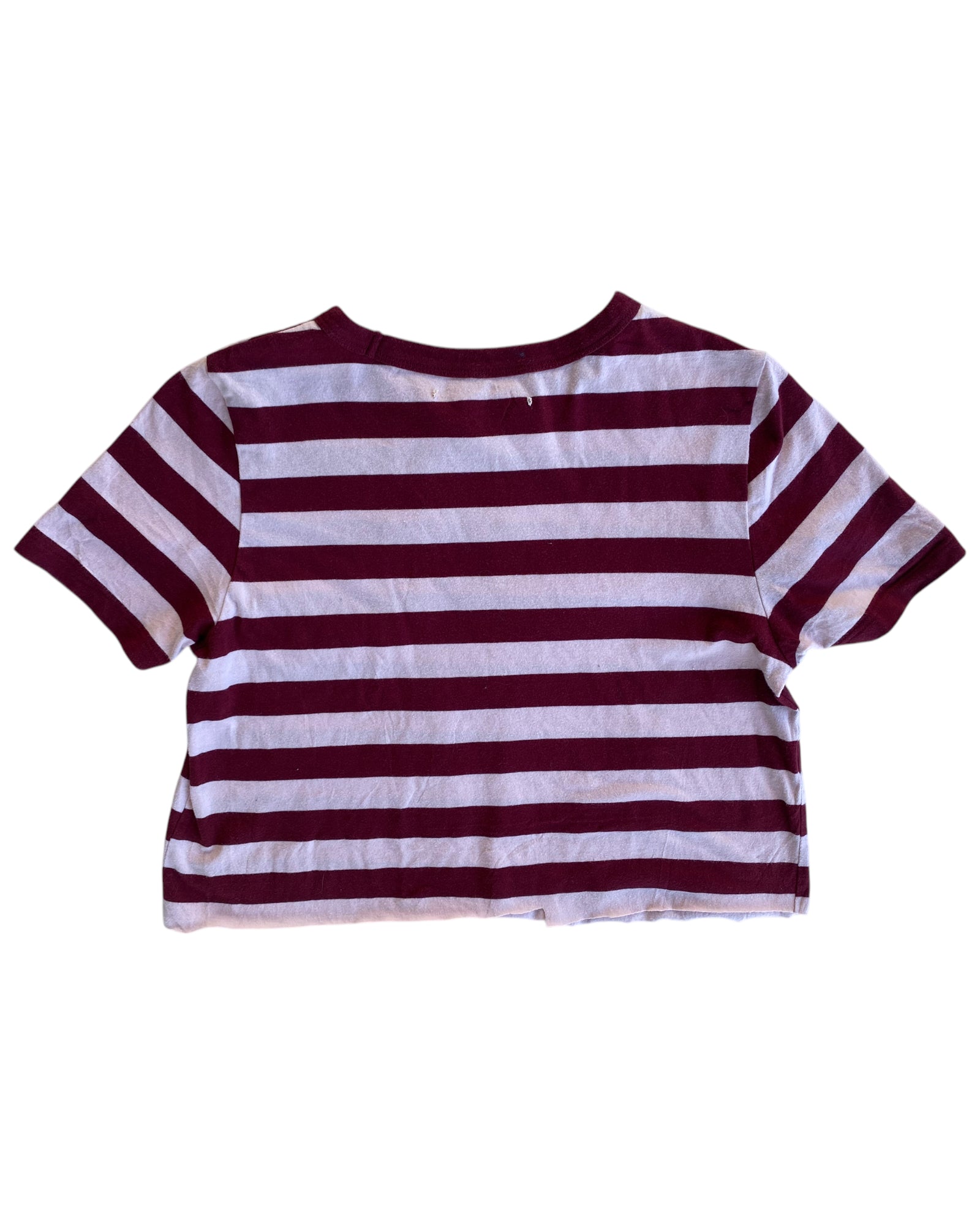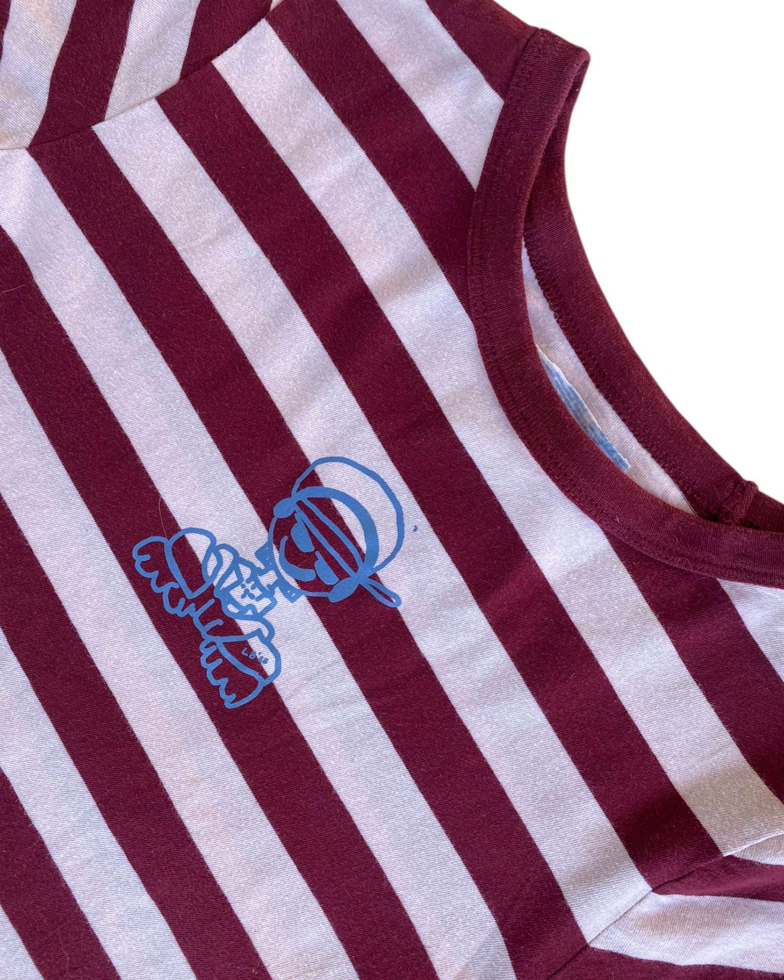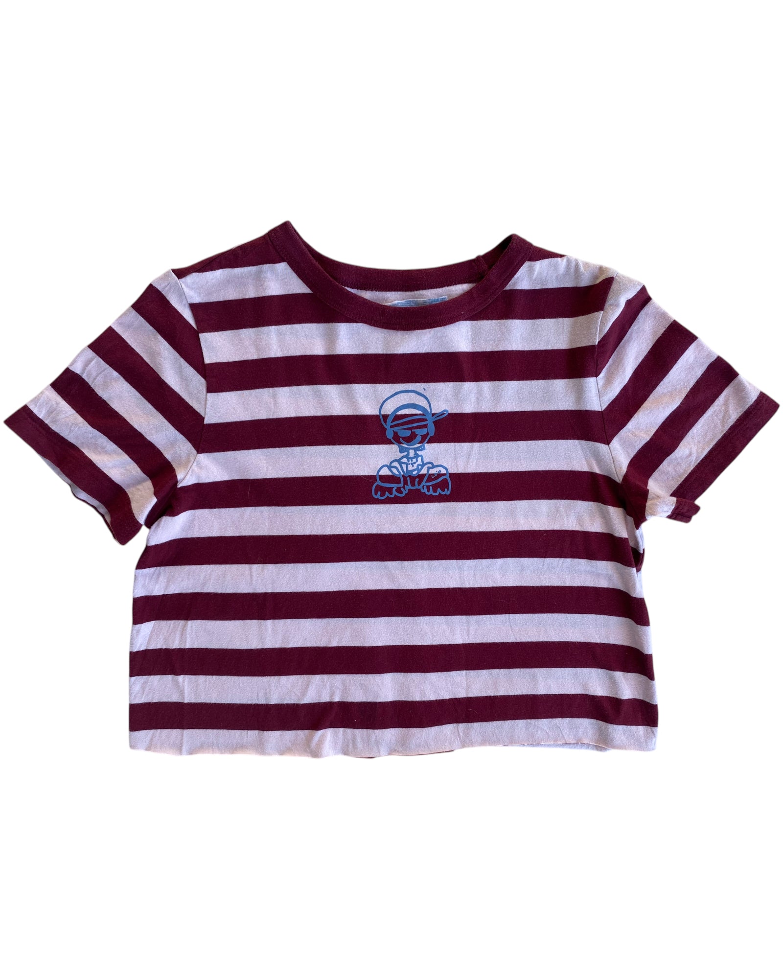 PLAYERA CROPPED DE RAYAS GUINDA CON BLANCO INTERVENIDO POR COLABORACIÓN DE LUPE BAEZ X SLIDING INK, CON PRINT AL FRENTE DE DISEÑO LUPE BAEZ EN AZUL CLARO, ALGODÓN