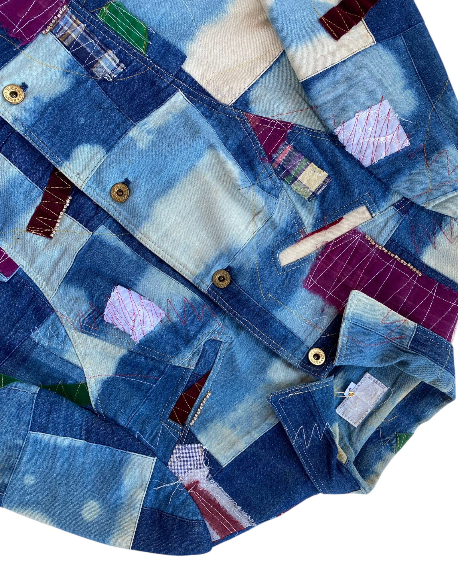 CHAMARRA DE MEZCLILLA CON PARCHES BLANCOS Y EN TONOS VERDES Y VINO, DETALLES DE BRILLOS Y COSTURAS POR ENCIMA COMO DECORACIÓN, BOTONES AL FRENTE, 100% ALGODÓN