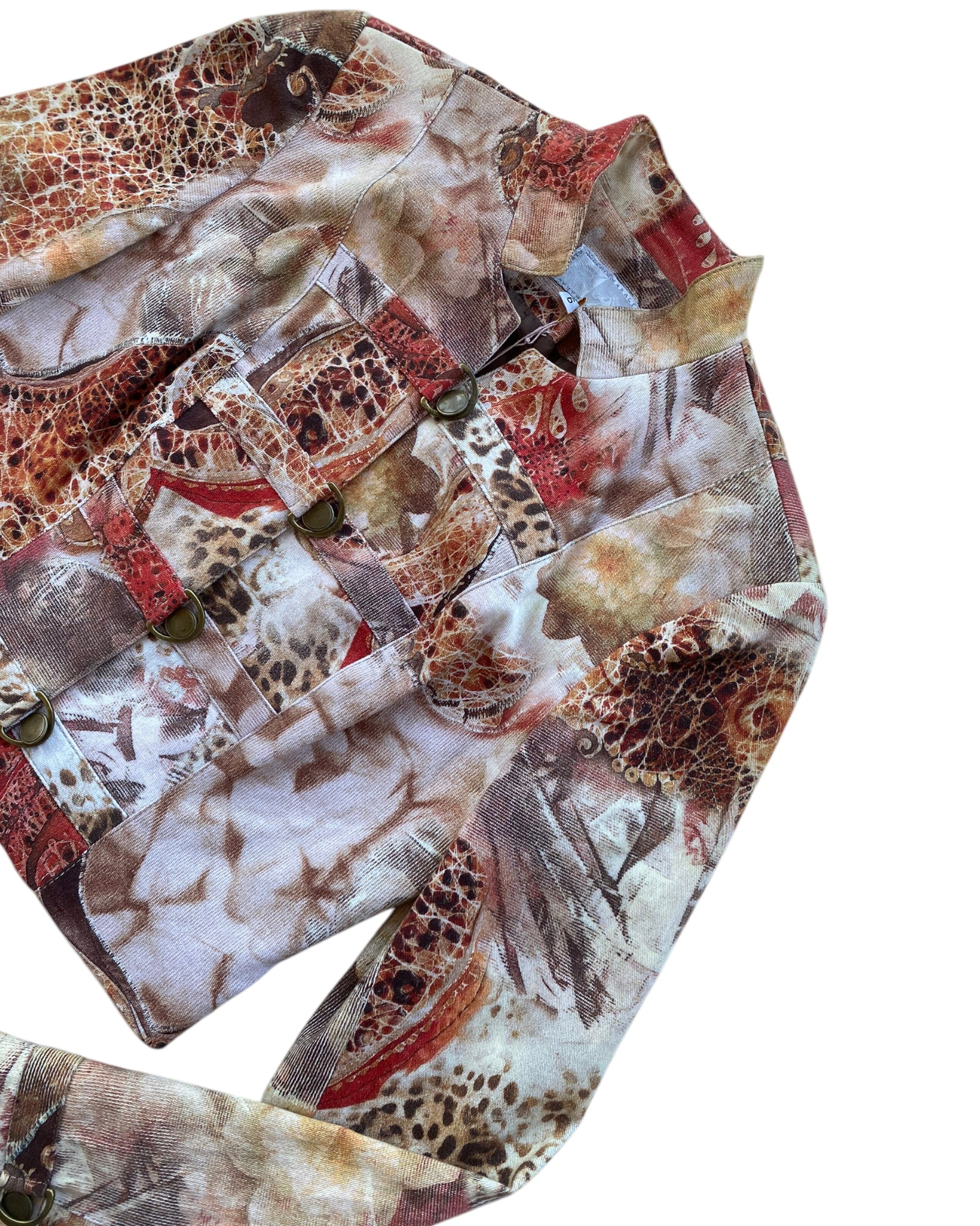 CHAMARRA TIPO SACO, CORTA, CON ESTAMPADOS EN TONOS CAFÉ, AMARILLO Y ROJO, CON BOTONES AL FRENTE PARA CERRAR, UN BOTÓN EN CADA MANGA, FIGURA QUE ACENTÚA LA CINTURA, 98% ALGODÓN, 2% ELASTANO