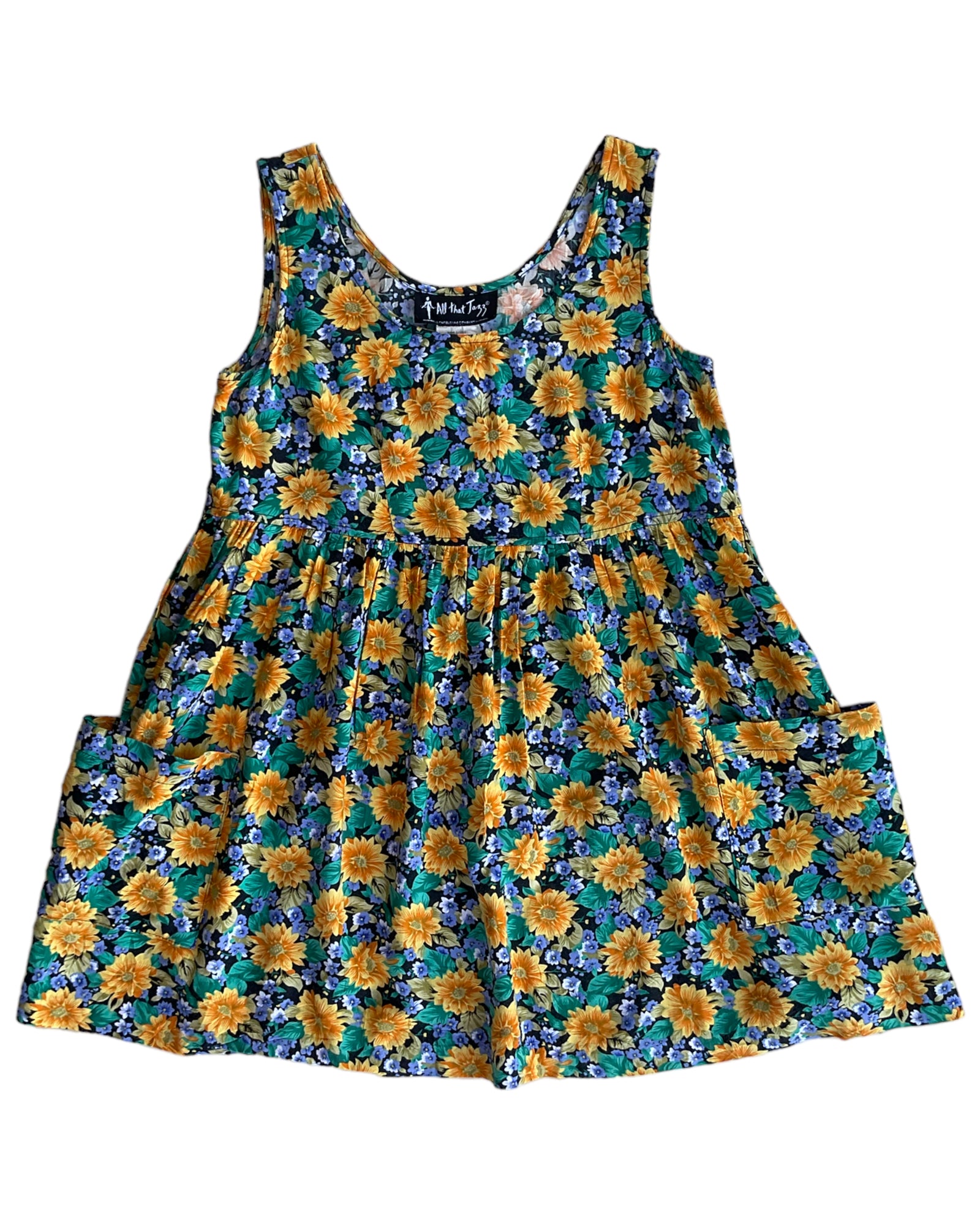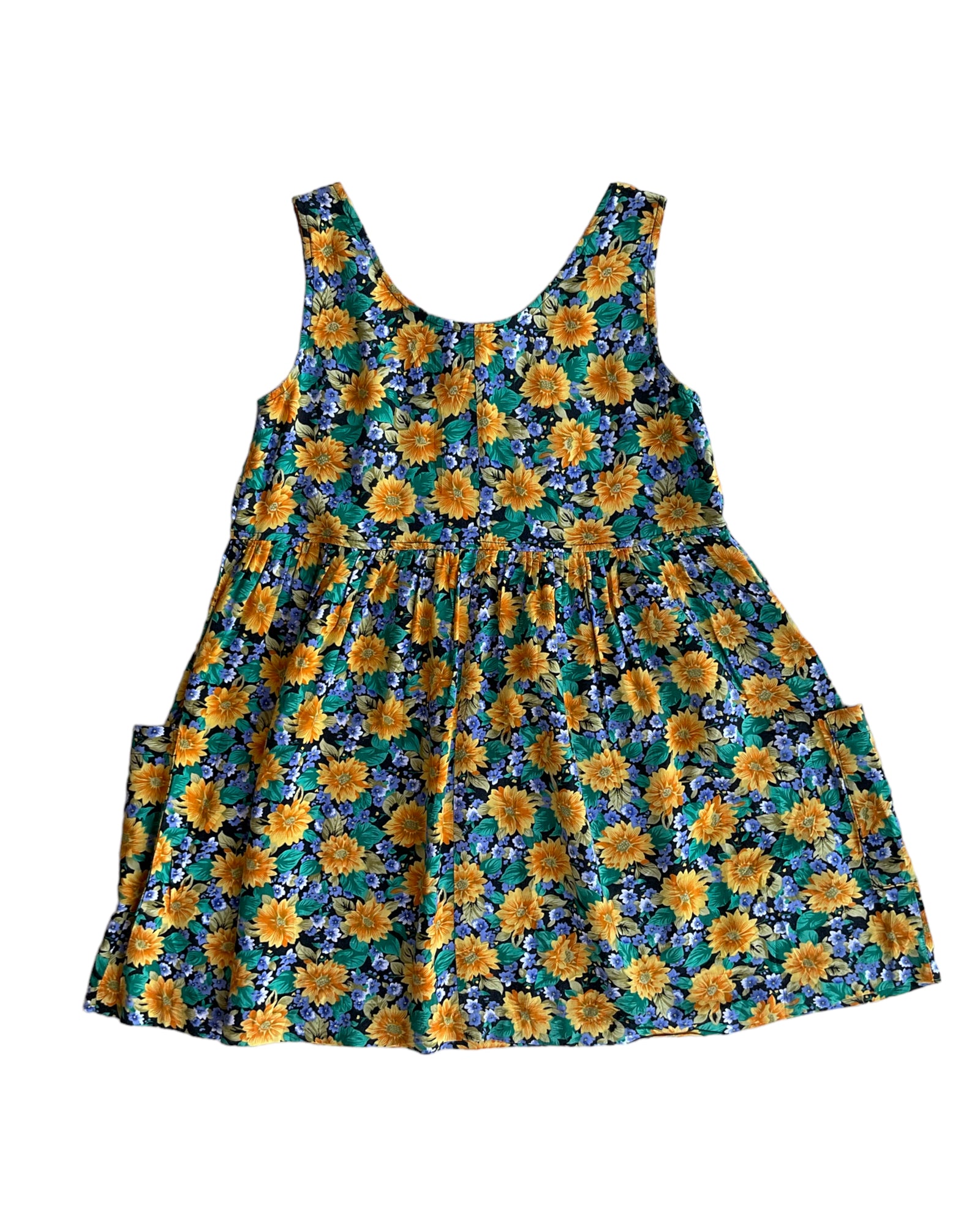 VESTIDO SIN MANGAS 100% RAYON, CON PATRÓN DE FLORES EN COLOR AMARILLO, AZUL, NEGRO Y VERDE. DOS BOLSILLOS FRONTALES. SIN DETALLES DE USO