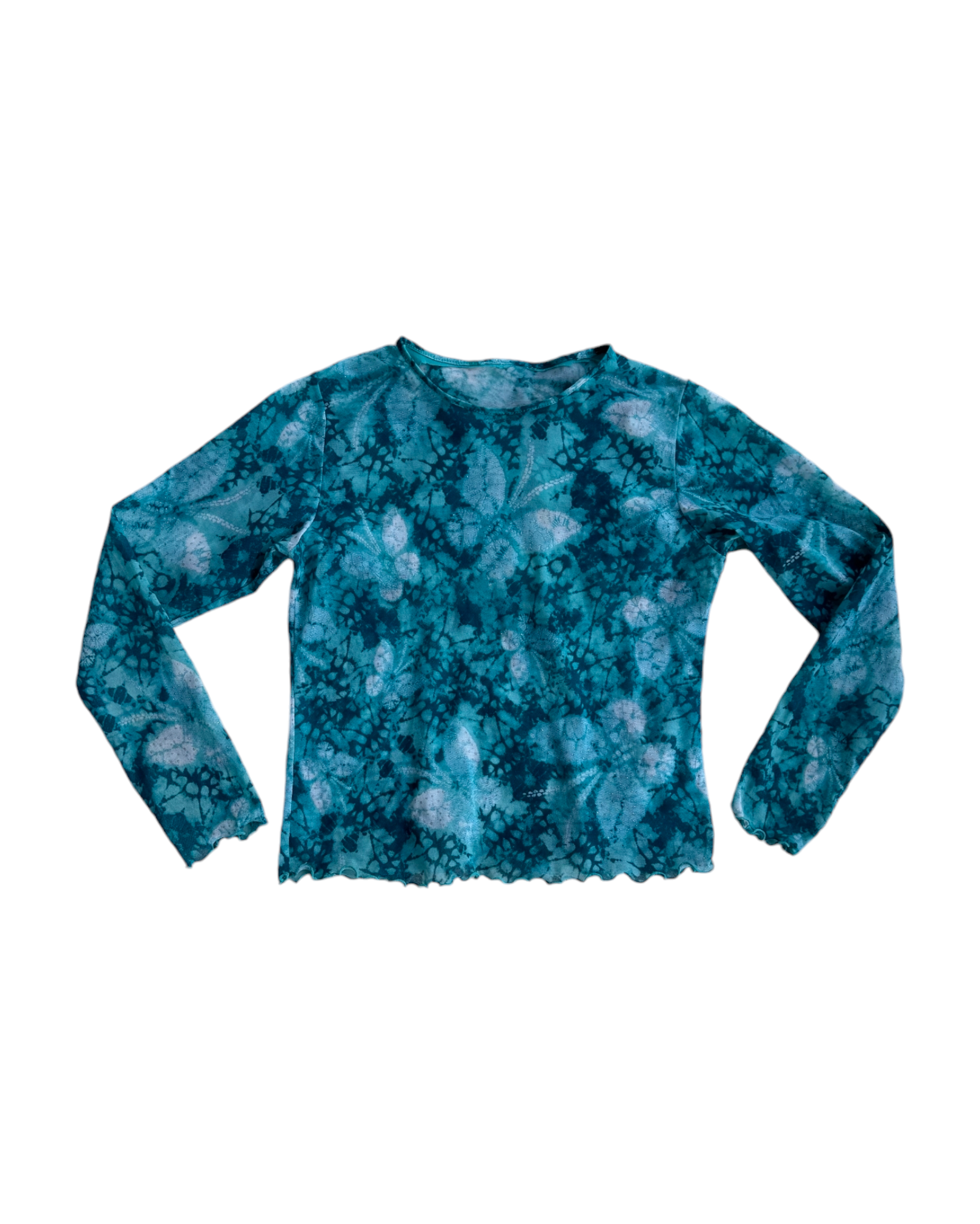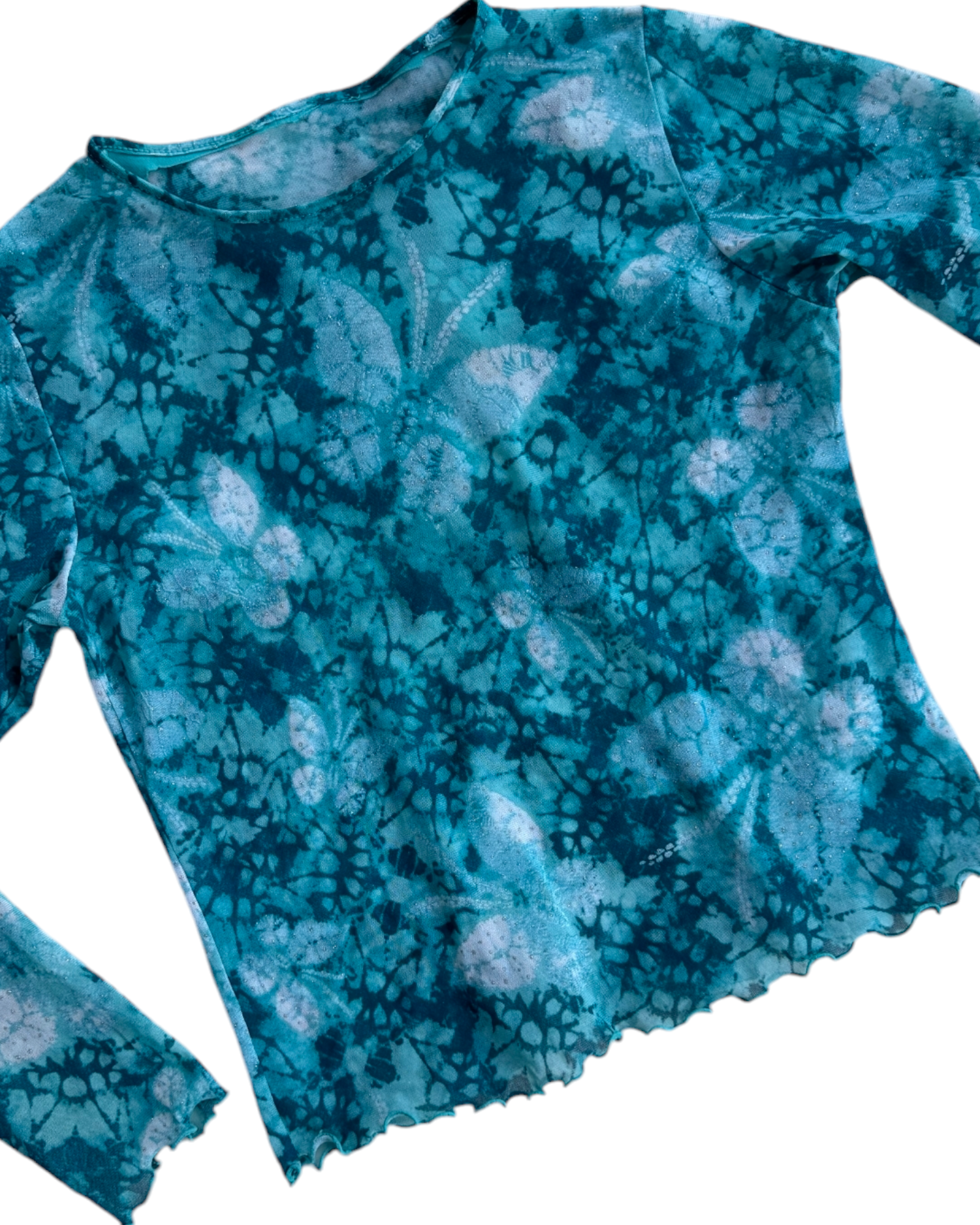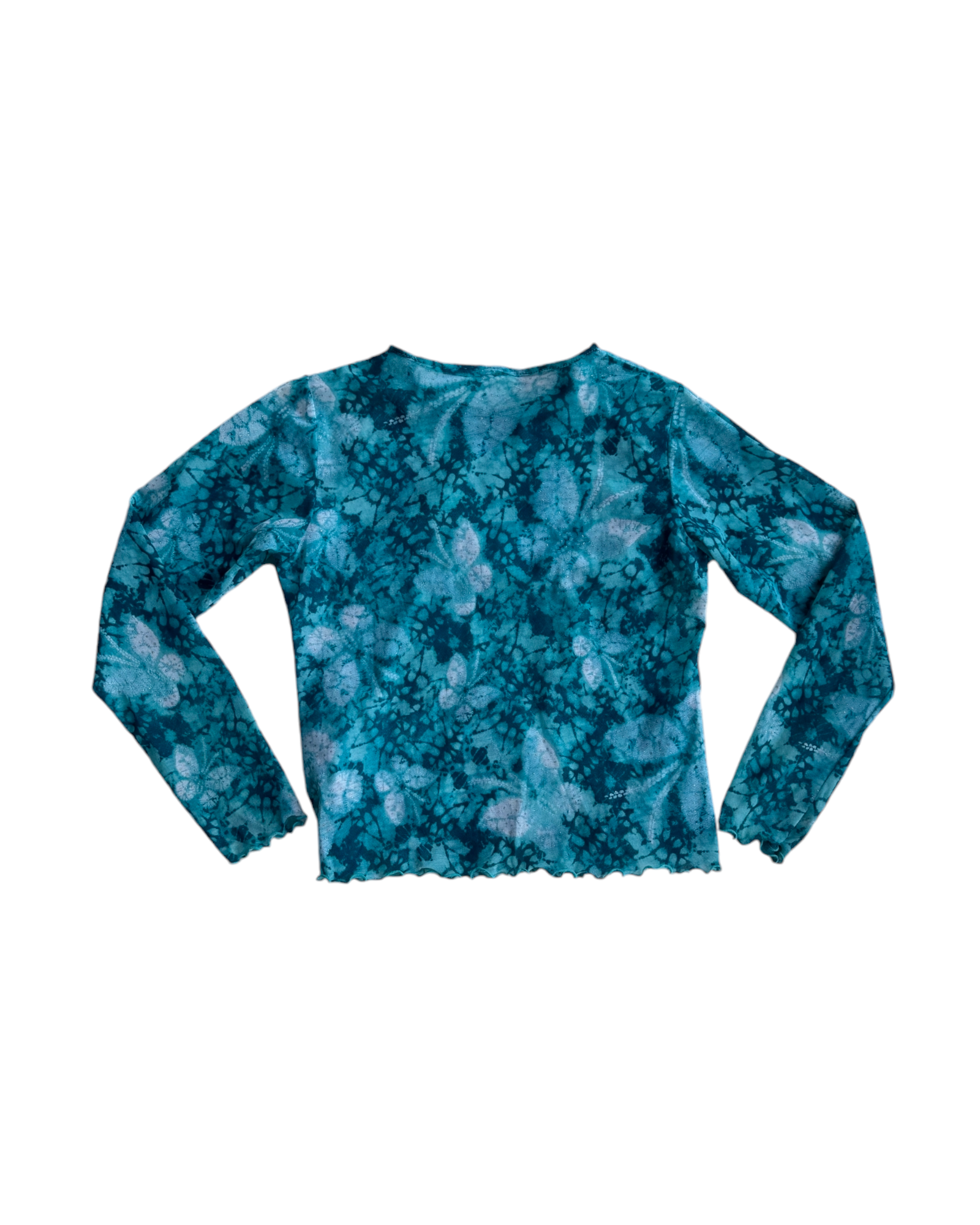 BLUSA DE MAGA LARGA, TRANSPARENTE, COLOR AZUL CON ESTAMPADO DE MARIPOSAS BLANCAS, CON ESTAMPADO EFECTO AGUA Y BRILLOS PLATEADOS