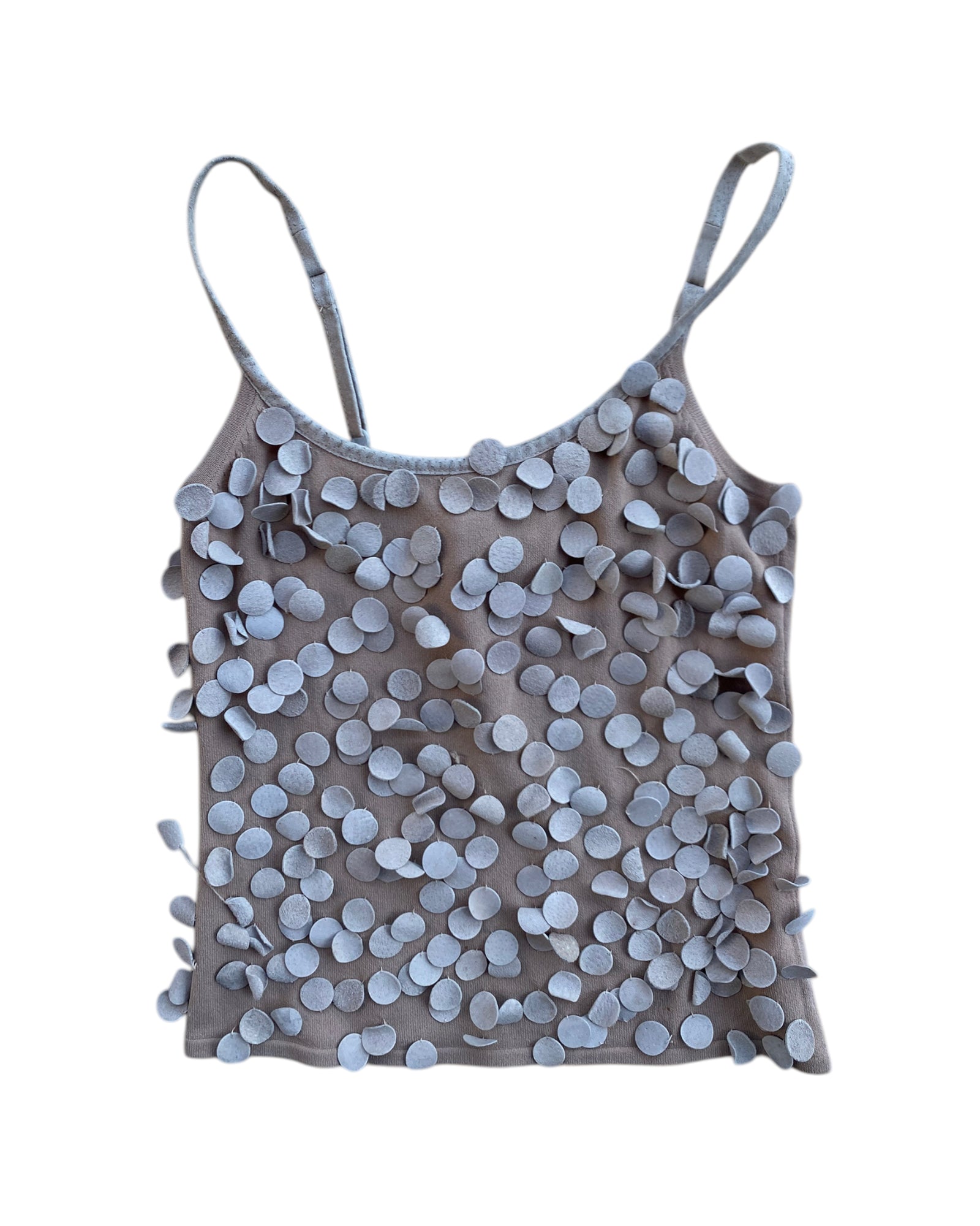TOP DE TIRANTES AJUSTABLES, MARCA BEBE COLOR CAFE MUY CLARO CON PUNTOS DE CUERO COSIDOS AL TOP UNICAMENTE AL FRENTE, REVERSO COMPLETAMENTE LISO Y SIN ESTAMPADOS, TELA DEL TOP: 63% RAYON, 37% NYLON, PUNTOS: 100% CUERO