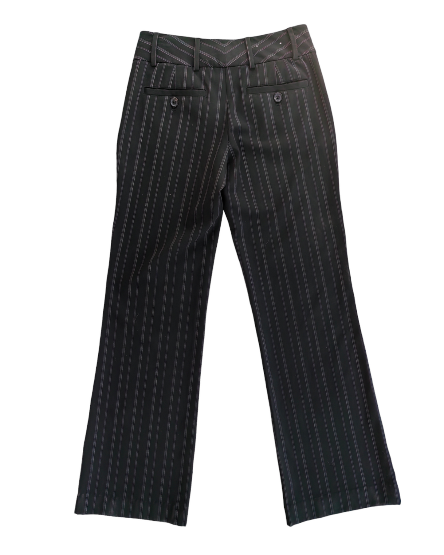 PANTALÓN NEGRO CON RAYAS BLANCAS, MARCA CALVIN KLEIN, CON BOLSILLOS AL FRENTE Y AL REVERSO, CIERRE POR EN MEDIO Y BOTONES, 49% POLIESTER, 48% VISCOSA, 3% ELASTICO