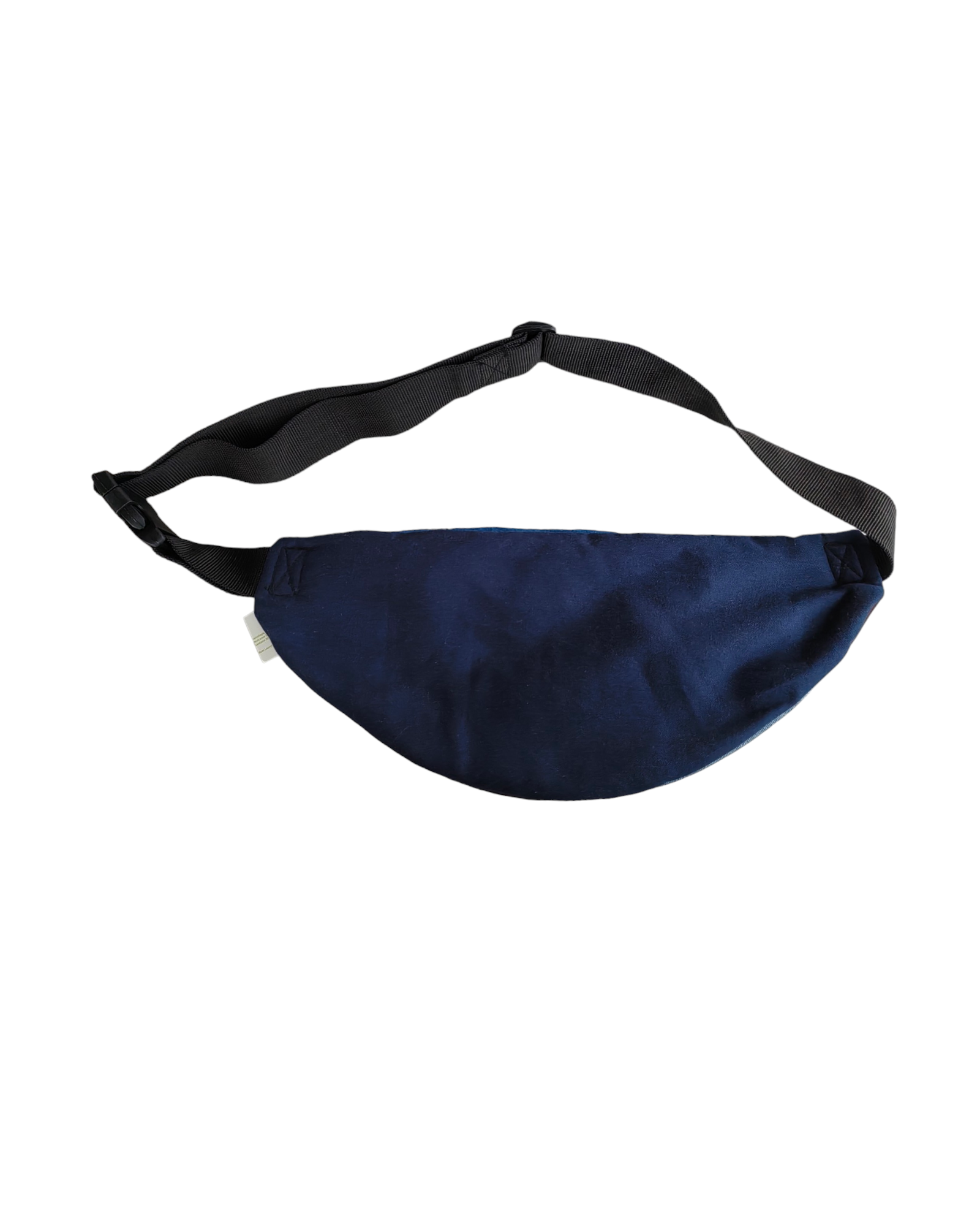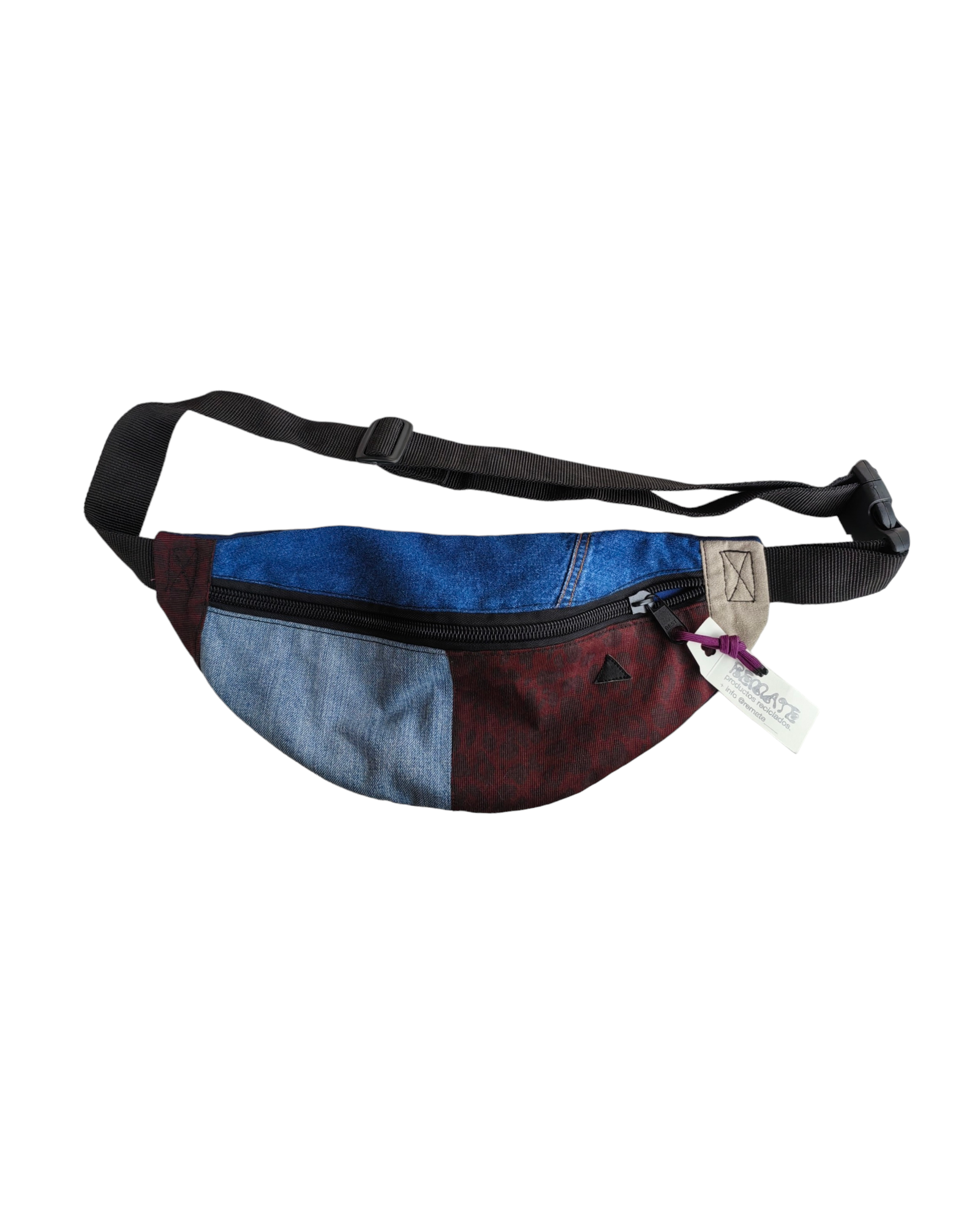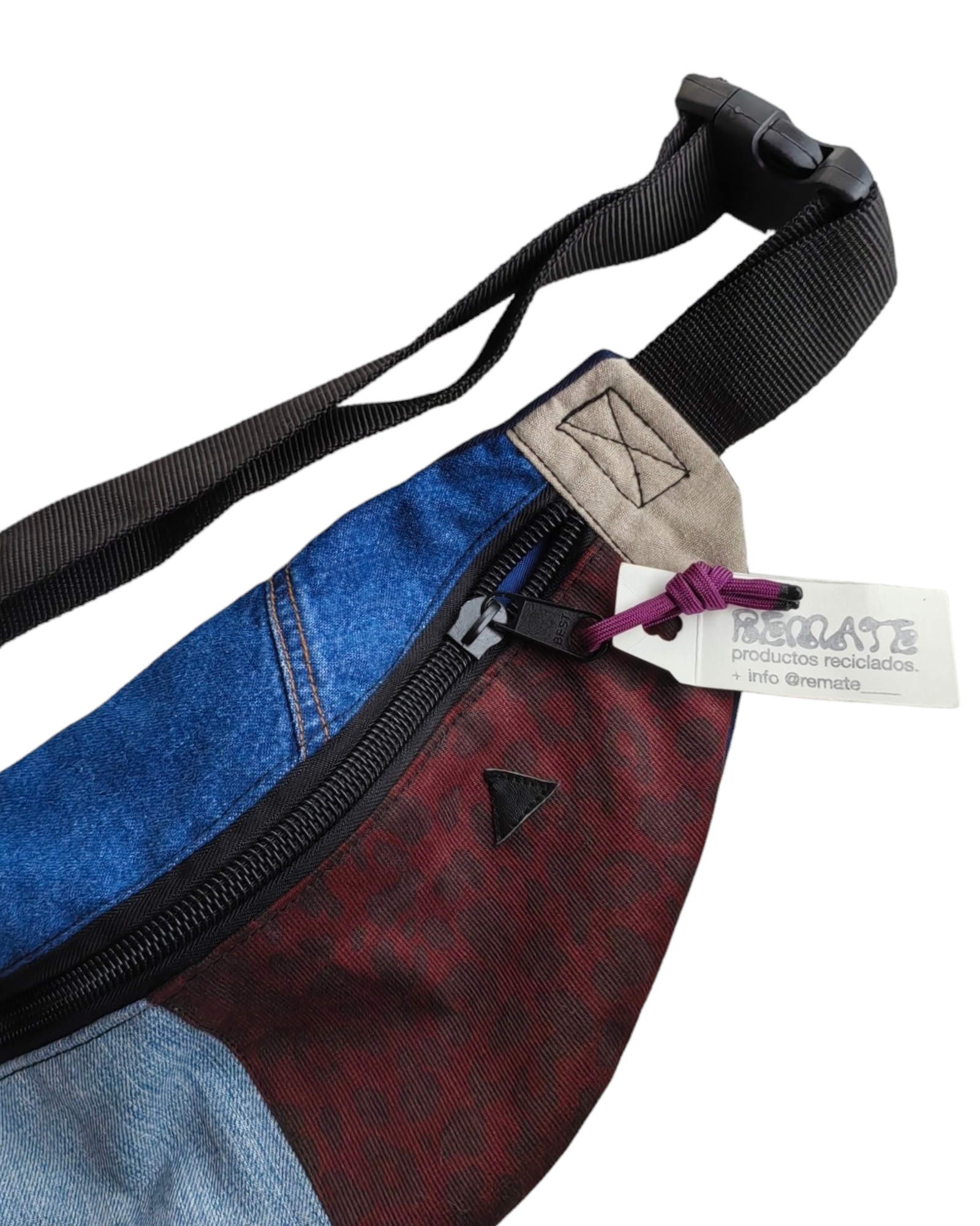 CANGURERA 3D CON PÁNELES DE MEZCLILLA AZUL MARINO, AZUL CLARO Y ESTAMPADO DE CHEETA COLOR BORGOÑA , TRIÁNGULO NEGRO DE LA MARCA. BOLSILLO INTERIOR CON CIERRE. CINTA NEGRA AJUSTABLE CON BROCHE.