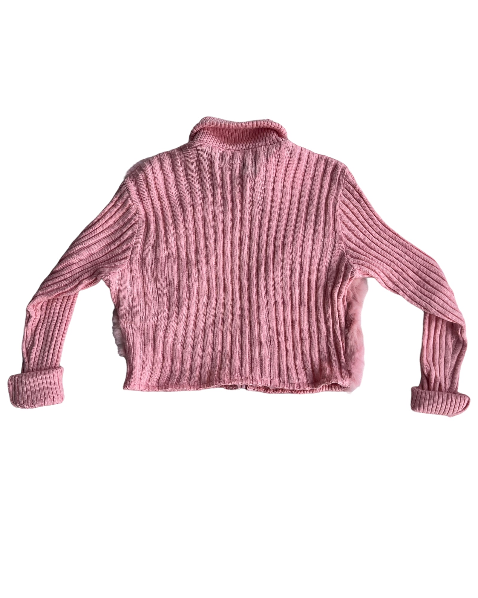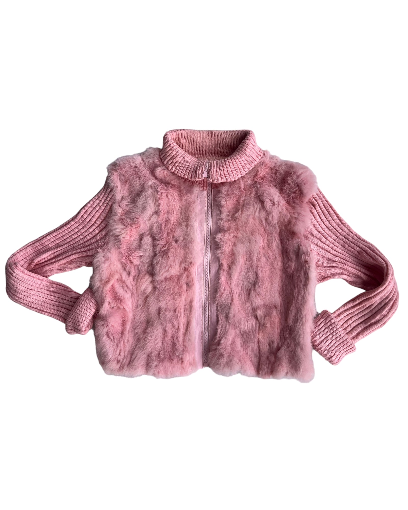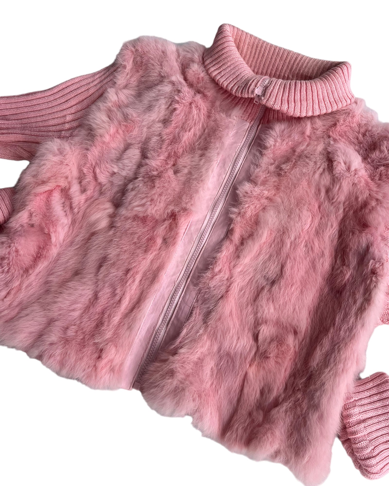 SUÉTER ROSA, TEJIDO, SIN ESTAMPADO POR DETRÁS Y AL FRENTE 100% PIEL DE CONEJO, CIERRE POR EN MEDIO, TELA 100% POLIESTER